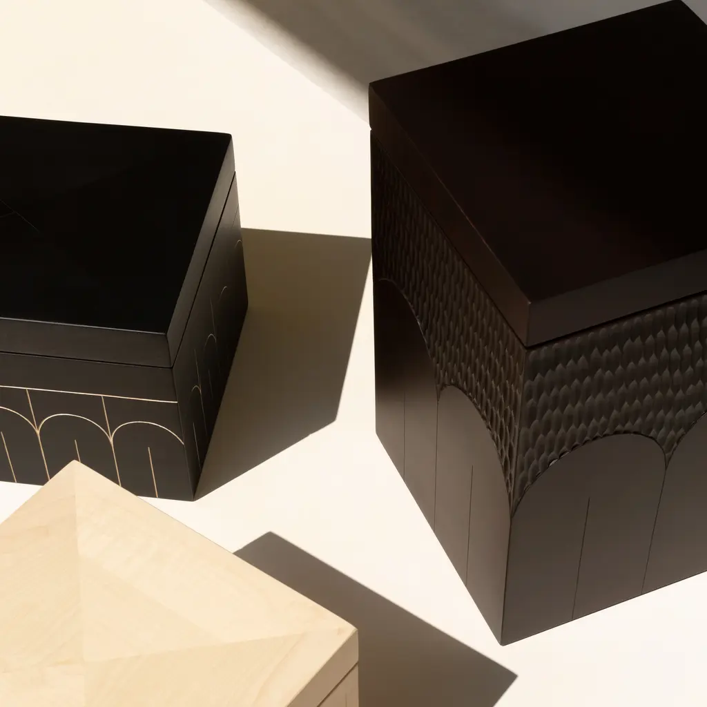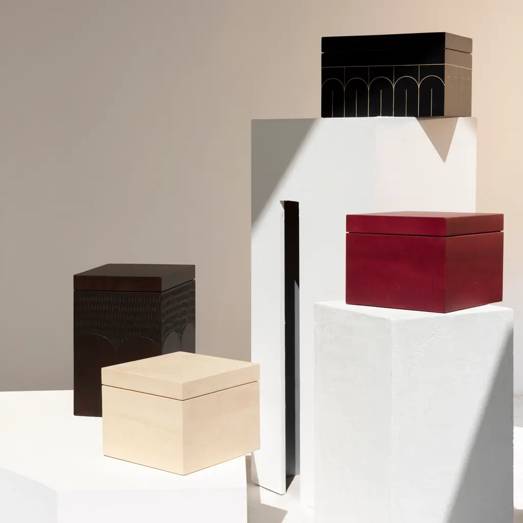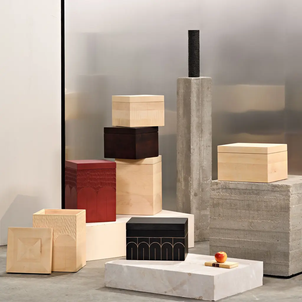 Designer Monica Förster pays homage to Constantin Brancusi and his sculptures in the quartet of small Branco Boxes, each finish with an individual hand-carved motif. Crafted in solid sustainably sourced maple, Zanat’s versatile series can be used as storage stashes on open shelves, stacked on top of each other as a sculptural element or combined with the larger sister versions.