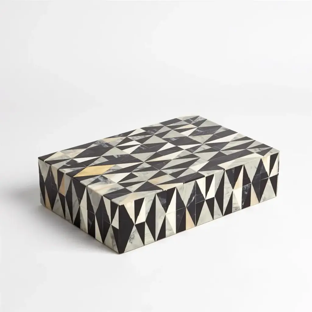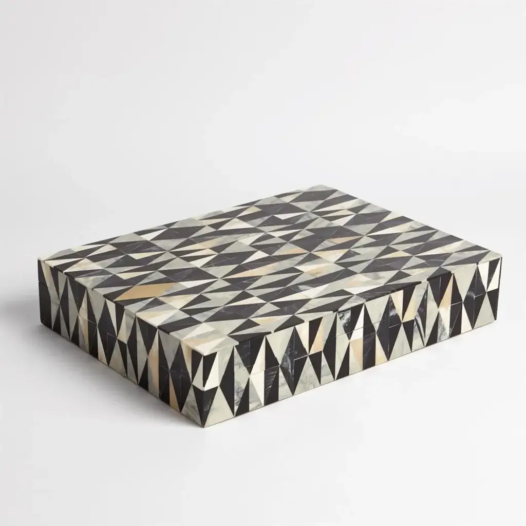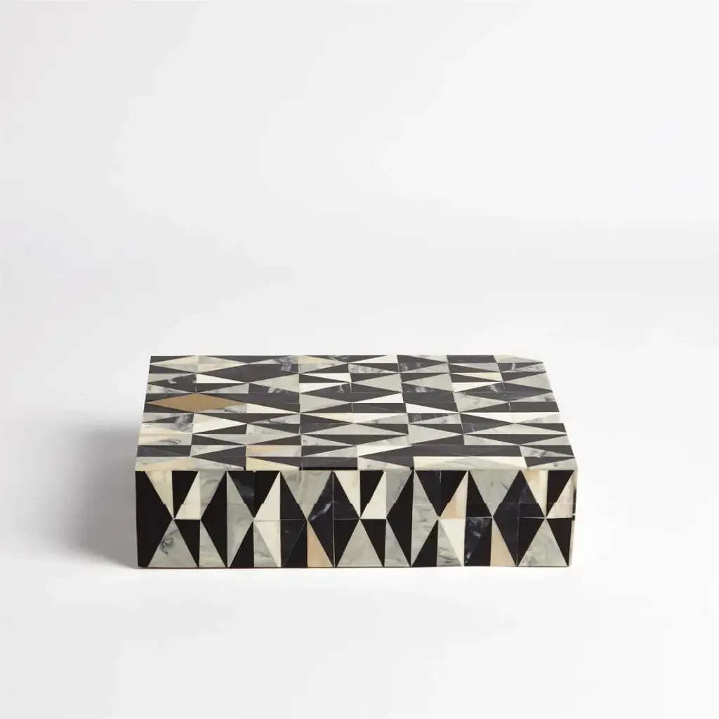 A black, white, and grey resin exterior in a geometric pattern features a singular brass diamond accent. The substrate of MDF give these items strength and stability to hold up over time without warping or movement. Available in two sizes. From a fashion forward perspective, Global Views offers accessories, furniture, statement lighting, and an assortment of rugs and mirrors to add beauty and joy to your home.