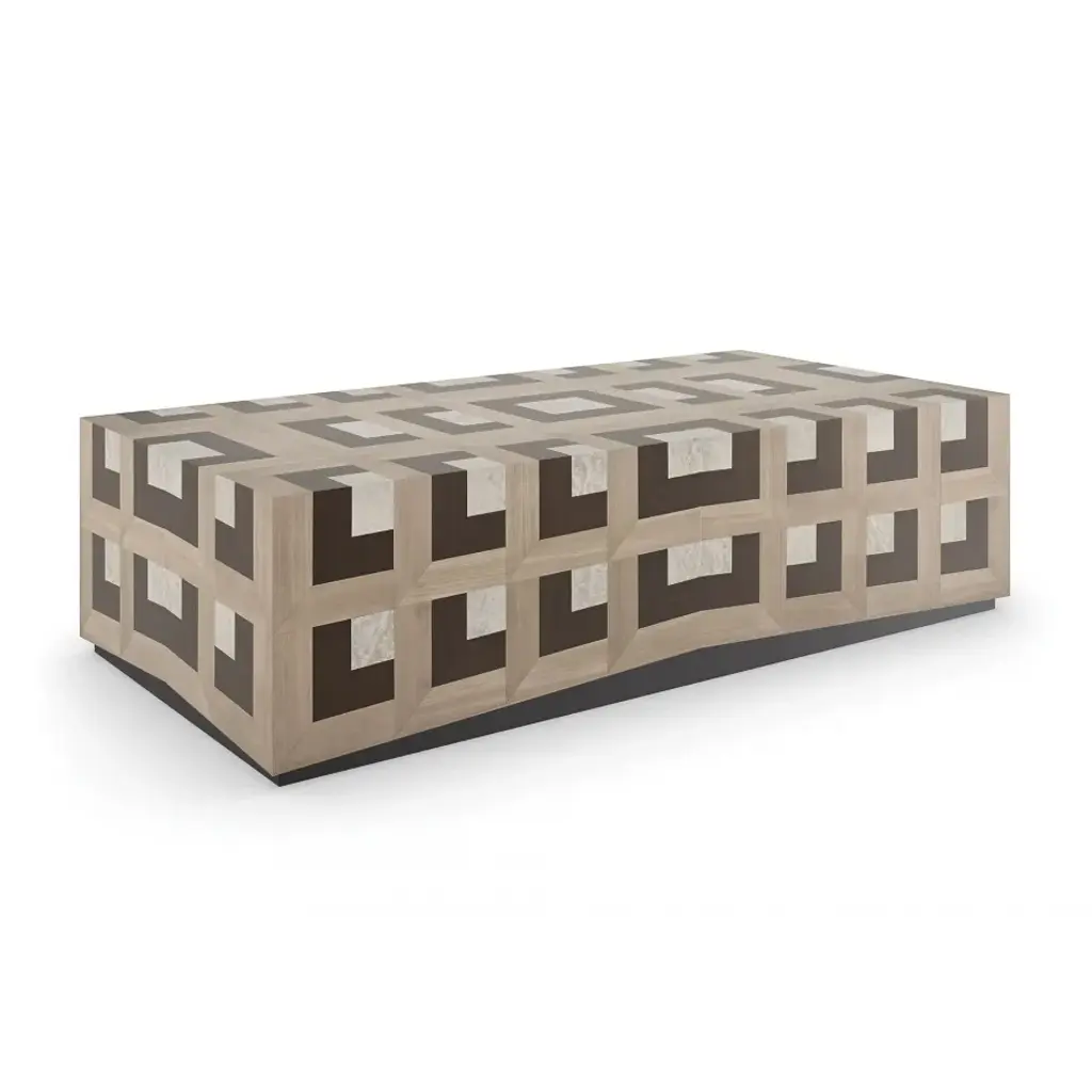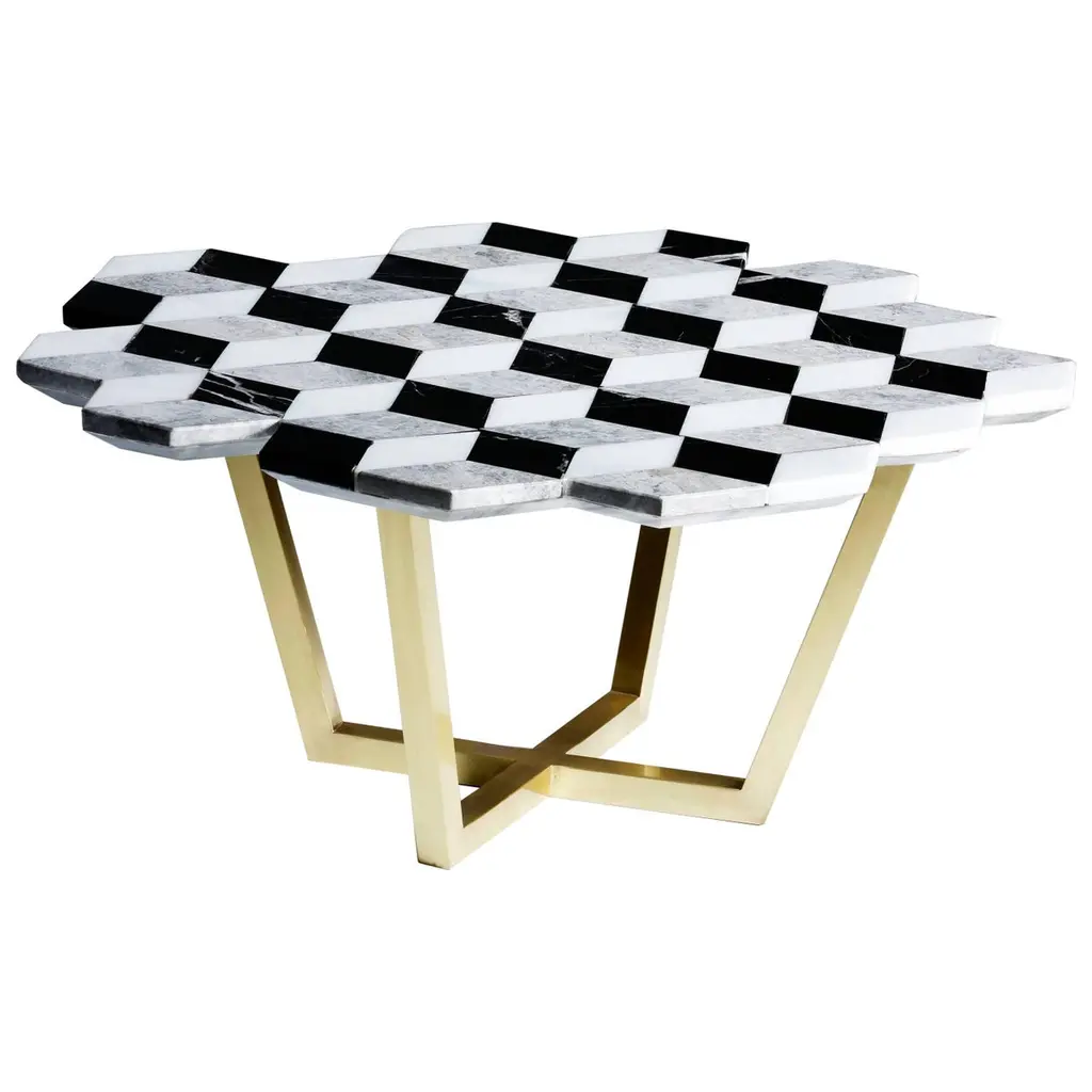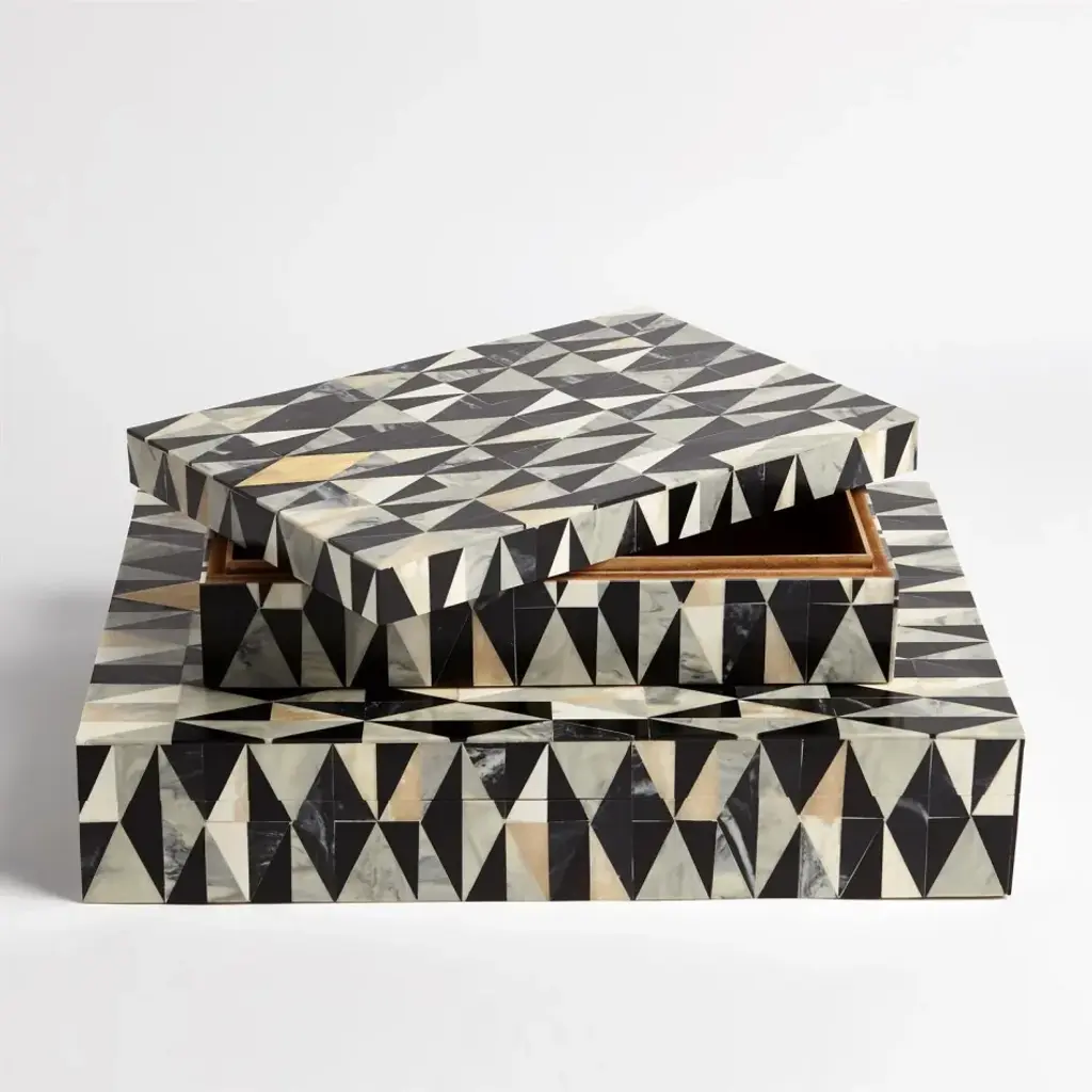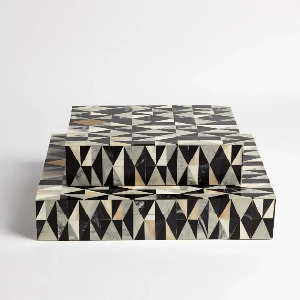 A black, white, and grey resin exterior in a geometric pattern features a singular brass diamond accent. The substrate of MDF give these items strength and stability to hold up over time without warping or movement. Available in two sizes. From a fashion forward perspective, Global Views offers accessories, furniture, statement lighting, and an assortment of rugs and mirrors to add beauty and joy to your home.