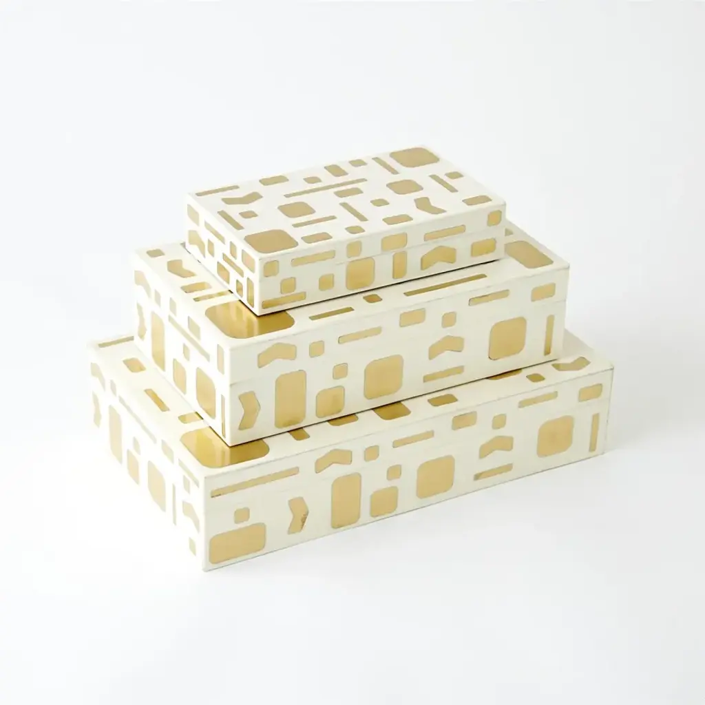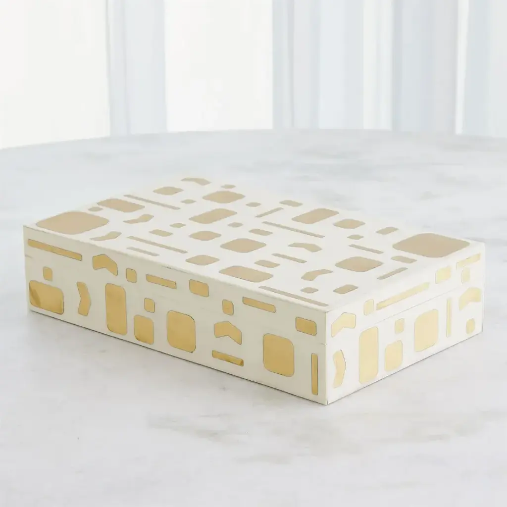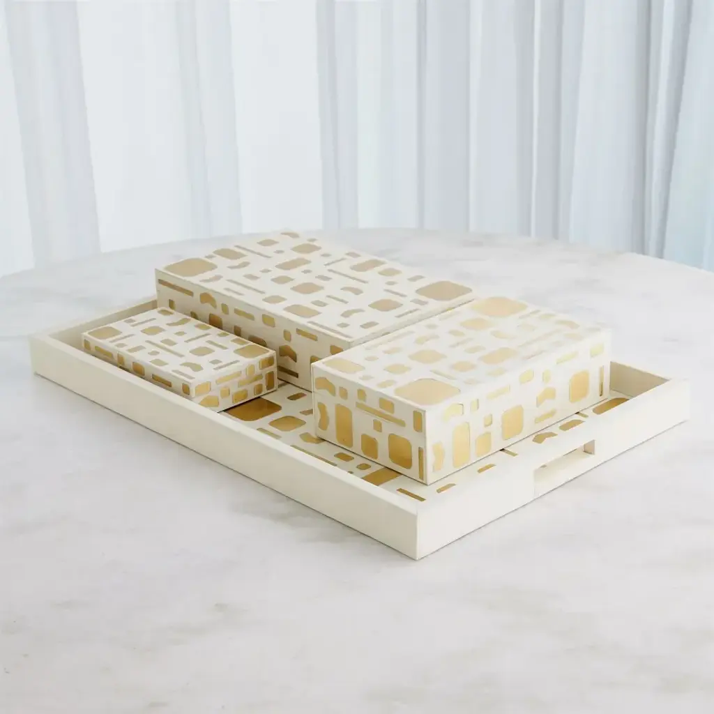 The Brass Jali Boxes and Tray not only offer practical storage solutions but also serve as stunning decor pieces. Crafted from ivory resin and adorned with brass details, they seamlessly blend elegance and functionality. From a fashion forward perspective, Global Views offers accessories, furniture, statement lighting, and an assortment of rugs and mirrors to add beauty and joy to your home.