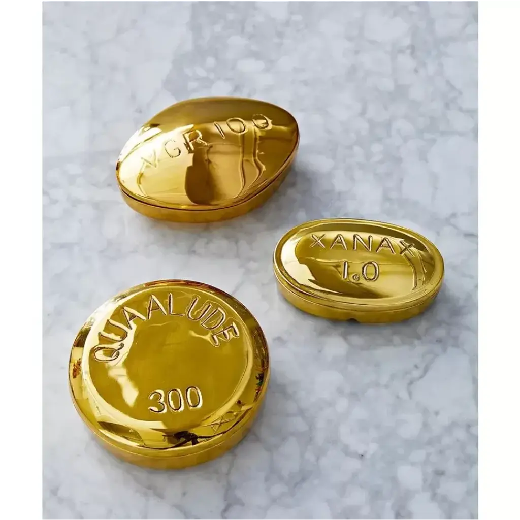 We've taken our longtime love of pharmaceuticals to a new level of luxe. Cast in solid brass, our hinged pill boxes are the perfect place to stash your stash. Each pill is laser-etched with its mg size so you can manage your dosage. The perfect provocative touch for your tablescape or hip hideaway on your bedside table. Like a fine wine or your favorite leather jacket, our brass only gets better with age. Over time, the polished brass will develop a rich natural patina. If desired, use a microfiber cloth to buff out fingerprints. If you have no patience for patina, use a brass polish.