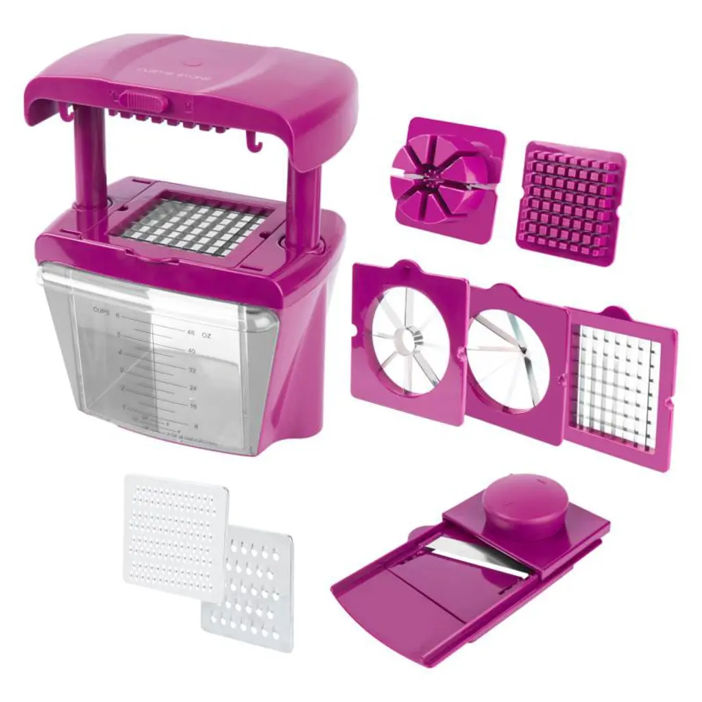 Use the Brentwood® Mandoline Slicer and Cheese Grater with 3.6-Cup Storage Container and 6 Interchangeable Stainless Steel Blades to effortlessly prep food in seconds. It includes Wave, Mandoline, Coarse Julienne, Fine, Medium, and Coarse Grater stainless steel blades. Food simply falls right into the 3.6-cup storage container. The extra-sharp blades are made from high-quality food grade stainless steel. Easy hand operation requires no power or outlets. The lightweight and portable design is ideal for home, camping, travel, and more. Easily clean between blades with the included cleaning brush. The container and lid are top-rack dishwasher safe for effortless cleanup. It's made entirely from food-safe ABS plastic._