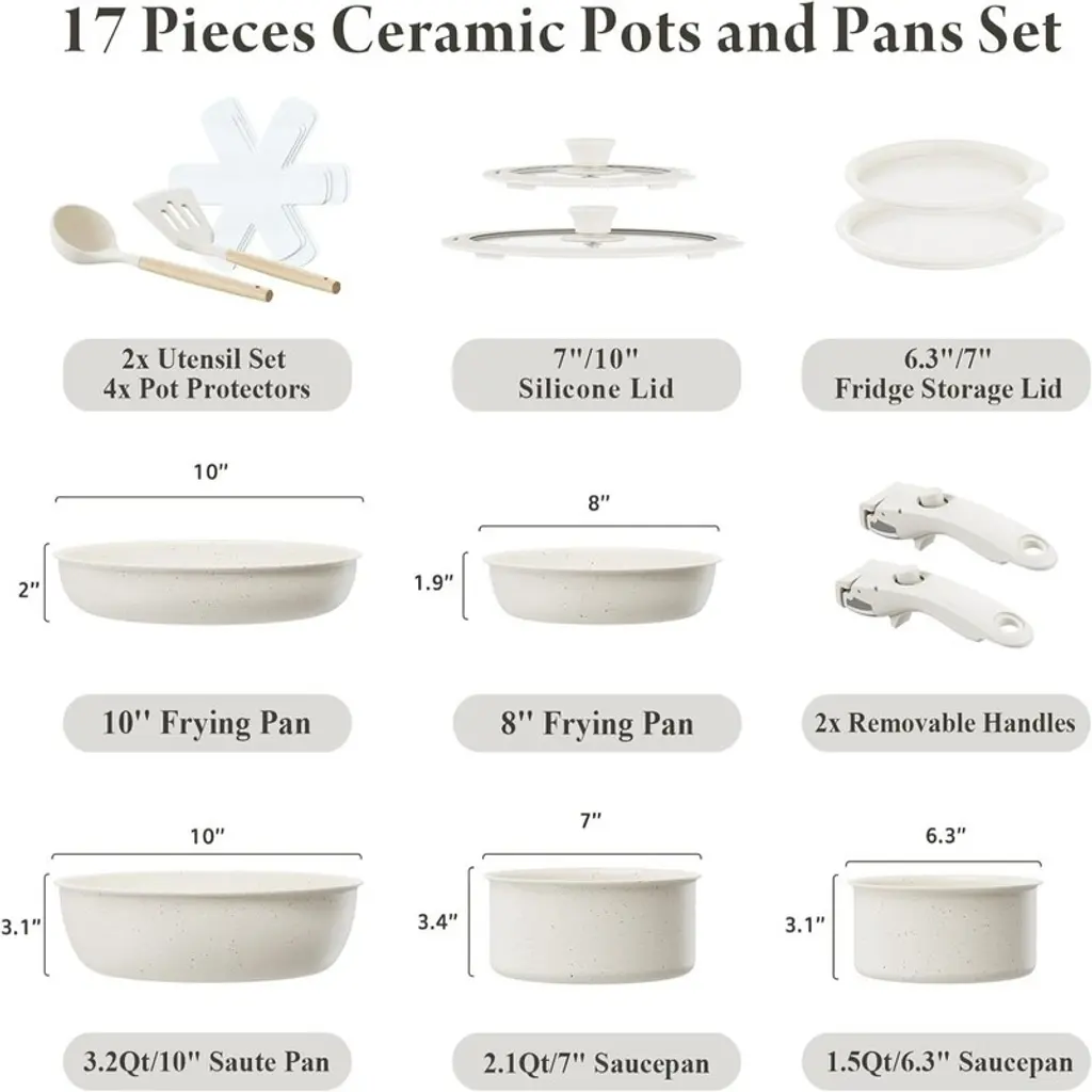 Brinjoy 17-piece Ceramic Cookware Set - Detachable Handle Non-toxic Induction Rv Kitchen Set, Cream White