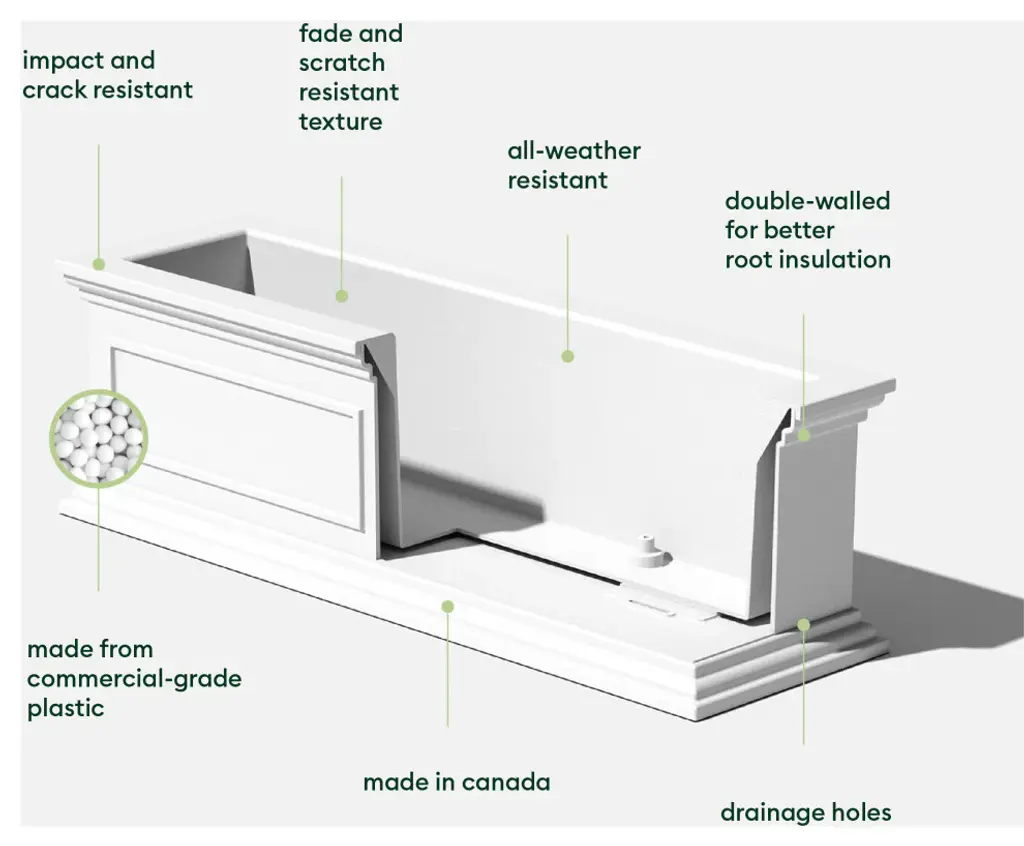 Old meets new. Taking inspiration in lush estate gardens, the Veradek Brixton Window Box Planter combines traditional design with modern technology making it best suited for windowsills or balconies. Featuring a removable insert bucket, the Brixton Window Box makes it easy to switch out plants, flowers or shrubs and pre-drilled drainage holes help prevent overwatering. This sturdy yet lightweight rectangular planter is proudly crafted in Canada from high-grade recycled plastic, making it resistant to cracks, fading and UV and allowing it to withstand extreme temperatures ranging from -20 to +120 degrees. With the perfect balance of design, structure and purpose, the Brixton Window Box adds the finishing touches to any indoor or outdoor space.