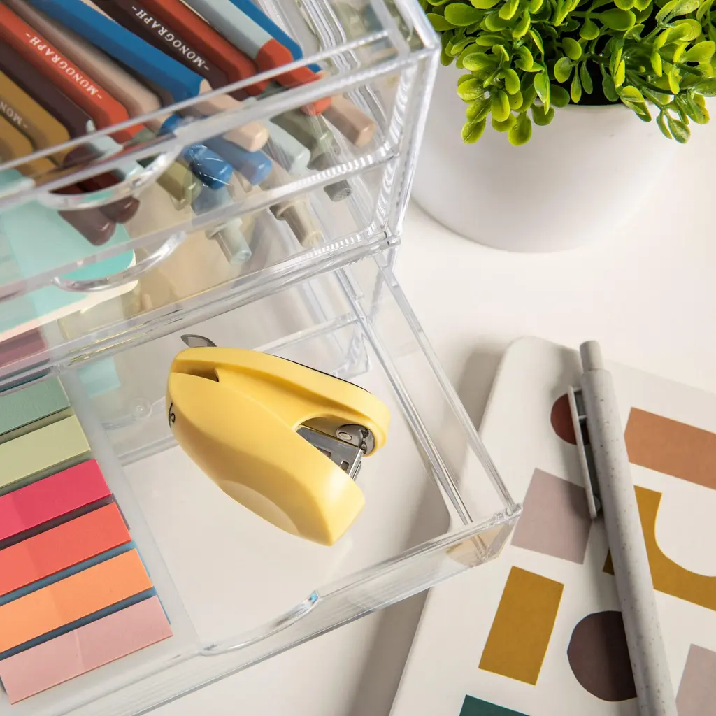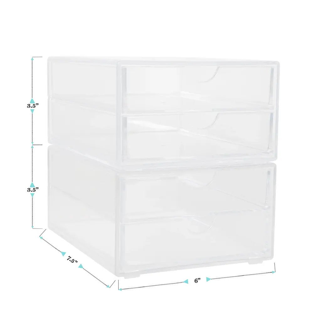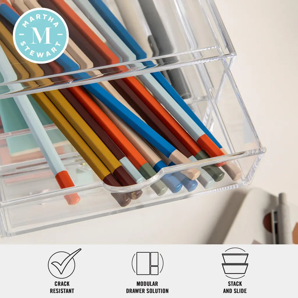Organize a multitude of supplies and accessories with this Set of 2 Martha Stewart Brody Organizer Boxes with Two Drawers and keep all of your surfaces clutter-free. Premium BPA-free and crack-resistant plastic holds up well in almost any environment from your desktop to your bathroom vanity for many years of use. The removable drawers are accented with a half-moon cutout for easy opening and closing while the crystal clear housings make locating your items effortless. The stackable design enables you to use vertical instead of horizontal real estate, which makes this storage drawer set a great space-saver. Lower grooves lock in place for stability and non-skid feet ensure the boxes stay in your desired location to maintain a neat and tidy appearance.
