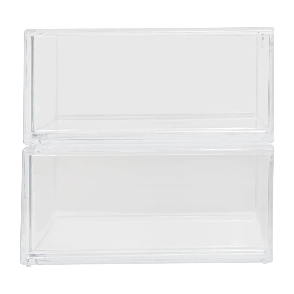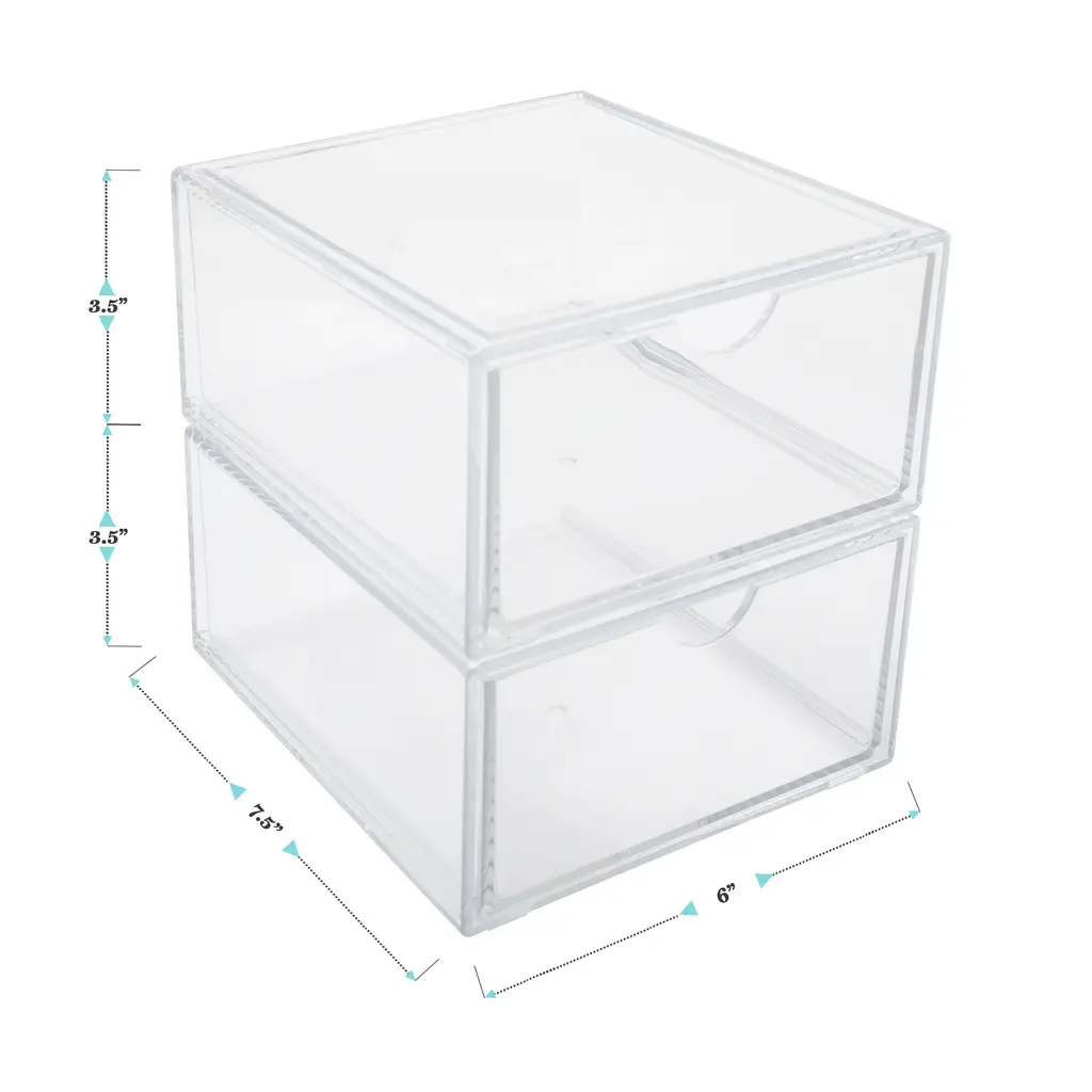 Organize a multitude of supplies and accessories with this Set of 2 Martha Stewart Brody Organizer Boxes with Drawers and keep all of your surfaces clutter-free. Premium BPA-free and crack-resistant plastic holds up well in almost any environment from your desktop to your bathroom vanity for many years of use. The removable drawers are accented with a half-moon cutout for easy opening and closing while the crystal clear housings make locating your items effortless. The stackable design enables you to use vertical instead of horizontal real estate, which makes this storage drawer set a great space-saver. Lower grooves lock in place for stability and non-skid feet ensure the boxes stay in your desired location to maintain a neat and tidy appearance.
