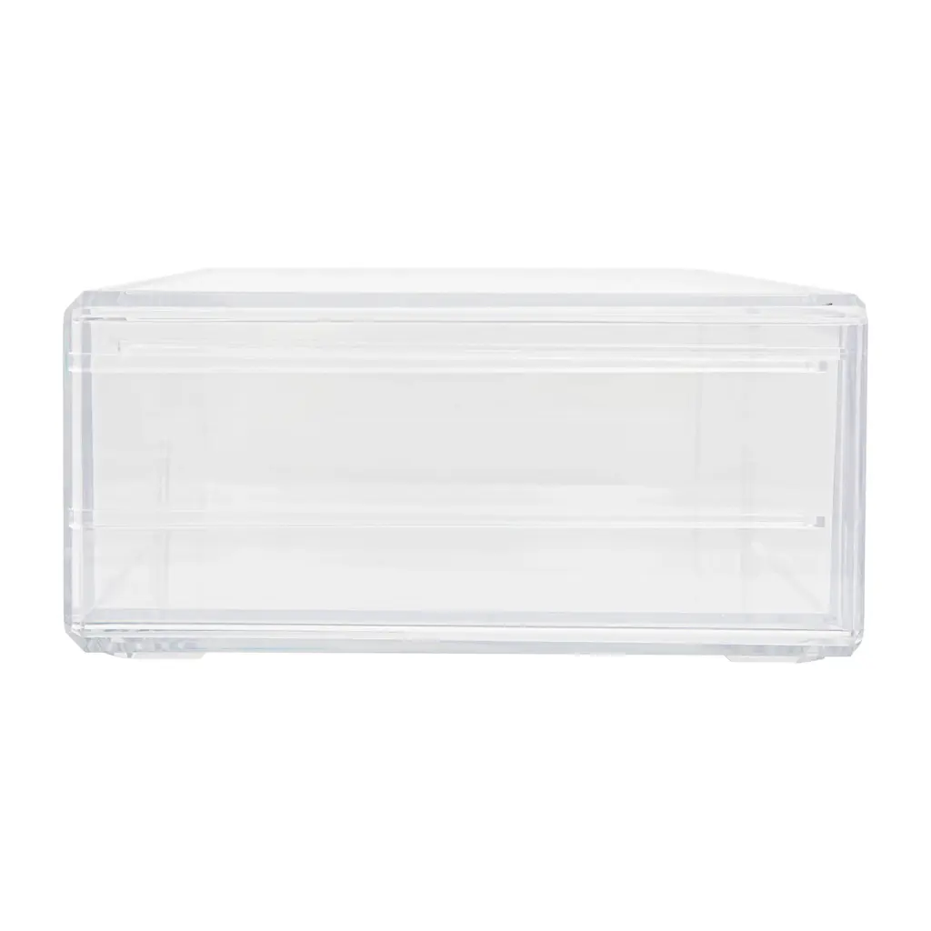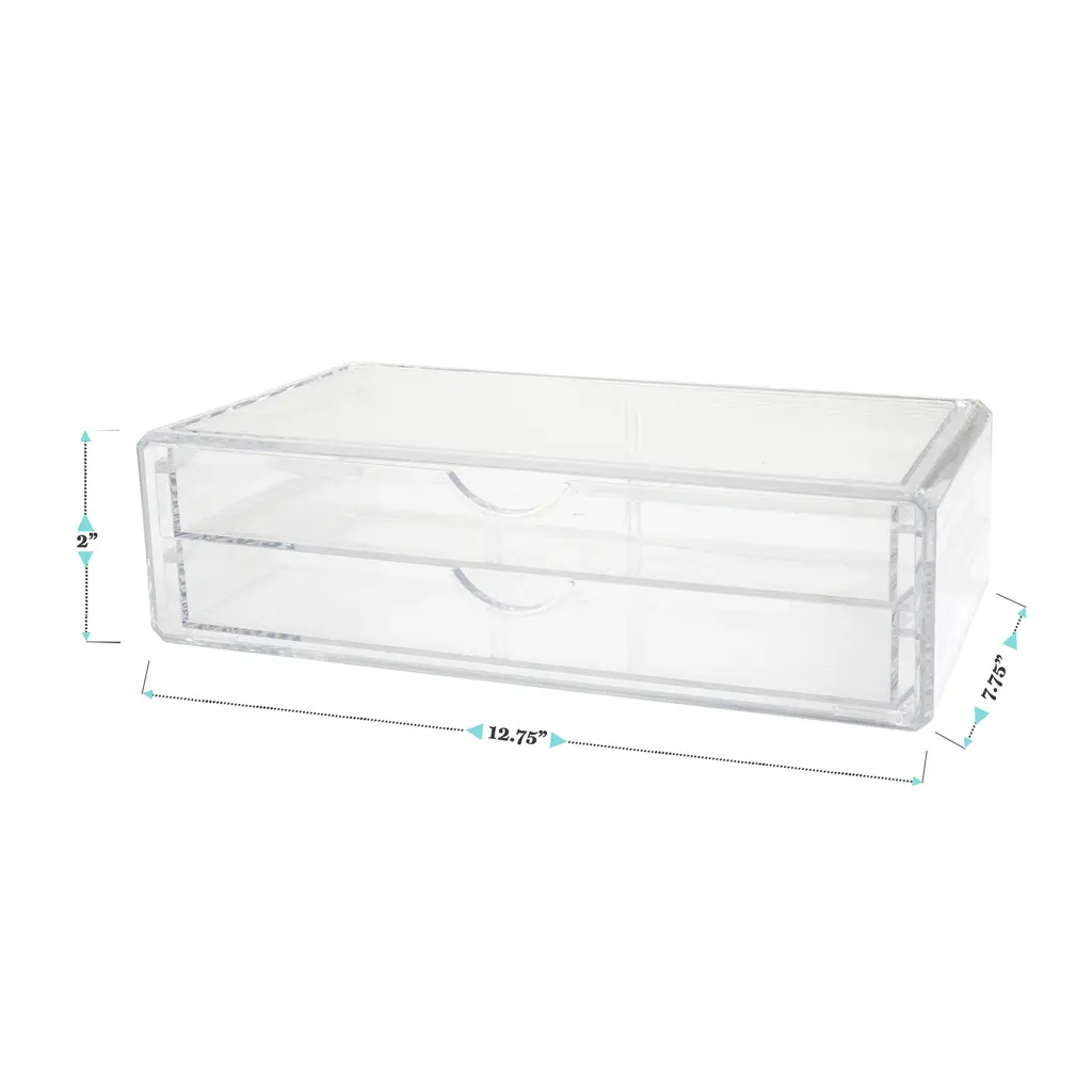 Organize a multitude of supplies and accessories with the Martha Stewart Brody Organizer Box with Two Pullout Drawers and keep all of your surfaces clutter-free. Premium BPA-free and crack-resistant plastic holds up well in almost any environment from your desktop to your bathroom vanity for many years of use. The removable drawers are accented with a half-moon cutout allowing for easy opening and closing while the crystal clear housing makes locating your items effortless. The stackable design enables you to use vertical instead of horizontal real estate, which makes this storage drawer a great space-saver. Lower grooves lock in place for stability and non-skid feet ensure the box stays in your desired location to maintain a neat and tidy appearance.