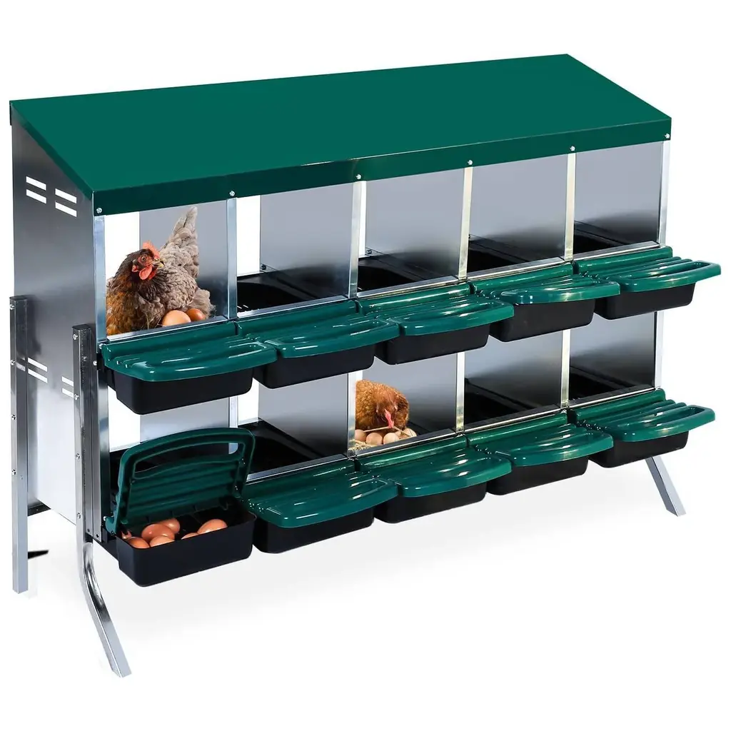 Keep your hens safe and comfortable as they produce plenty of eggs thanks to the 2-Pack Brower Galvanized Steel 4 Hole 20 Bird Poultry Nest Chicken Brooding Box. This pack of 2 poultry laying boxes is made from durable galvanized steel with folded edges for safety and a slanted roof to help keep your cluckers safe from the elements. The 4 bays provide room for up to 20 brooding hens and feature side ventilation holes for airflow. Stagger the nests back-to-back to prevent the hens from having full mobility if necessary. The outdoor hen house features double-bolted perches with hinged that allow them to be folded back easily as desired. Assembly and installation are made quick and easy with the included instructions. Setup takes under an hour and only requires a screwdriver and wrench; no rivet gun is necessary. Treat your hens to a happy home while during their egg-laying period with the 2-Pack Brower Galvanized Steel 4 Hole 20 Bird Poultry Nest Chicken Brooding Box.