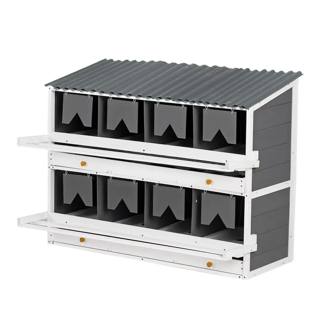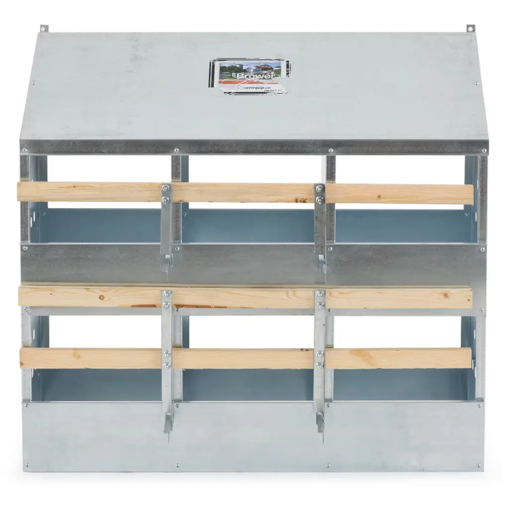 Keep your hens safe and comfortable as they produce plenty of eggs thanks to the 2-Pack Brower Galvanized Steel 6 Hole 30 Bird Poultry Nest Chicken Brooding Box. This pack of 2 poultry laying boxes is made from durable galvanized steel with folded edges for safety and a slanted roof to help keep your cluckers safe from the elements. The 6 bays provide room for up to 30 brooding hens and feature side ventilation holes for airflow. Stagger the nests back-to-back to prevent the hens from having full mobility if necessary. The outdoor hen house features double-bolted perches with hinged that allow them to be folded back easily as desired. Assembly and installation are made quick and easy with the included instructions. Setup takes under an hour and only requires a screwdriver and wrench; no rivet gun is necessary. Treat your hens to a happy home while during their egg-laying period with the 2-Pack Brower Galvanized Steel 6 Hole 30 Bird Poultry Nest Chicken Brooding Box.