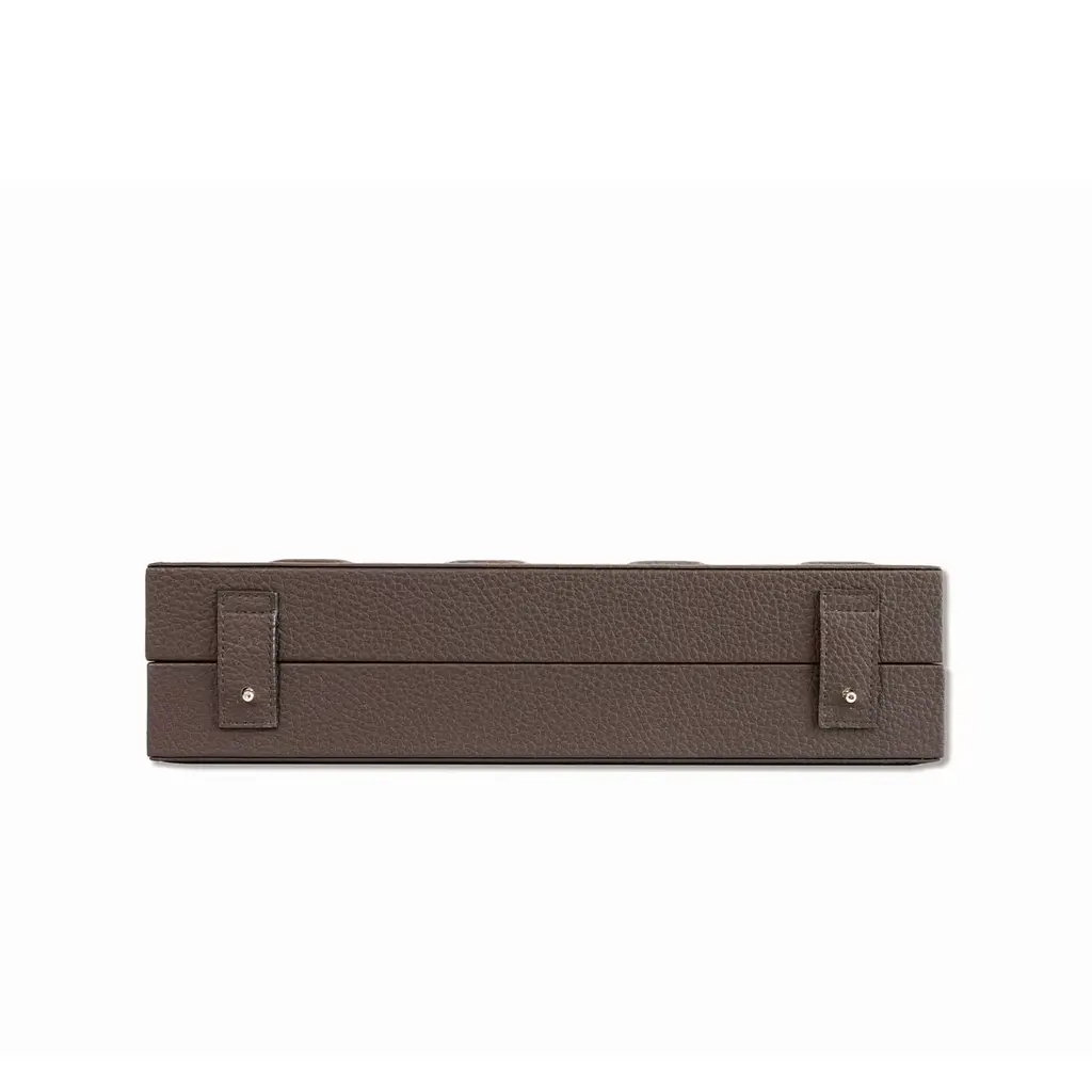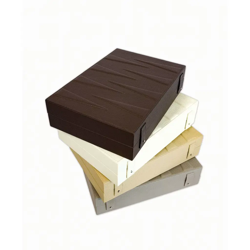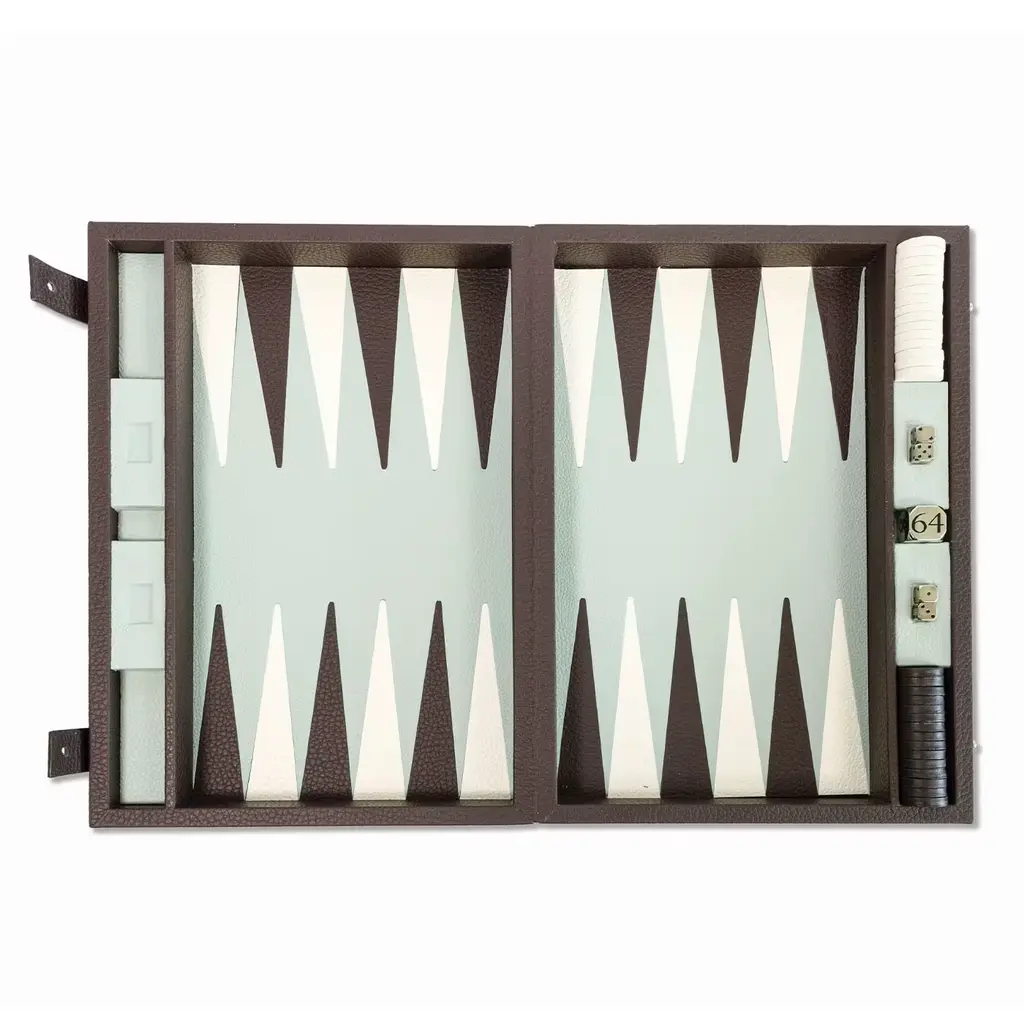 Wooden handmade backgammon game dressed in fine and soft genuine leather with brass dice in palladium plating. Available in different colors. Please, ask the Concierge for further details.