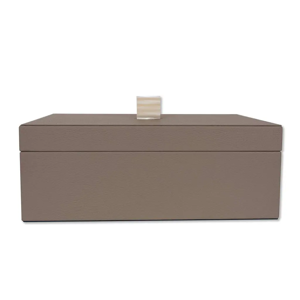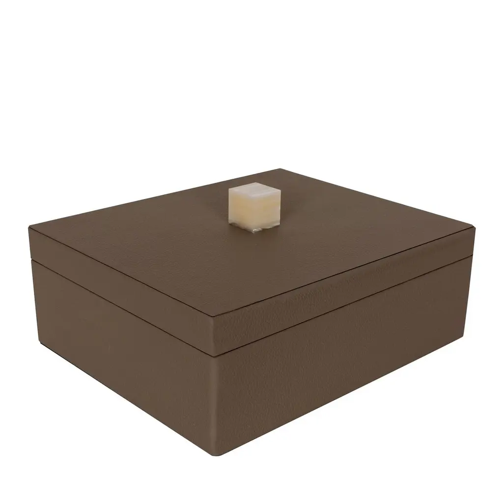 Versatile and sophisticated, this elegant box is a precious addition to any modern or contemporary home. Crafted of wood, its rectangular silhouette and lid are covered by hand with brown fine grain leather. Available in five different colors, this piece features a jewel-like handle at the top made of Plexiglas with a finish that resembles mother-of-pearl for a charming final effect. Either used in a powder room or bedroom, this piece will be eye-catching and refined.