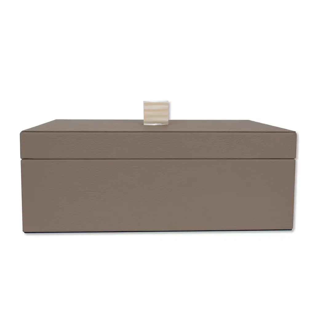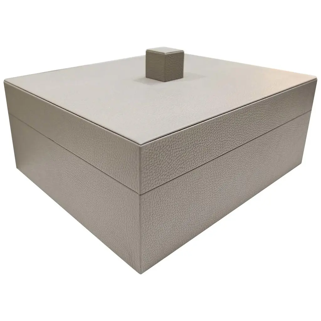 Versatile and sophisticated, this elegant box is a precious addition to any modern or contemporary home. Crafted of wood, its rectangular silhouette and lid are covered by hand with brown fine grain leather. Available in five different colors, this piece features a jewel-like handle at the top made of Plexiglas with a finish that resembles mother-of-pearl for a charming final effect. Either used in a powder room or bedroom, this piece will be eye-catching and refined.