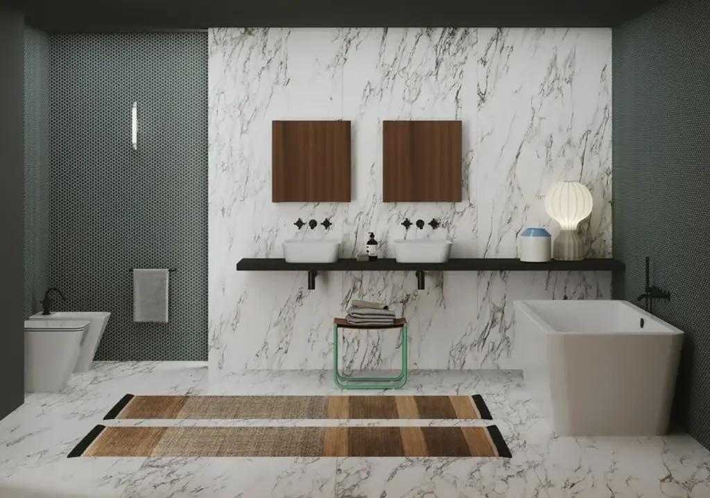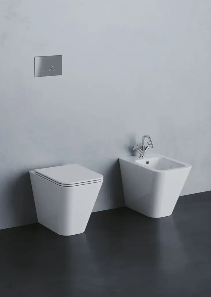 Build is a floor mounted ceramic bidet. Build is inspired by the purity and clean lines of Nordic design. It consists of floor-mounted and wall-hung sanitary ware, an elegant freestanding bathtub and various models of the washbasin with wooden units. The toilets feature the Easy Clean and Water saving system, patented technology, which allows a complete single flush of 3 litres instead of 9 litres required for a standard flush. Build consists of storage containers available in elm with a white, natural or cement finish. Certified anti-bacterial treatment is available on request for all ceramic products.