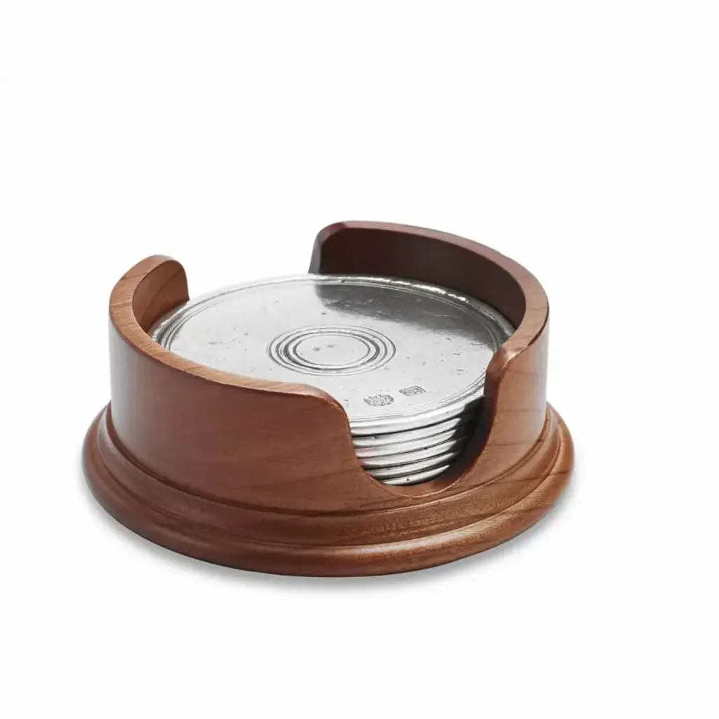 Our Burl Veneer Coaster Set stylishly protects your tables and countertops from pesky drips or condensation. 6 handcrafted Burl Veneer coasters fit inside their matching Burl Veneer open box container.