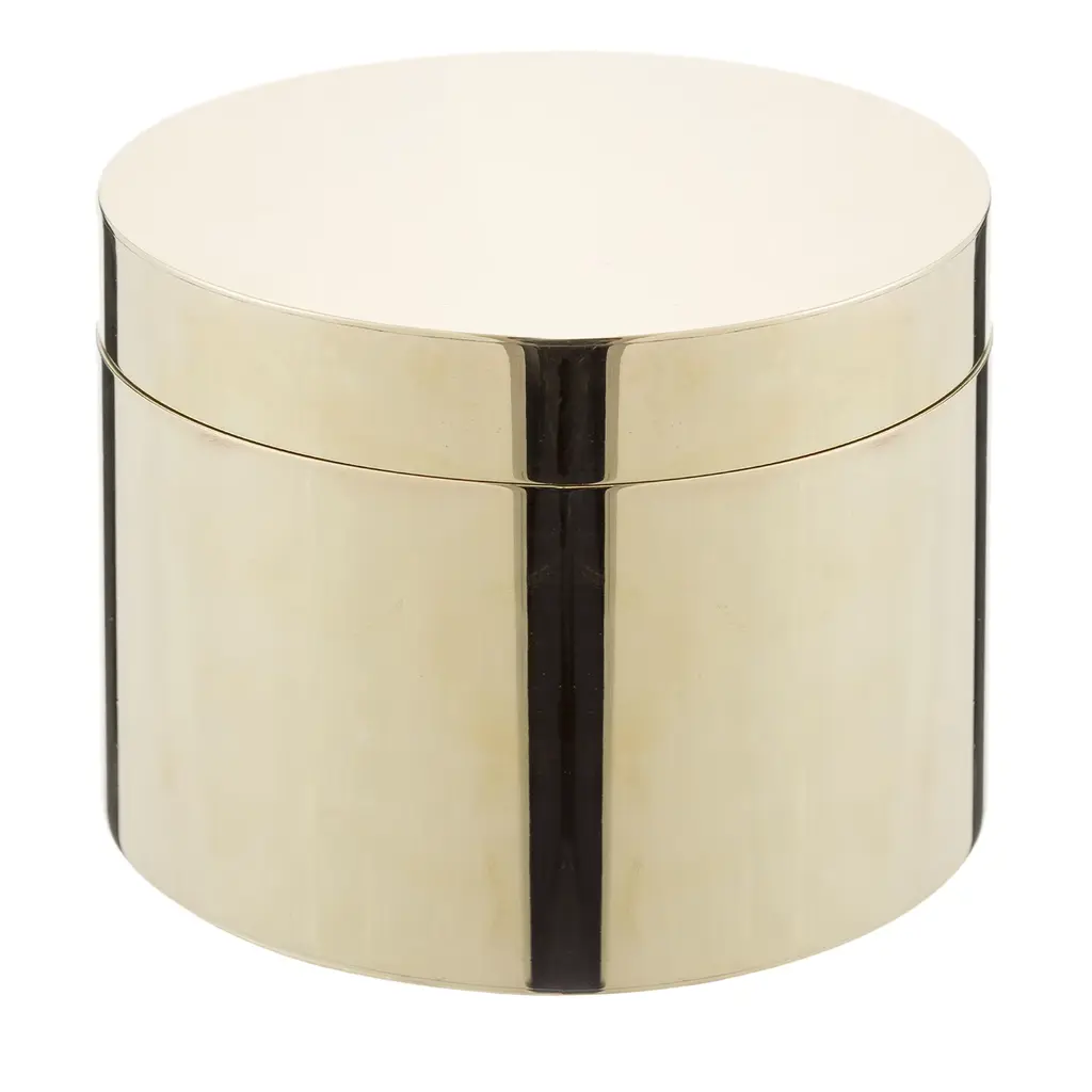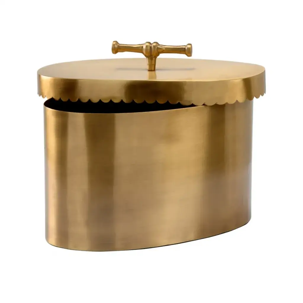 BUTTERCUP BRASS BOX, FROM THE CHERYL LUCKETT COLLECTION FOR WILDWOOD, EXUDES SOUTHERN CHARM WITH ITS GRACEFUL SCALLOPED EDGE AND WARM ANTIQUE BRASS FINISH. A BAMBOO INSPIRED HANDLE AND REMOVABLE LID ALLOW ACCESS FOR STORAGE.