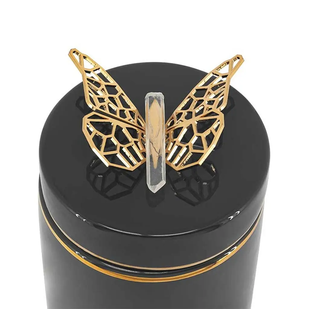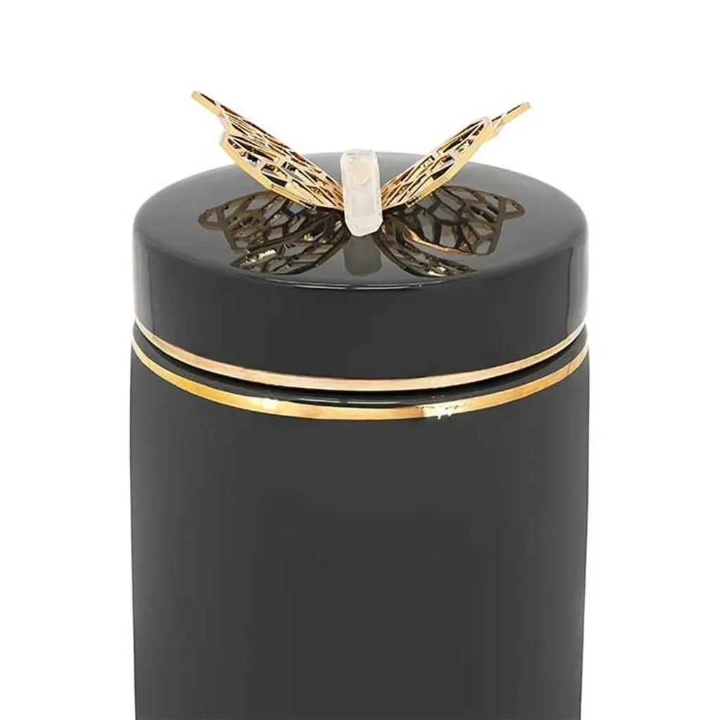 Box butterfly in glazed ceramic in blackfinish. With white glazed ceramic at thebottom with gilded trim. Box with lid withpolished brass butterfly on lid's top.
