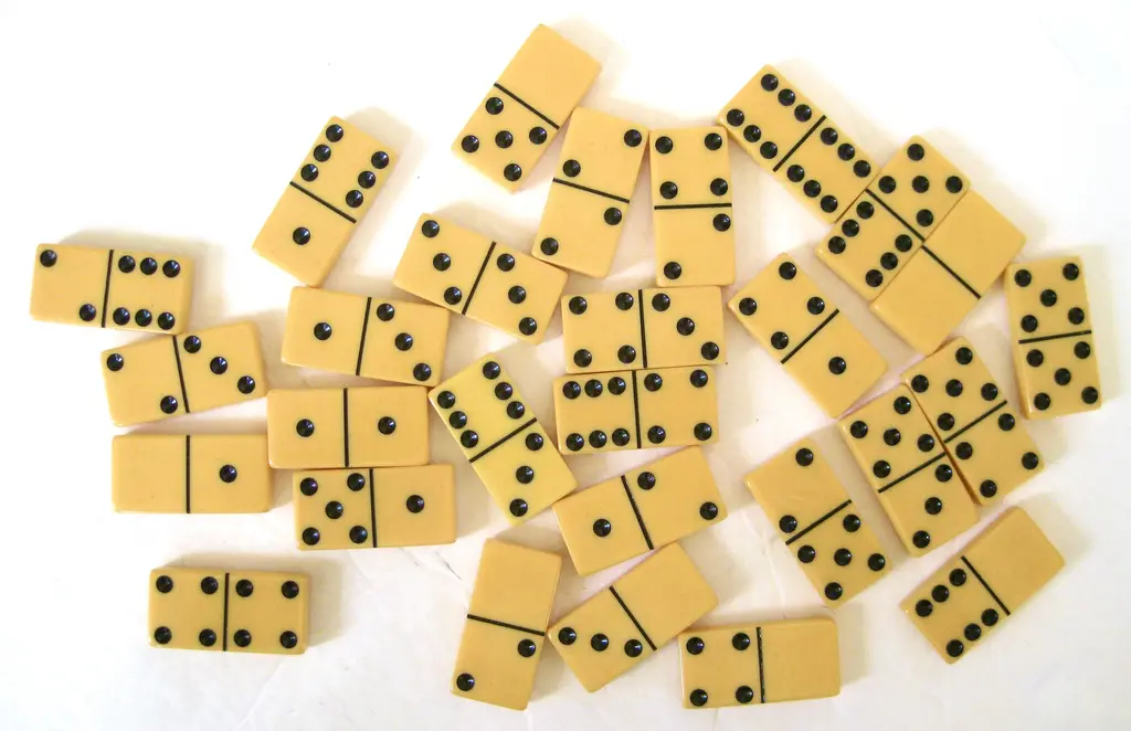 Mid-century domino set in its original timeworn box. Rich butterscotch color. Made by the Puremco Manufacturing Company of Waco, Texas.