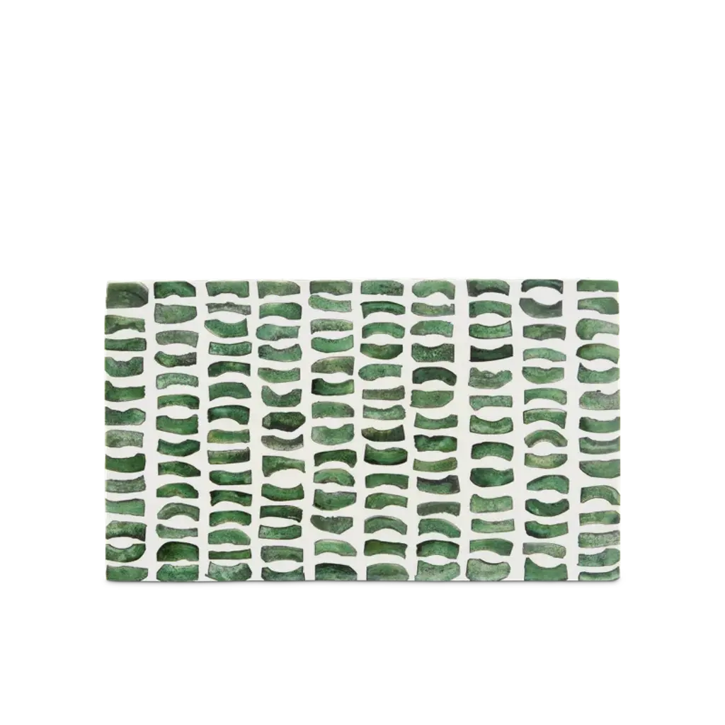 The mix of deep gray irregularly shaped pieces of bone set into crisp white composite brings the box set a painterly surface. The pattern on the small and large gray decorative boxes, which reads to the eye like nave brushstrokes, makes this a bold addition to a vignette on any table, and the exquisite construction makes them beautiful desk accessories.