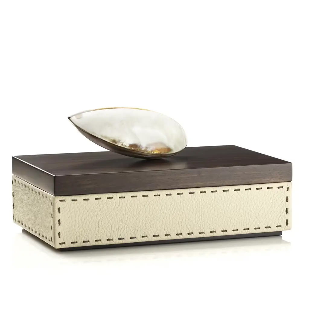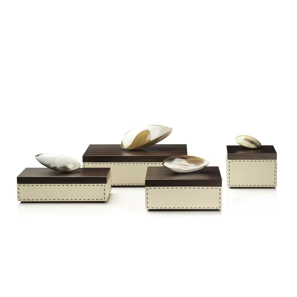 Rectangular box in Aida pebbled leather, Ice-cream colour with handmade dark brown stitching. Lid in matte Amara ebony veneer with a sculptural horn handle. Please, contact the Concierge for further information.