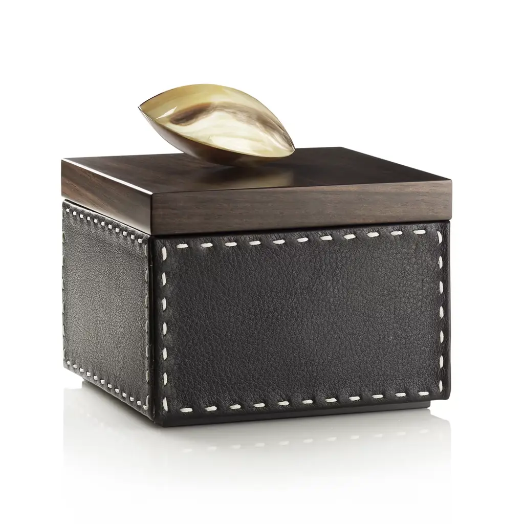 Square box in Aida pebbled leather, Onyx color with handmade ivory stitching. Lid in matte Amara ebony veneer with a sculptural horn handle. Please, contact the Concierge for further information.