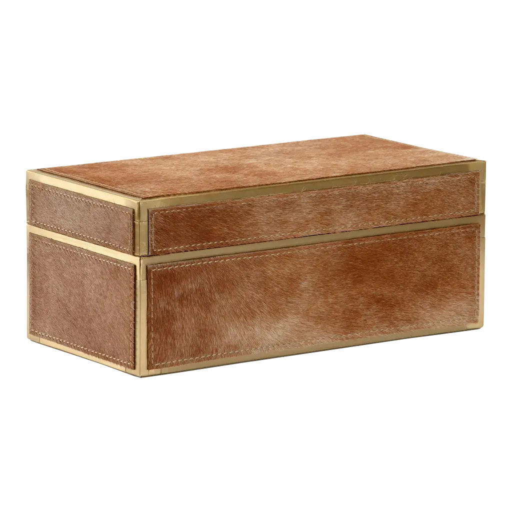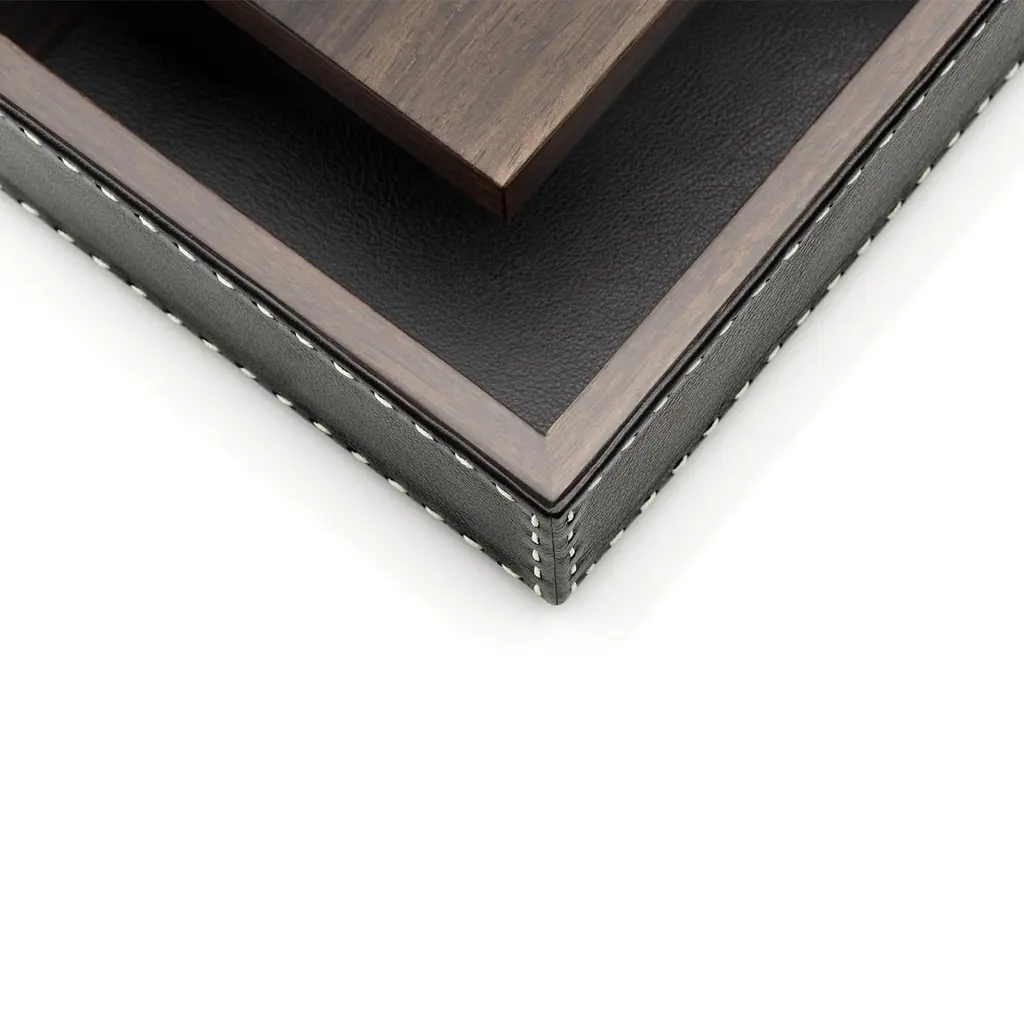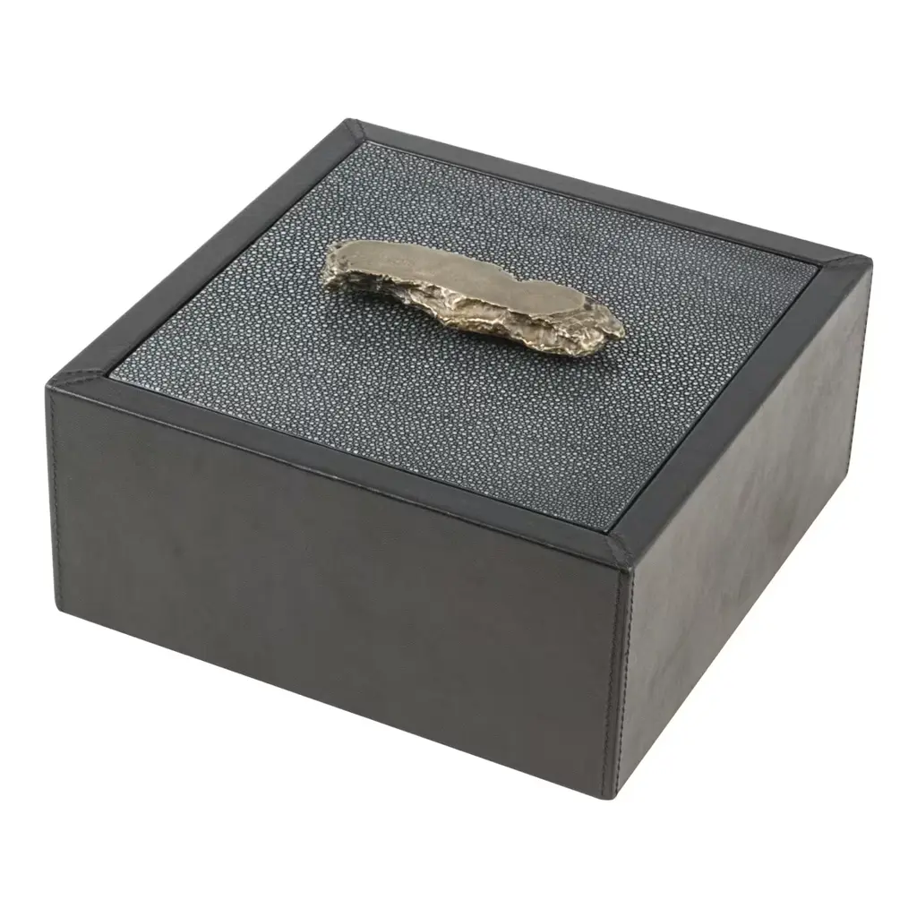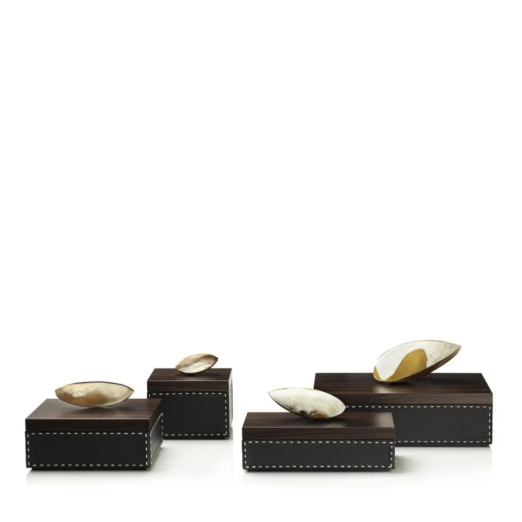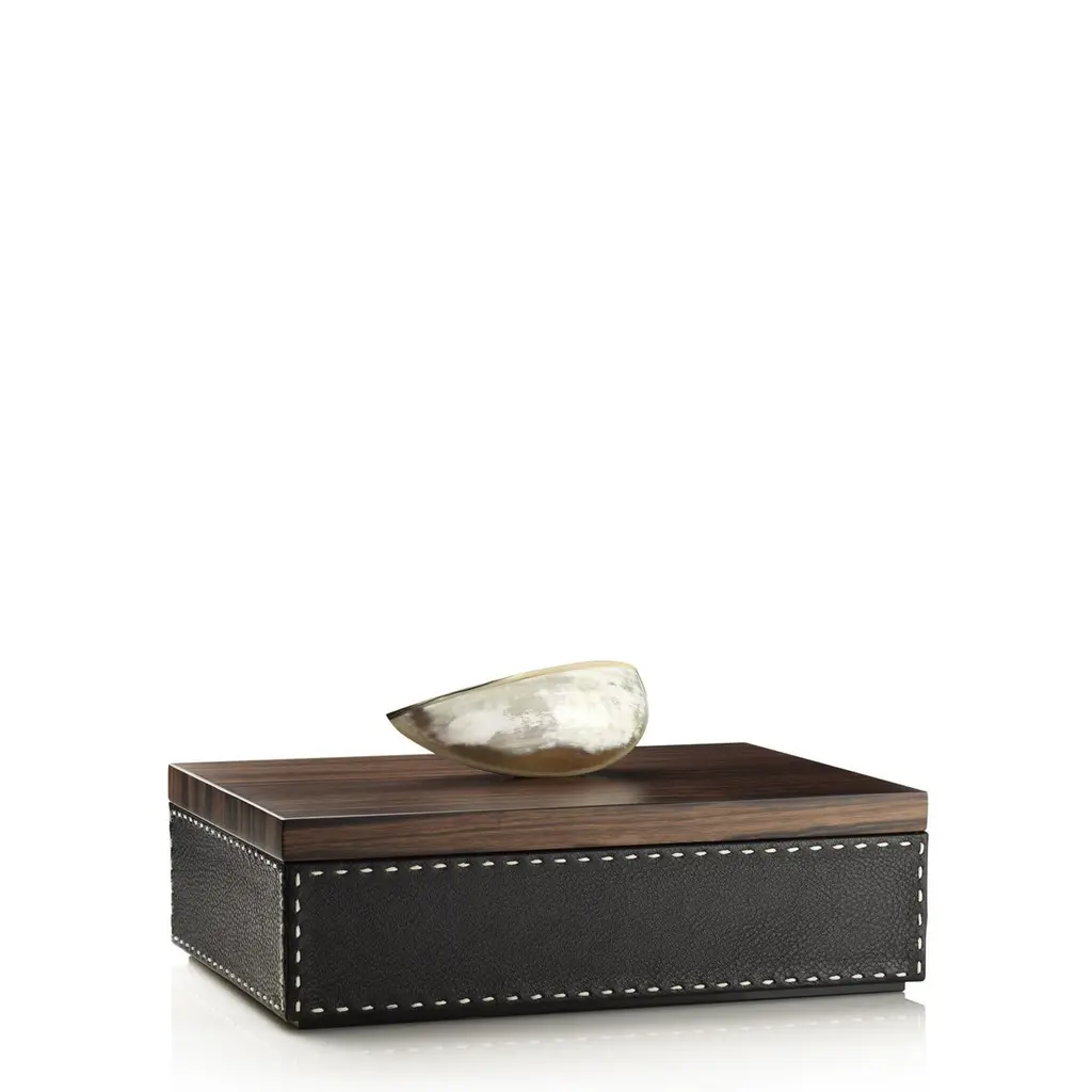 Befitting of all decor, the Capricia rectangular box will be a unique addition to your vanity station or to any other place in your home and office. Clad in Aida pebbled leather in a natural Onyx colour, Capricia sports a cream-colored handmade stitching. The lid in matte Amara ebony veneer is topped with a sculptural knob in Corno Italiano. Hand-shaped to resemble the hulls cutting through waves, the knob is an elegant blend of convex and flat lines elevating the natural textures of Corno Italiano. The interior benefits from a lining in the same leather to safely store your most precious objects. This design is also proposed in Ice-cream colour leather with dark brown stitching and it’s available in two different dimensions. mod. 4478: cm 28 x 20 x H cm 14mod. 4477: cm 22 x 13 x H cm 12Note: Colors and shades of Corno Italiano processed by our Company are unique and due to the natural origin of raw material. For this reason Corno Italiano tones that can be seen in pictures are indicative and can not be reproduced in finished products.