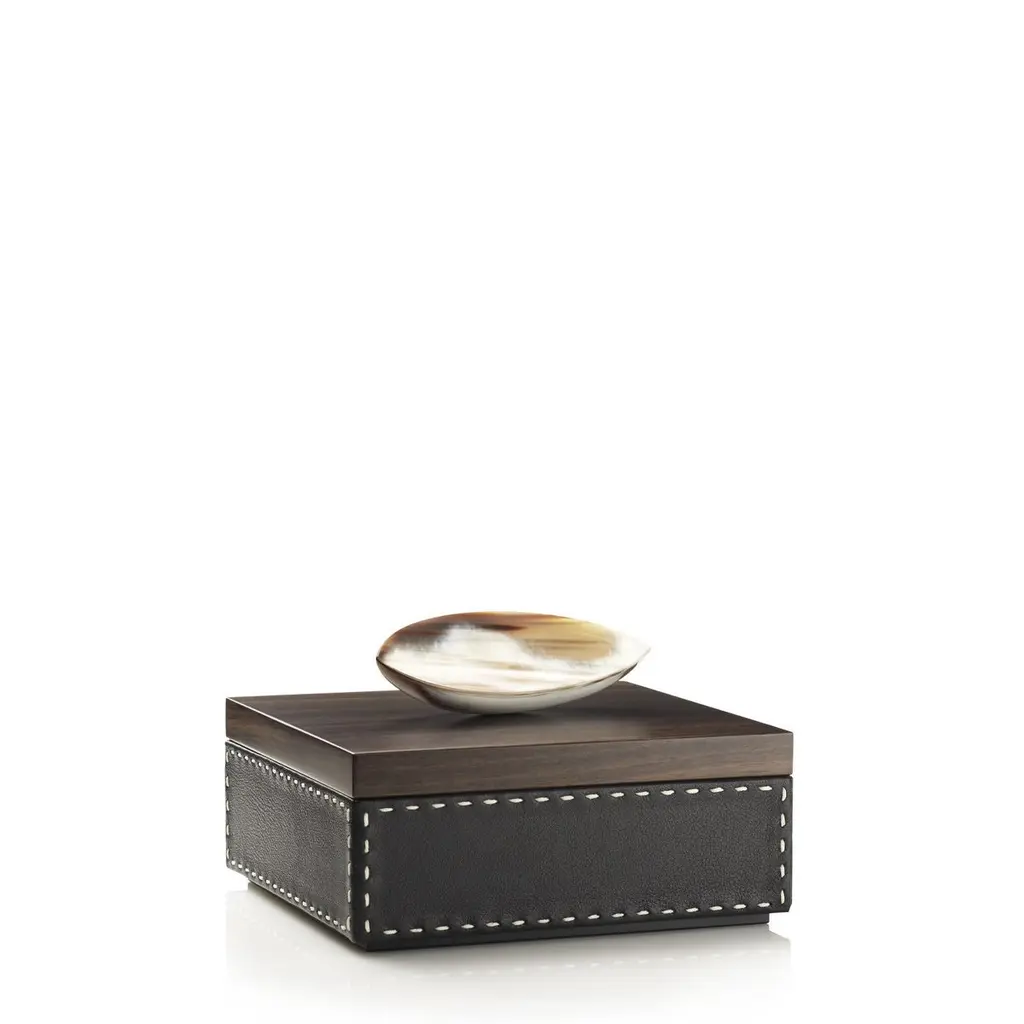 With its refined appearance, our Capricia square box can easily fit both traditional and contemporary décor. Its clean traditional shape is enriched by a lining in Onyx color pebbled leather with handmade cream-colored stitching. The interior is also clad in the same leather to ensure your trinkets are safely stored. Topped with an elegant lid in matte Amara ebony veneer, the box is distinguished by a sculptural knob in Corno Italiano. Inspired by the hulls cutting through waves, the knob is an elegant marriage of convex and flat shapes born from the most skillful craftsmanship. The blending of prized materials provides a sense of uniqueness and inimitable personality to this design. Capricia is also proposed in Ice-cream colour leather with dark brown stitching and it’s available in two different dimensions: mod. 4475: cm 13 x 13 x H cm 15mod. 4476: cm 18 x 18 x H cm 13Note: Colors and shades of Corno Italiano processed by our Company are unique and due to the natural origin of raw material. For this reason Corno Italiano tones that can be seen in pictures are indicative and can not be reproduced in finished products.
