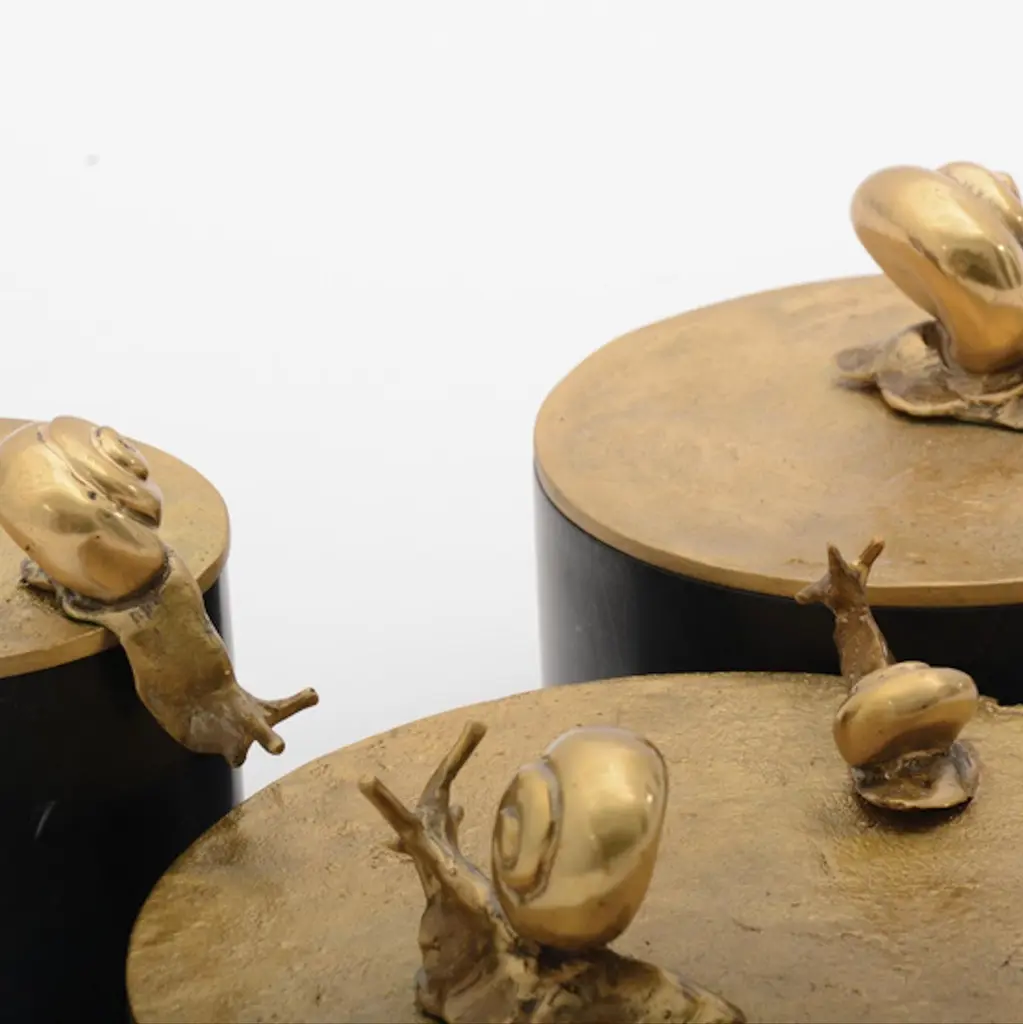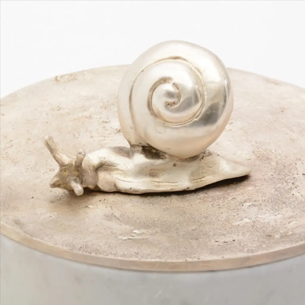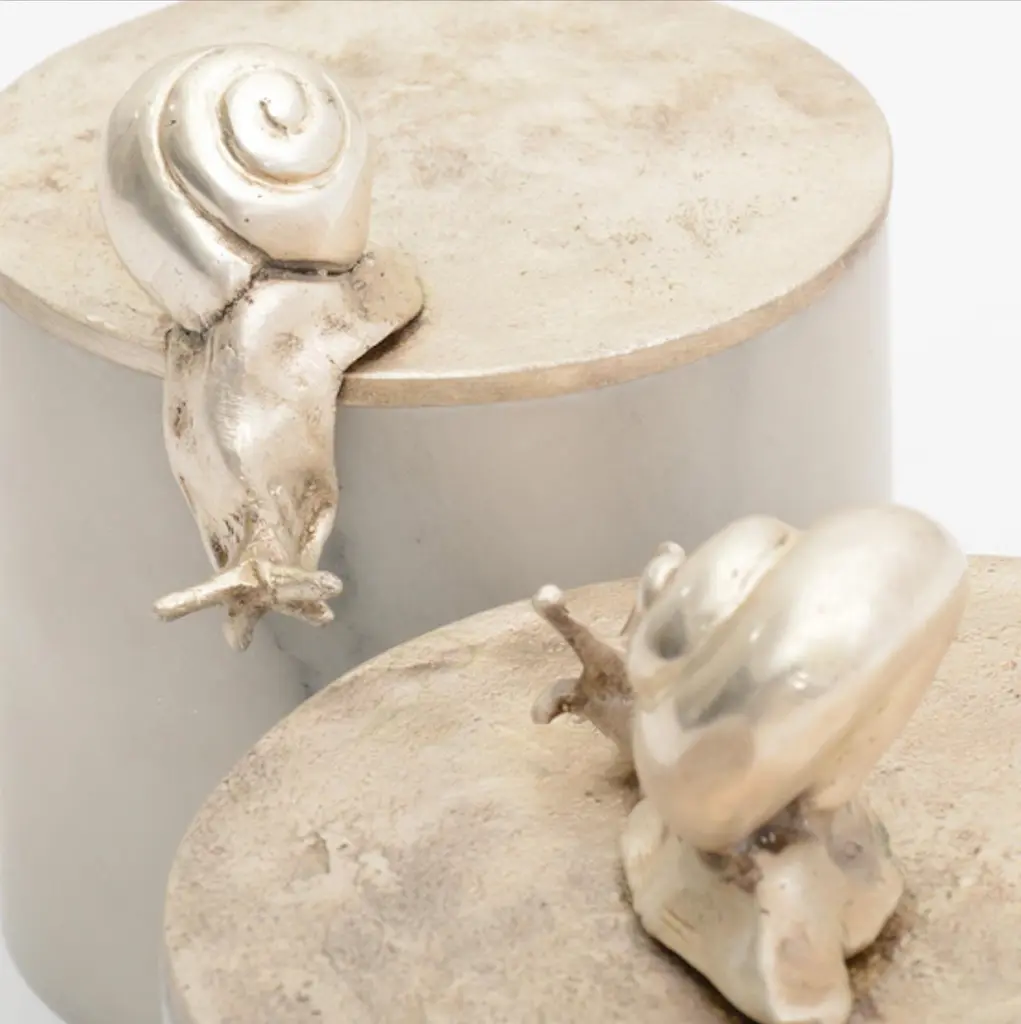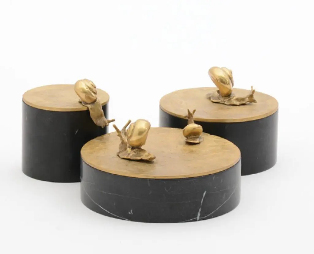 Caracol Keepsake box set of 3 in silver bronze and white marbleThe set of 3 includes 1 small, 1 medium, and 1 large Keepsake Box. Caracol keepsake box is comprised of a hand carved base in black or white marble with a solid old gold bronze or matte silver bronze top. An elegant vide-poche or jewelry box. Small/W 3.9 x D 3.9 x H 5.1 inW 10 x D 10 x H 13 cmMedium/W 5.5 x D 5.5 x H 4.5 inW 14 x D 14 x H 11.5 cmLarge/W 7.1 x D 7.1 x H 3.9 inW 18 x D 18 x H 10 cm