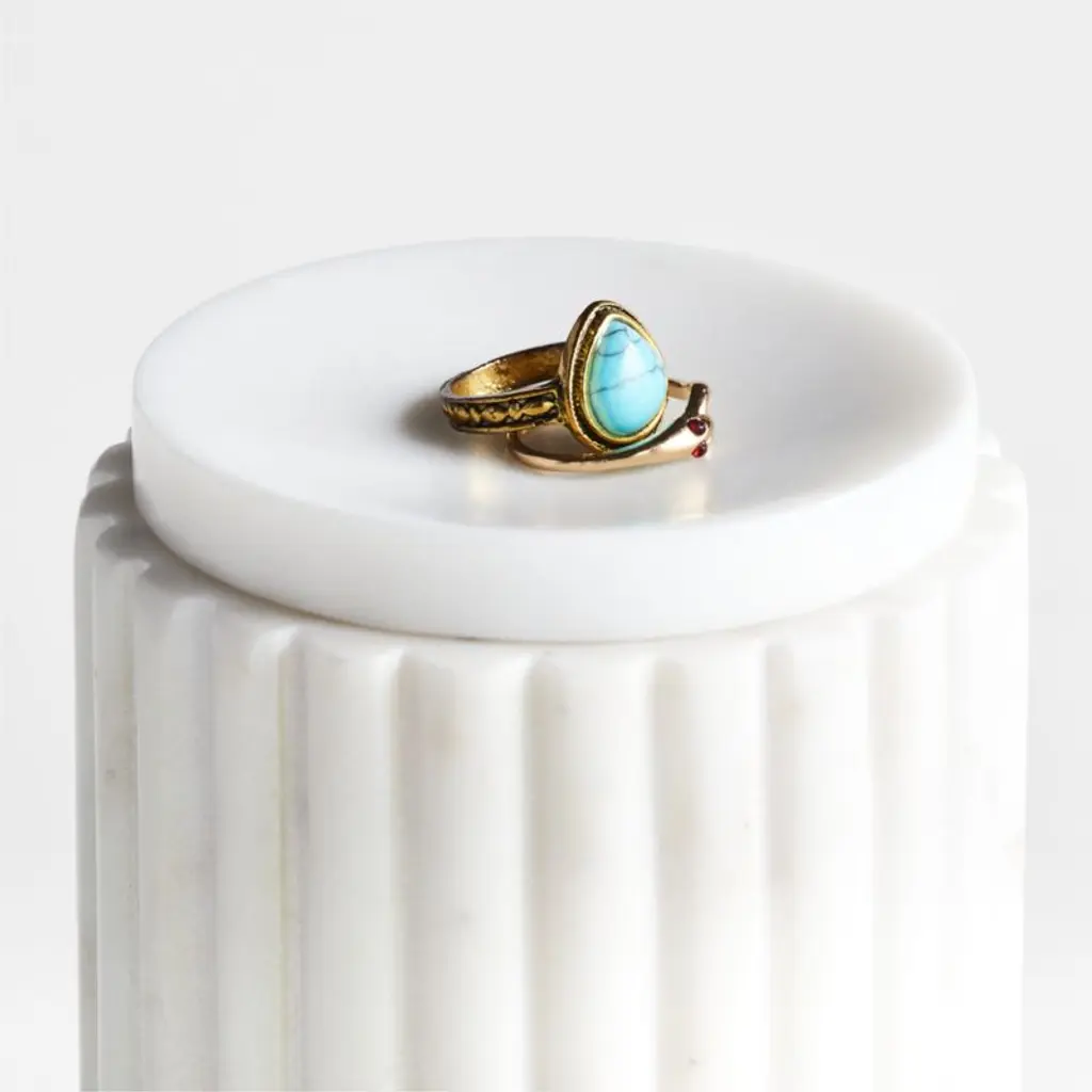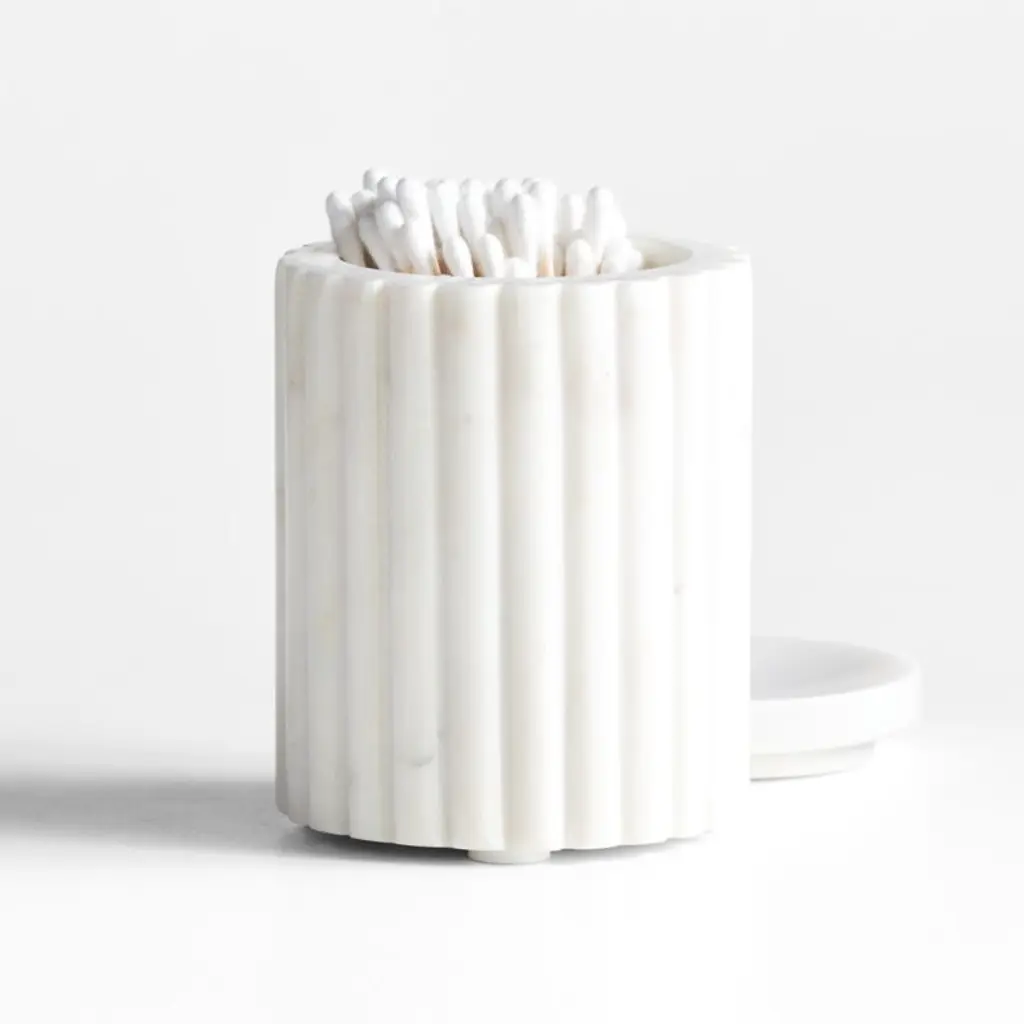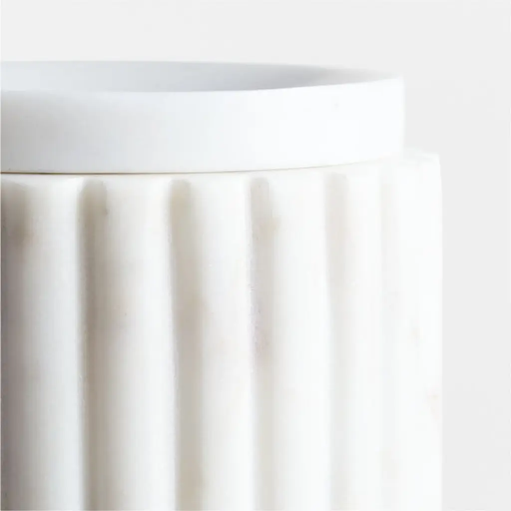 Luxurious in fluted white marble, our Carmen canister corrals cotton pads, swabs, scent samples or other bathroom miscellany in classical style. The gently concave lid doubles as a soap dish or a tray to corral jewelry. An elevated addition to any bathroom, the Carmen collection especially suits our marble-topped vanities. Due to the natural material, each canister is beautifully unique.