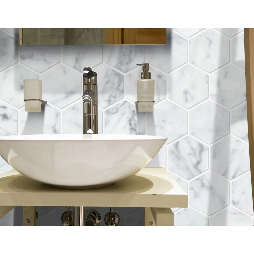 Elevate your space with the timeless elegance of Carrara marble in our Carrara 6"x6" Honeycomb Polished Tile. These tiles are a true work of art, showcasing the exquisite beauty and luxury that Carrara marble is famous for. The honeycomb pattern adds a touch of modern sophistication to this classic material, creating a visual masterpiece in your home. The polished finish of these tiles imparts a brilliant, mirror-like shine that reflects light and creates an atmosphere of opulence. Measuring at 6"x6", they offer the perfect blend of traditional charm and contemporary design, making them a versatile choice for various applications, from bathroom walls to grand entryways.What's included?Product DetailsSample Details