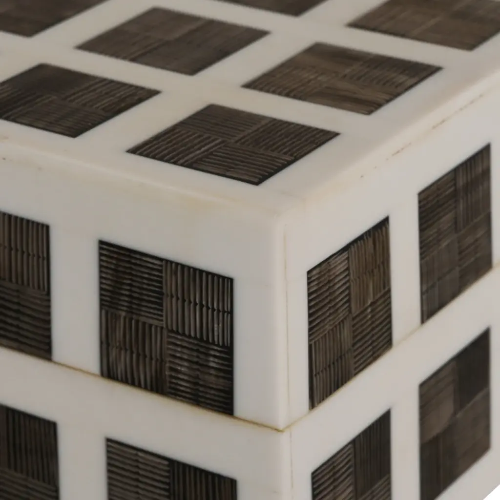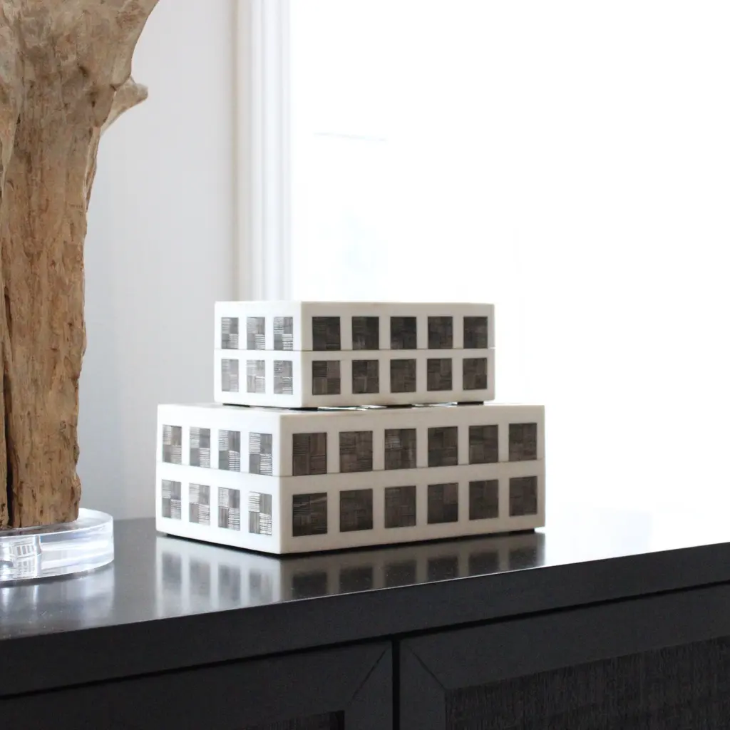 Decor-meets-storage. Hand-carved horn set in ivory resin frame features a graphic, minimal inlaid grid pattern. This set of two decorative boxes adds a unique global element to your home. Get a set to keep and an extra pair to share as a gift.