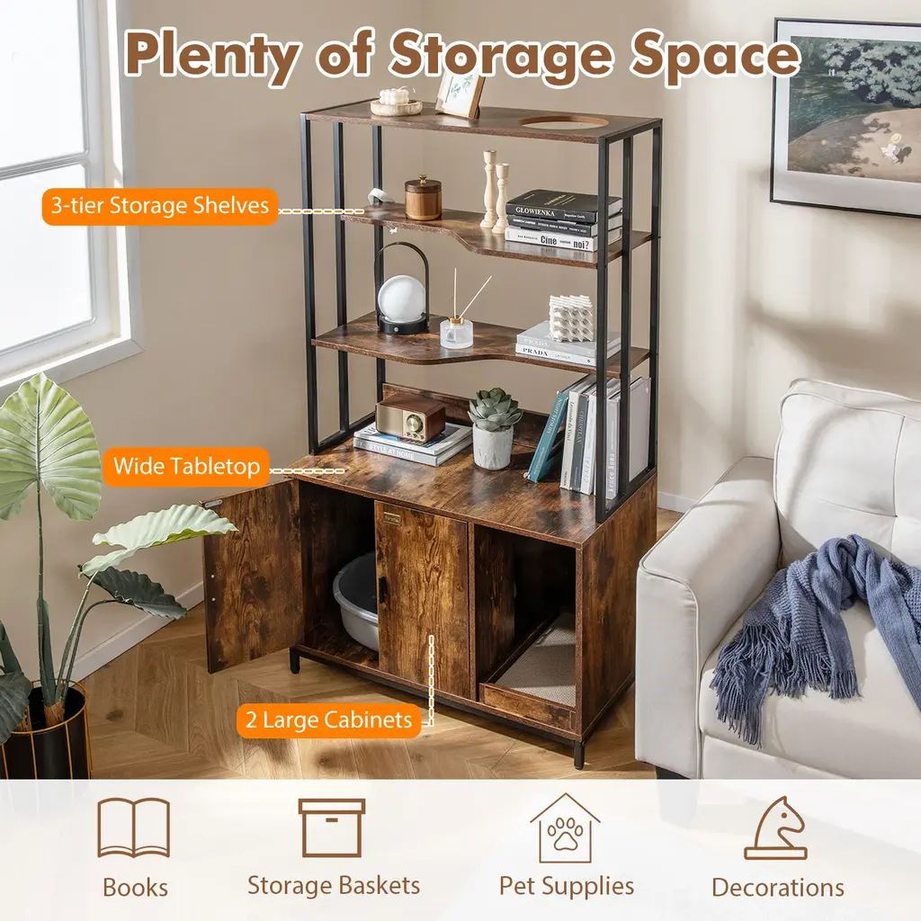 Cat Litter Box Cabinet With Storage Space & 3-Tier Shelves, Modern Design - 33.5" X 18" X 61" - Rustic-Brown-Black