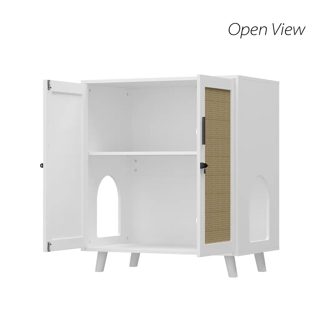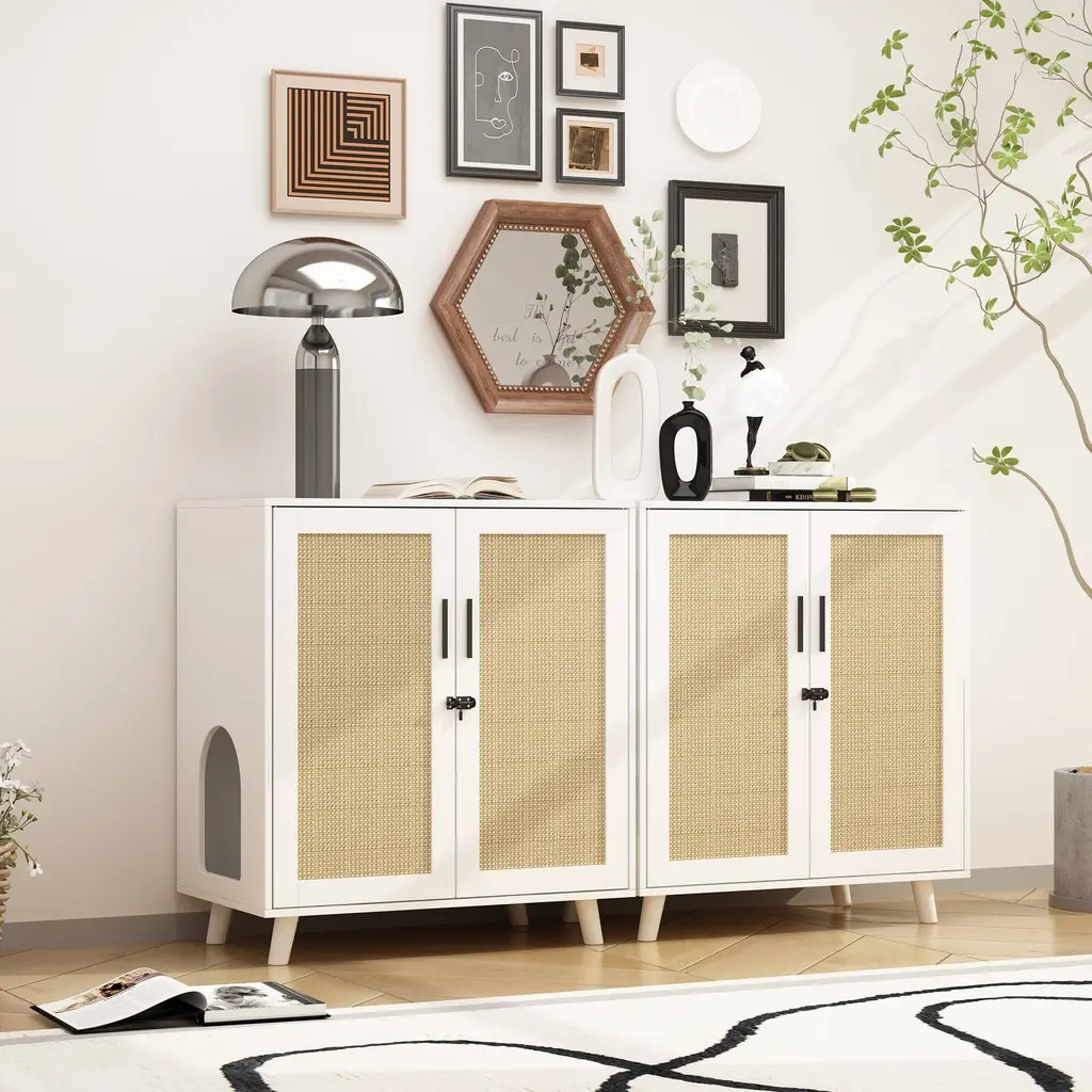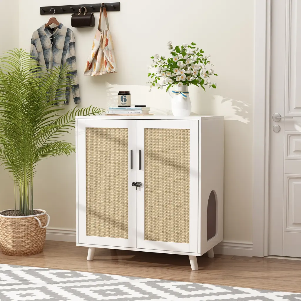 【4-in-1 Multi-Functional Cat House:】This 2-door rattan cabinet serves as a versatile cat house that meets various needs. It not only conceals your cat's litter box but also provides a private and comfortable space for your furry friend. Additionally, it functions as a storage cabinet for pet snacks and toys, as well as a practical side table bathroom cabinet or nightstand that seamlessly blends with your home decor.【A Deep Drawer & Apron Tabletop:】Designed with a spacious tabletop, this cat house allows you to place books, magazines, potted plants, lamps, and other decorative items. The apron design on the tabletop prevents items from accidentally falling off. The cabinet features two doors, providing easy access to most standard litter boxes, while the deep and wide drawer offers ample storage space.【Selected Material and Sturdy Construction:】Crafted from high-quality MDF board with meticulous craftsmanship, this hidden cat washroom is built to last. It is durable, wear-resistant, and resistant to deformation, ensuring it can withstand cats climbing up and down. 【Right Entrance for Great Ventilation:】To prioritize the comfort of your cat, this cat house features a kitty-sized entrance on the right side. It allows your cat to move freely and easily in and out of the house. Moreover, the entrance promotes good ventilation, brings soft light to your cat, and effectively prevents dogs from accessing the litter box furniture.【Easy Setup and Maintenance:】With the detailed instructions provided, assembling this cat litter box enclosure is a breeze, requiring minimal effort and time. The magnetic doors ensure quiet opening and closing, minimizing disturbances. The spray-painted surface is smooth and burr-free, making it easy to clean and maintain the cat house, ensuring a hygienic environment for your feline companion.Experience the perfect combination of functionality and style with this 4-in-1 Multi-Functional Cat House. Create a cozy and private space for your cat while adding a touch of elegance to your home.