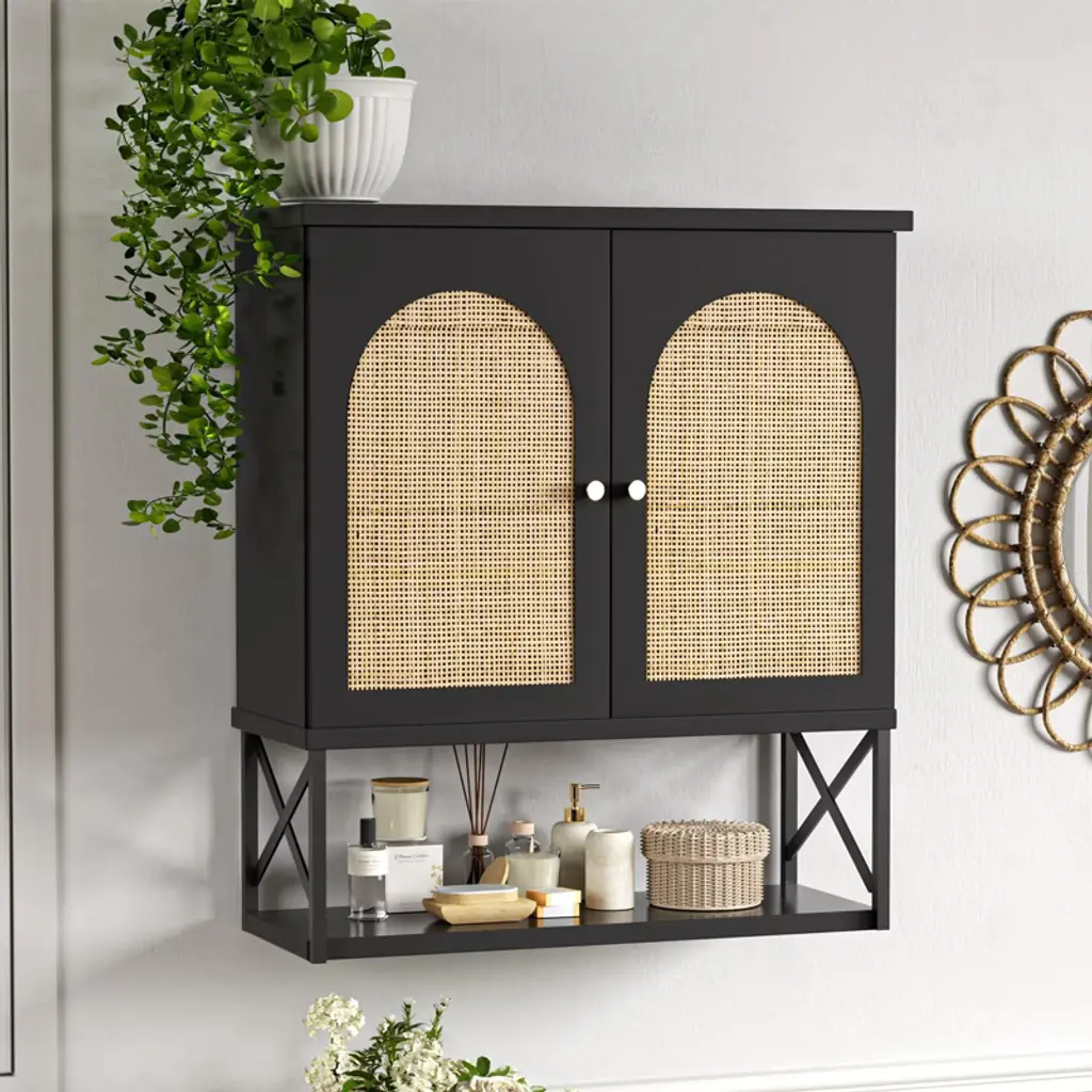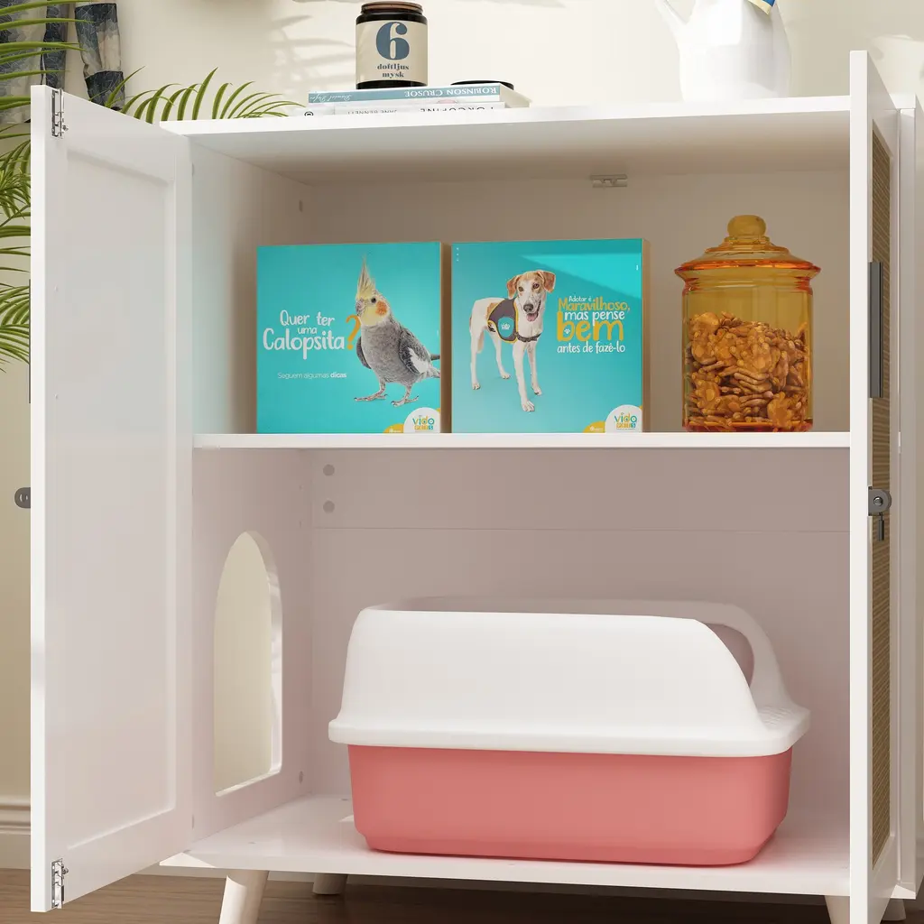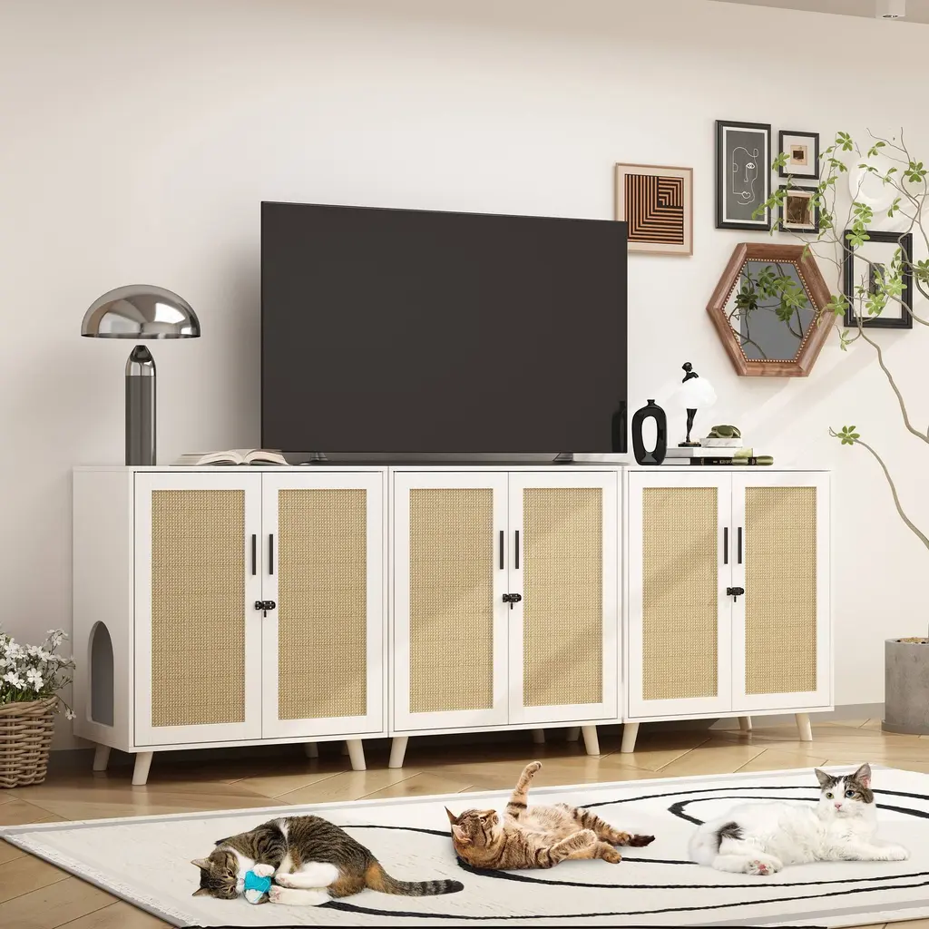 【4-in-1 Multi-Functional Cat House:】This 2-door rattan cabinet serves as a versatile cat house that meets various needs. It not only conceals your cat's litter box but also provides a private and comfortable space for your furry friend. Additionally, it functions as a storage cabinet for pet snacks and toys, as well as a practical side table bathroom cabinet or nightstand that seamlessly blends with your home decor.【A Deep Drawer & Apron Tabletop:】Designed with a spacious tabletop, this cat house allows you to place books, magazines, potted plants, lamps, and other decorative items. The apron design on the tabletop prevents items from accidentally falling off. The cabinet features two doors, providing easy access to most standard litter boxes, while the deep and wide drawer offers ample storage space.【Selected Material and Sturdy Construction:】Crafted from high-quality MDF board with meticulous craftsmanship, this hidden cat washroom is built to last. It is durable, wear-resistant, and resistant to deformation, ensuring it can withstand cats climbing up and down. 【Right Entrance for Great Ventilation:】To prioritize the comfort of your cat, this cat house features a kitty-sized entrance on the right side. It allows your cat to move freely and easily in and out of the house. Moreover, the entrance promotes good ventilation, brings soft light to your cat, and effectively prevents dogs from accessing the litter box furniture.【Easy Setup and Maintenance:】With the detailed instructions provided, assembling this cat litter box enclosure is a breeze, requiring minimal effort and time. The magnetic doors ensure quiet opening and closing, minimizing disturbances. The spray-painted surface is smooth and burr-free, making it easy to clean and maintain the cat house, ensuring a hygienic environment for your feline companion.Experience the perfect combination of functionality and style with this 4-in-1 Multi-Functional Cat House. Create a cozy and private space for your cat while adding a touch of elegance to your home.