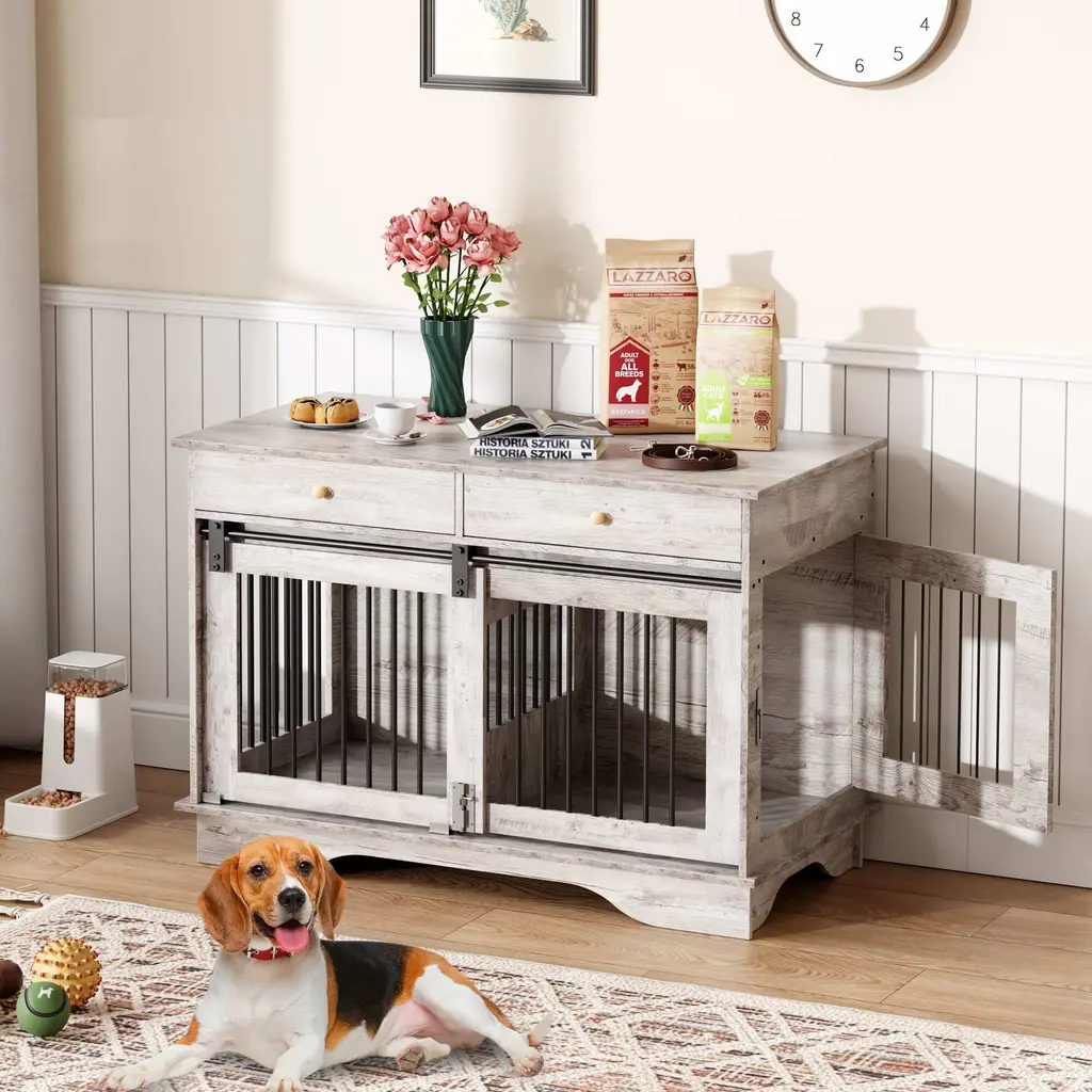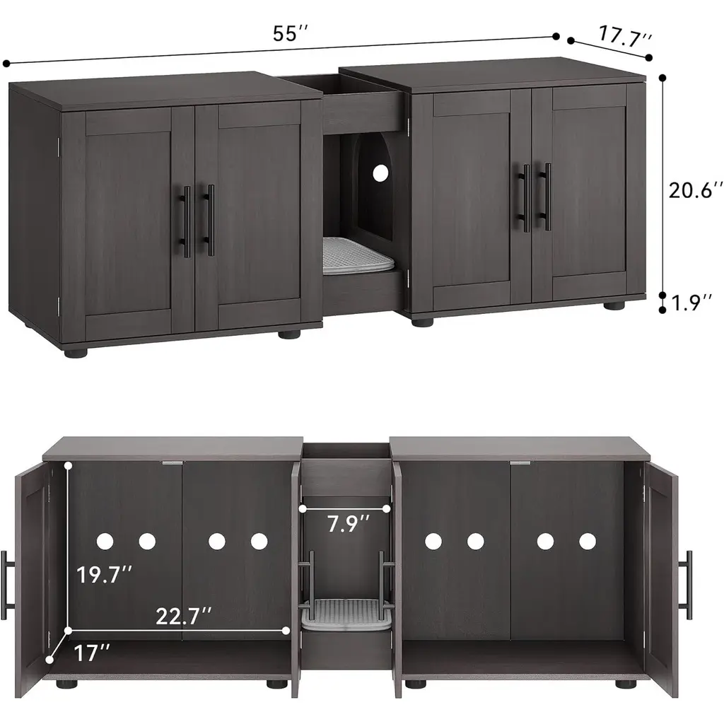 Double-Room Cat Litter Cabinet Design:This spacious two-room cat litter cabinet is designed to comfortably accommodate two cats simultaneously. With dimensions of 55”L x 17.7”W x 22.5”H, it is suitable for most standard cat litter boxes.Multi-Functional Furniture:The dual-purpose cat litter cabinet not only serves as a cozy cat house and litter box but also doubles as stylish home furniture. Use it as a TV stand, coffee table, or decorative piece to enhance your living space while providing your cats with a private area.Convenient Cat Mat:Our cat litter cabinet comes equipped with a premium cat mat in the center, effectively minimizing litter tracking and keeping your home tidy. This feature helps reduce odors and maintains a cleaner environment.Thoughtful Design:Designed with a central access hole, this double-room cat litter cabinet allows easy entry and exit for your cats while providing adequate ventilation and light inside. The waterproof material simplifies the cleaning process for your convenience.Practical Storage Groove:The centrally located groove is perfect for storing canned cat food and other cat supplies. This design not only maximizes storage space but also keeps your pet items organized and easily accessible.