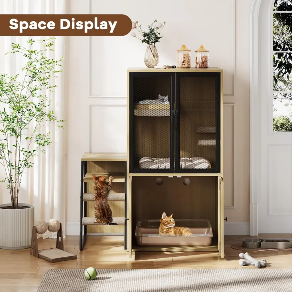 This multi-functional cat cabinet combines a litter box, play area, resting space, and storage into one spacious unit, ideal for multi-cat households. Featuring sisal stairs and poles to satisfy scratching instincts, it also includes a cozy hammock for comfortable rest. Safety is prioritized with arched edges to prevent injuries, and adjustable feet ensure stability on uneven floors for a secure setup.