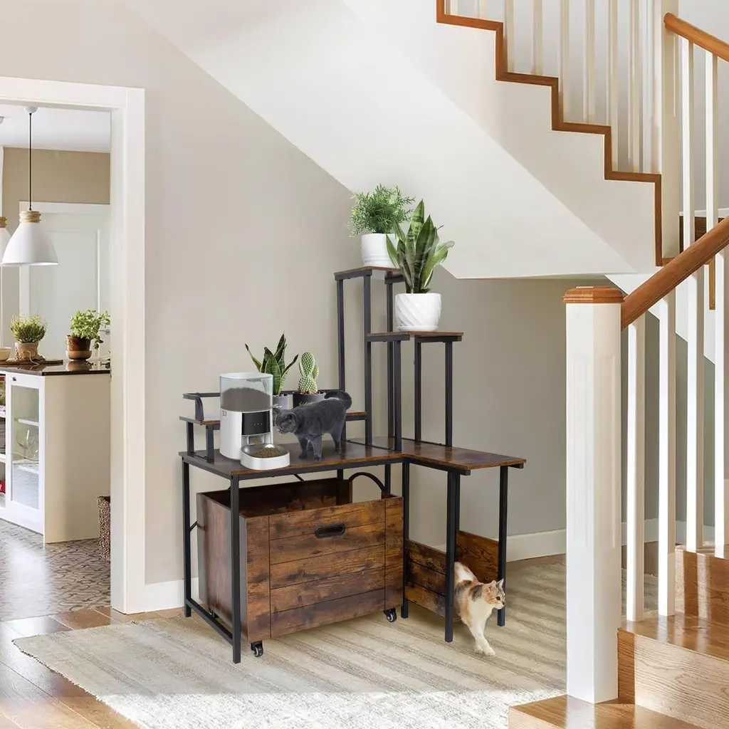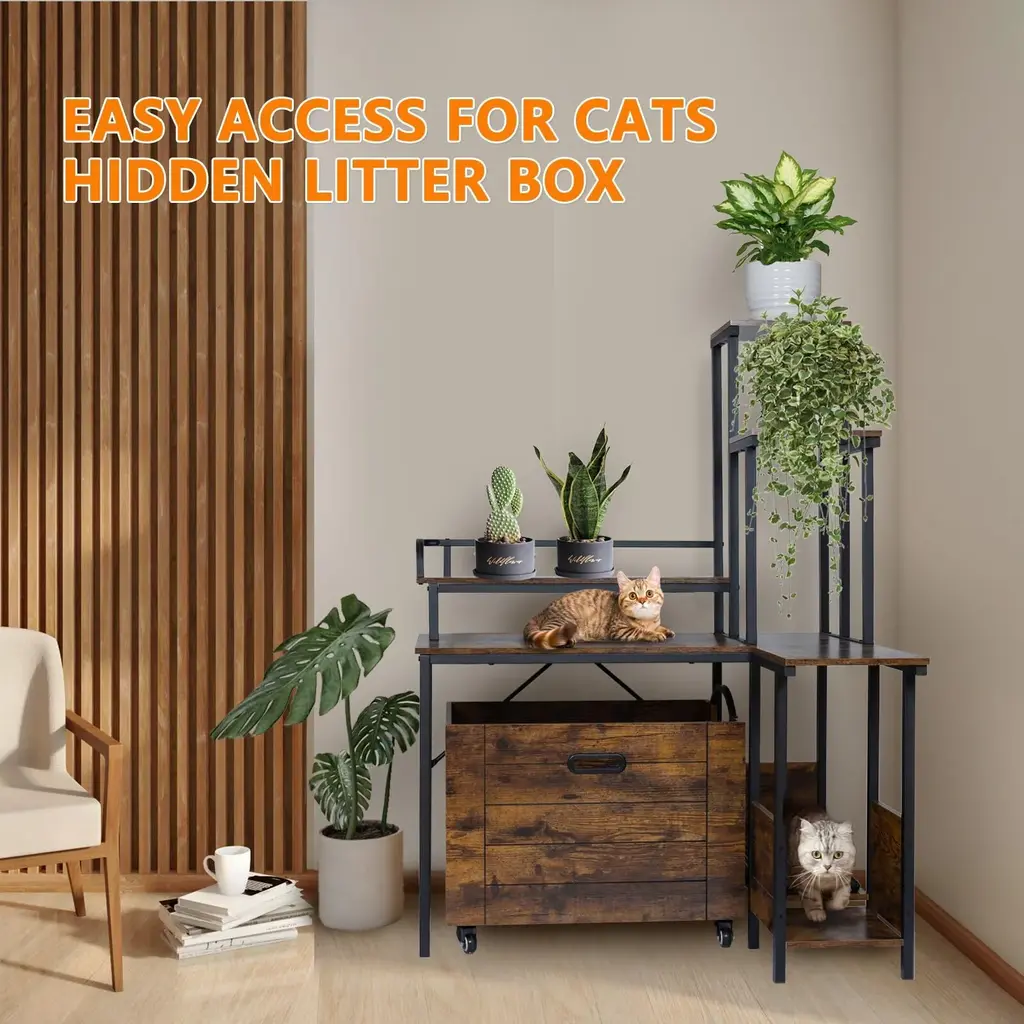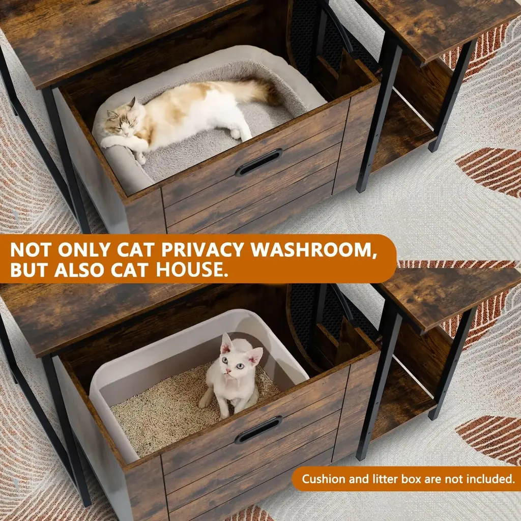 【Corner Flower Stand Design】This beautiful hidden litter box enclosure is a piece of furniture that combines style and functionality. 【Pullable Cabinet Design】The bottom of the cabinet is equipped with pulleys, and the cat litter box can be pulled out perfectly just by gently dragging the bottom board. 【More privacy】The cat litter box enclosure provides your cats their own safe spot where they can have their privacy for potty time and feel safe in the process. 【Multi-Purpose Cat Litter Box Furniture】Cat litter box shell can give sensitive kittens enough security and comfort. 【Product information】We provide PVC-foam mat at the entrance of the cabinet to catch the litter under your cat's feet when they leave, without scattering the litter all over the floor and dirtying your room. Suitable for cats around 12 lbs. Specifications: Dimensions:36.8"L x 31.5"W x 51"H Shape:Rectangular Material:Engineered Wood Weight:64.7LBS