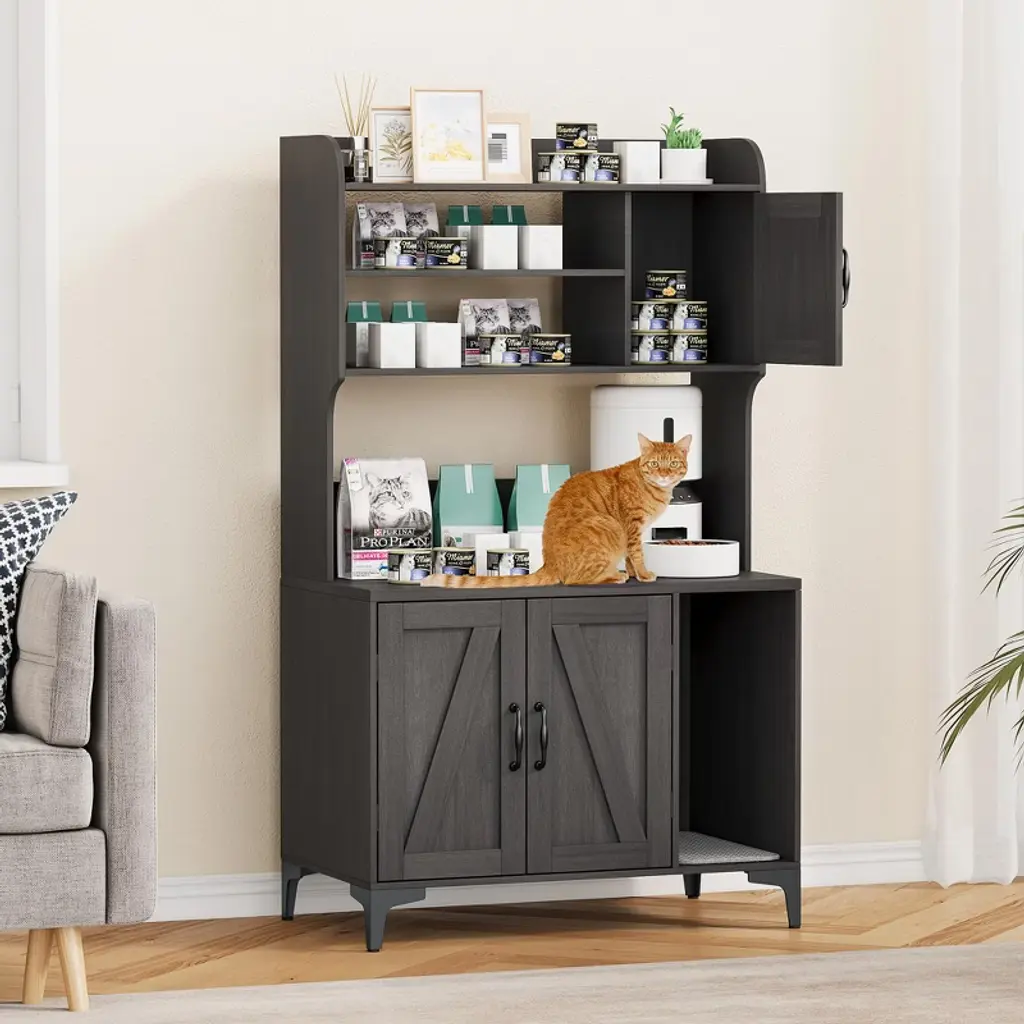 1.Multi-Functional Storage for a Tidy Home?This cat litter box enclosure is designed with abundant storage options to keep your space organized: 4 spacious shelves, 1 dedicated compartment, and 1 locker. These spaces are perfect for storing cat food, treats, toys, grooming tools, or even personal items like books and decor, eliminating clutter and blending pet care seamlessly with your home¡¯s organization.? 2.Perfect Size for Small to Medium Cats?Measuring 31.5"L x 17.7"W x 51.1"H, the enclosure offers a cozy interior space ideal for cats up to 12 lbs. It provides a secure, comfortable washroom area where your feline can privacy. Note that it¡¯s not recommended for larger breeds like Maine Coons, ensuring a snug fit for smaller to medium-sized cats.? 3.Built-In Scratch Pad for Healthy Habits?Included is a durable scratch pad that satisfies your cat¡¯s natural scratching instincts, keeping them entertained and preventing damage to your furniture, carpets, or curtains. This feature promotes healthy behavior while saving your home from unwanted claw marks, making it a win-win for both you and your pet.? 4.Enclosed Indoor Washroom for Privacy & Hygiene?The enclosed design creates a dedicated, private space for your cat to use the litter box, reducing stress and encouraging regular use. It also acts as a barrier against dogs (preventing unwanted access) and contains litter scatter, keeping your floors cleaner and maintaining better overall hygiene in your home.? 5.Stylish Hidden Design Blends with Decor?Crafted from high-quality wood with a walnut finish, this enclosure doubles as functional furniture¡ªuse it as a bookshelf, display shelf, bedroom storage, or bathroom organizer when not housing the litter box. Its sleek design merges with various interior styles, hiding the litter box from view while adding a decorative touch to your living space.?