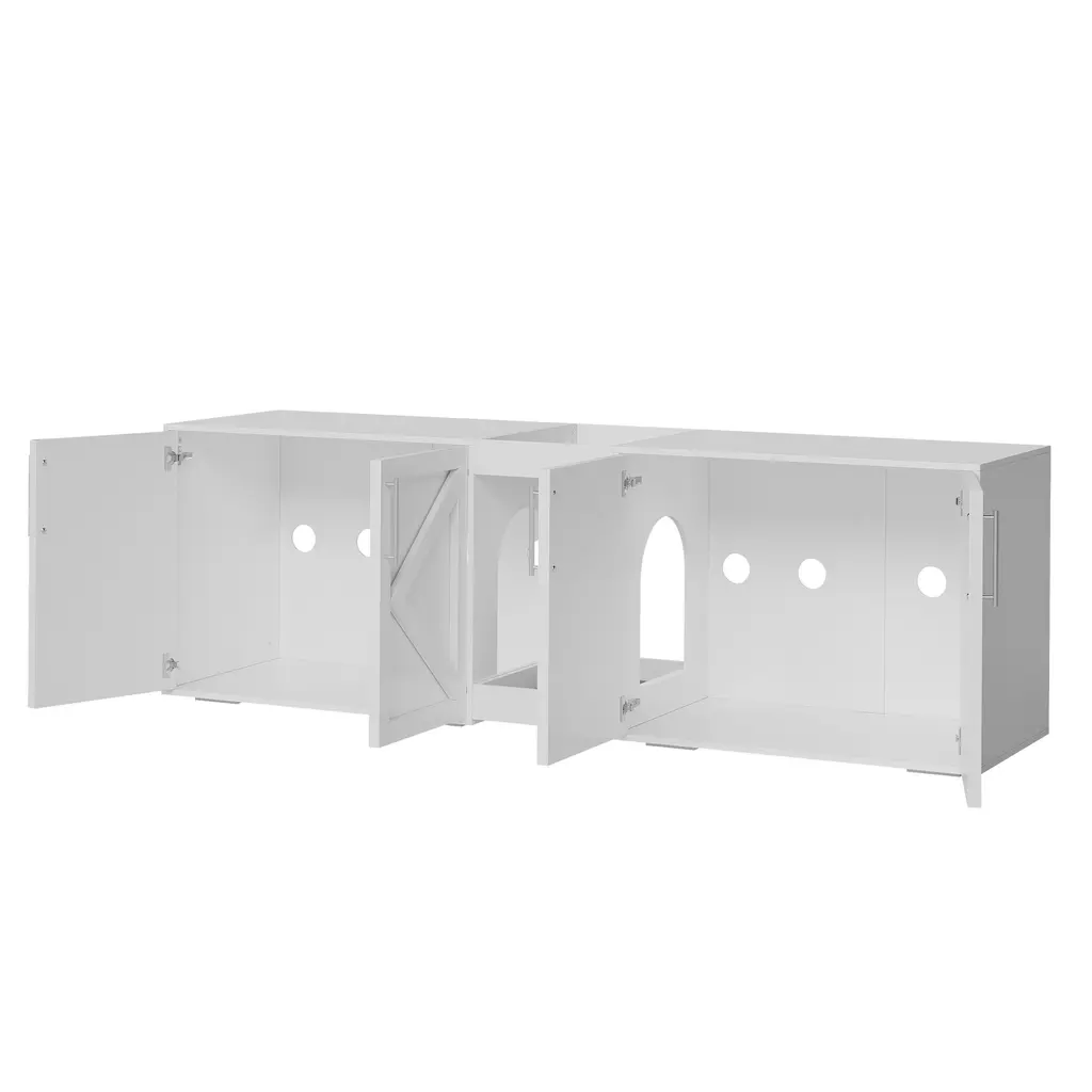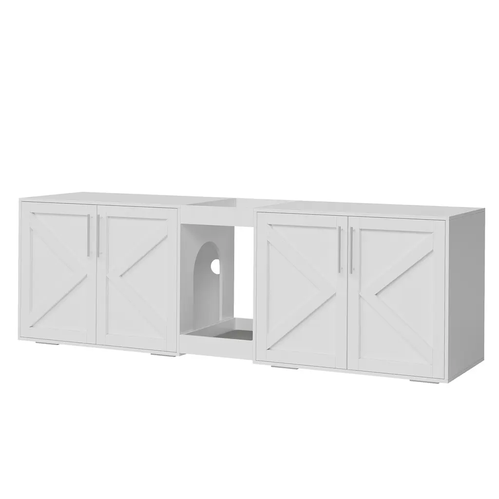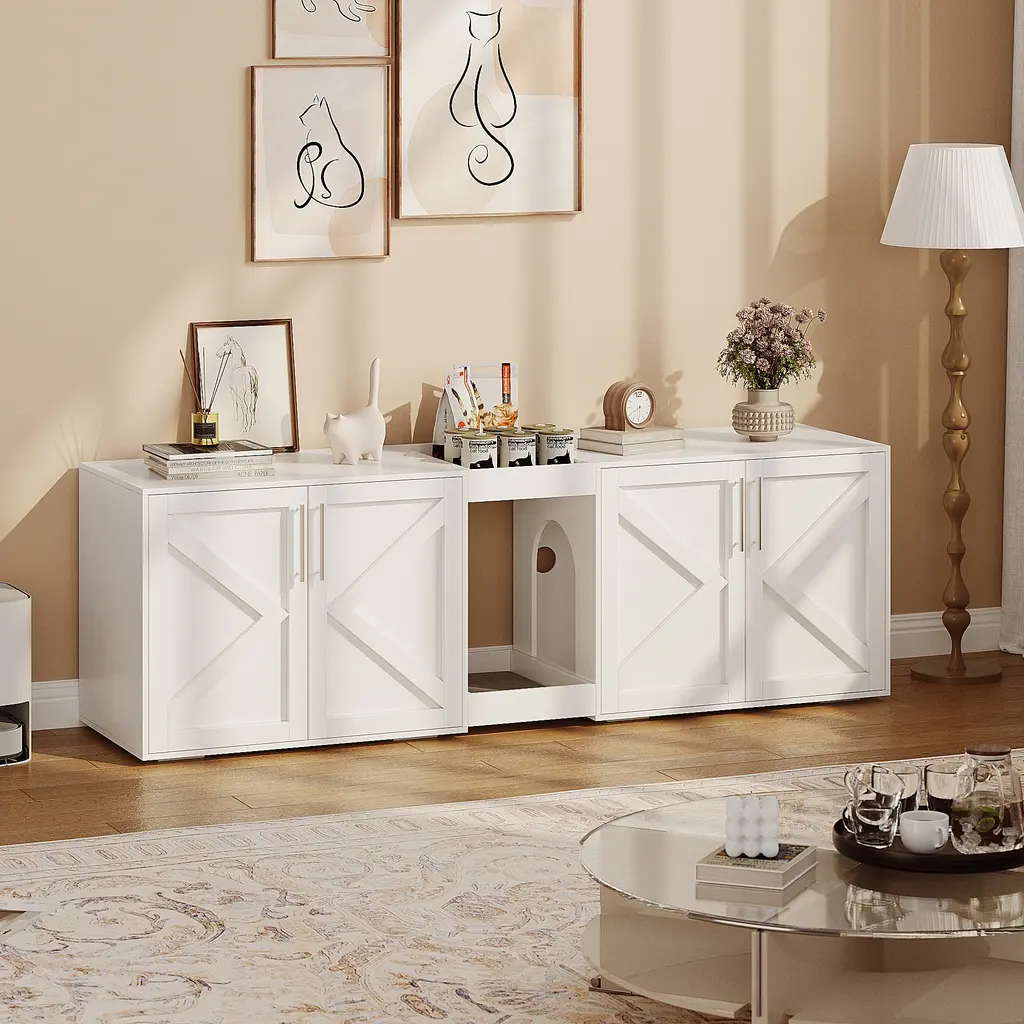 Private and Secure Space for Your Cat: The cat litter box enclosure provides a private space for your cat, effectively protecting its territory from dogs and other pets, minimizing mess and odor to create a serene environment for both you and your petsGenerous Dimensions: Measuring 25.59 x 17.72 x 22.44 inches, this cat litter box cabinet accommodates most standard litter boxes and provides a spacious interior for your cat to move comfortably, making it an ideal addition to any homeVentilation and Accessibility: With two front doors and arched side entrances, the cat house allows easy access for both your cat and for cleaning; four rear ventilation holes help prevent odor buildup, ensuring a fresher environment for pets and ownersStylish and Functional Design: The litter box hidden combines farmhouse charm with practicality, featuring an elegant white finish and unique barn doors with metal handles, effectively hiding your cat's litter box while enhancing your home decorVersatile Multi-Use Furniture: The cat washroom furniture conceals your cat's litter while also serving as a cozy cat bed and providing storage for your cat's belongings, making it a versatile piece that can function as an end or side table in any room