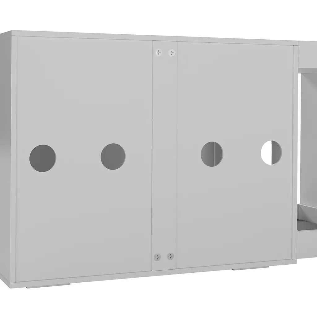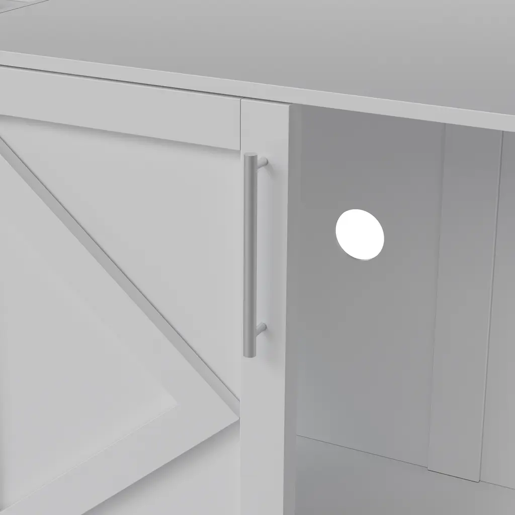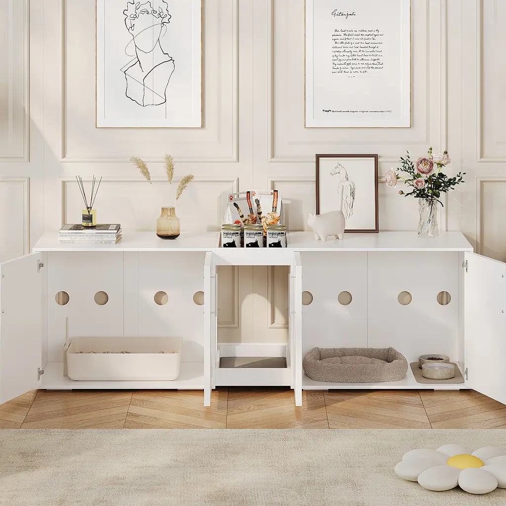 Private and Secure Space for Your Cat: The cat litter box enclosure provides a private space for your cat, effectively protecting its territory from dogs and other pets, minimizing mess and odor to create a serene environment for both you and your petsGenerous Dimensions: Measuring 25.59 x 17.72 x 22.44 inches, this cat litter box cabinet accommodates most standard litter boxes and provides a spacious interior for your cat to move comfortably, making it an ideal addition to any homeVentilation and Accessibility: With two front doors and arched side entrances, the cat house allows easy access for both your cat and for cleaning; four rear ventilation holes help prevent odor buildup, ensuring a fresher environment for pets and ownersStylish and Functional Design: The litter box hidden combines farmhouse charm with practicality, featuring an elegant white finish and unique barn doors with metal handles, effectively hiding your cat's litter box while enhancing your home decorVersatile Multi-Use Furniture: The cat washroom furniture conceals your cat's litter while also serving as a cozy cat bed and providing storage for your cat's belongings, making it a versatile piece that can function as an end or side table in any room