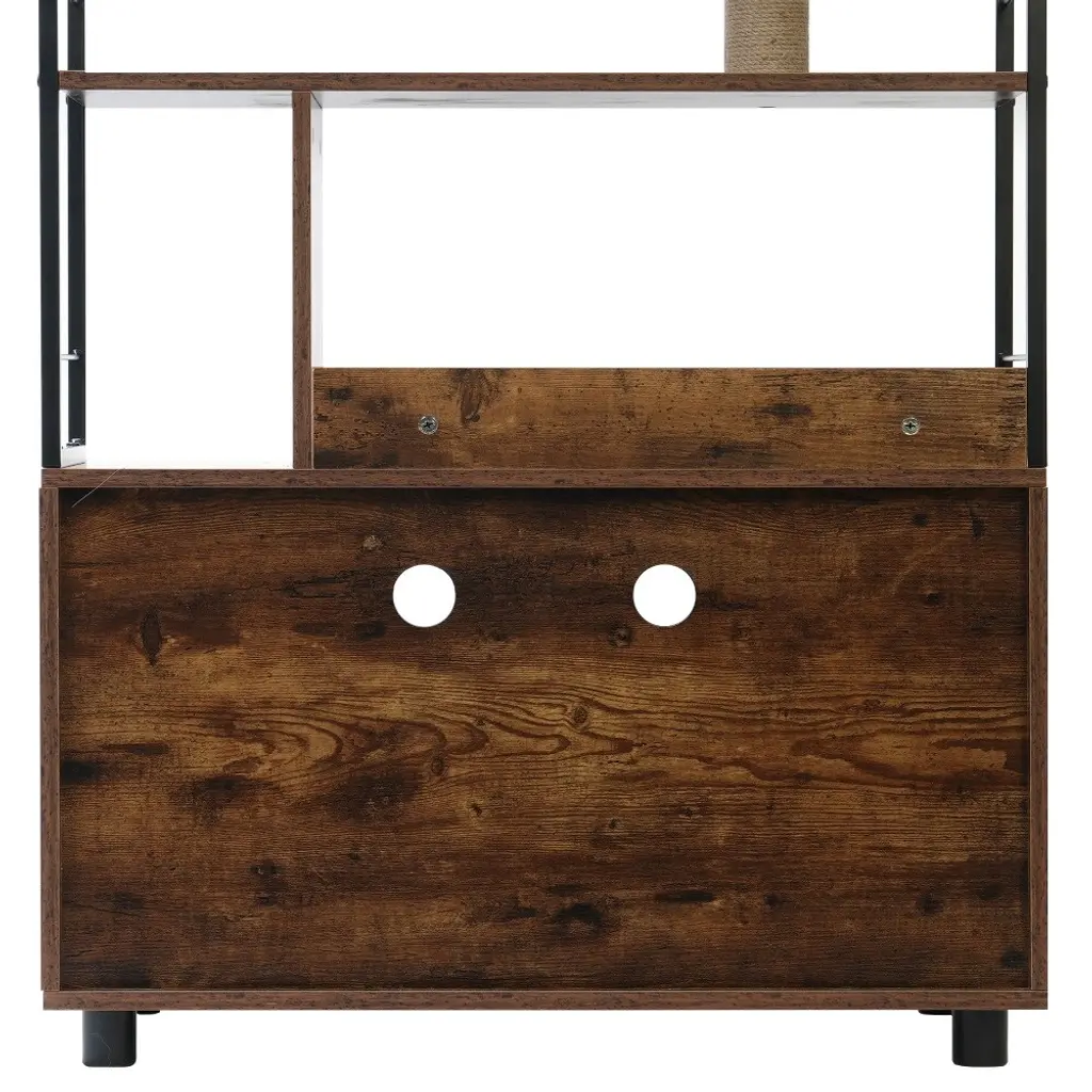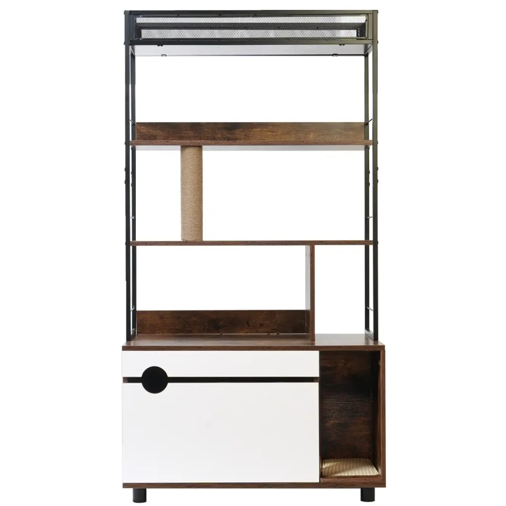 1,Multifunctional Cat Cabinet: Bottom concealed cat litter box, middle layer cat activity area with a Scratching Post, top storage shelf, fully utilizing vertical space.2,Furniture Style: Furniture-style design, able to effectively decorate your home space, suitable for use in different spatial environments.3,Detail Design: The flip-down door is equipped with an observation window, meeting cats' preference for observing in the dark. The entrance and exit are equipped with mats to collect litter, keeping the environment clean. The top shelf with a fence can protect items on the top shelf from falling.4,High Quality: Made with premium particle board and metal pipes, the product is sturdy and stable enough to effortlessly store cat food, litter, toys, etc.5,Internal dimensions: The cabinet can accommodate a cat litter box with maximum dimensions of 22.44*17.9 inches.