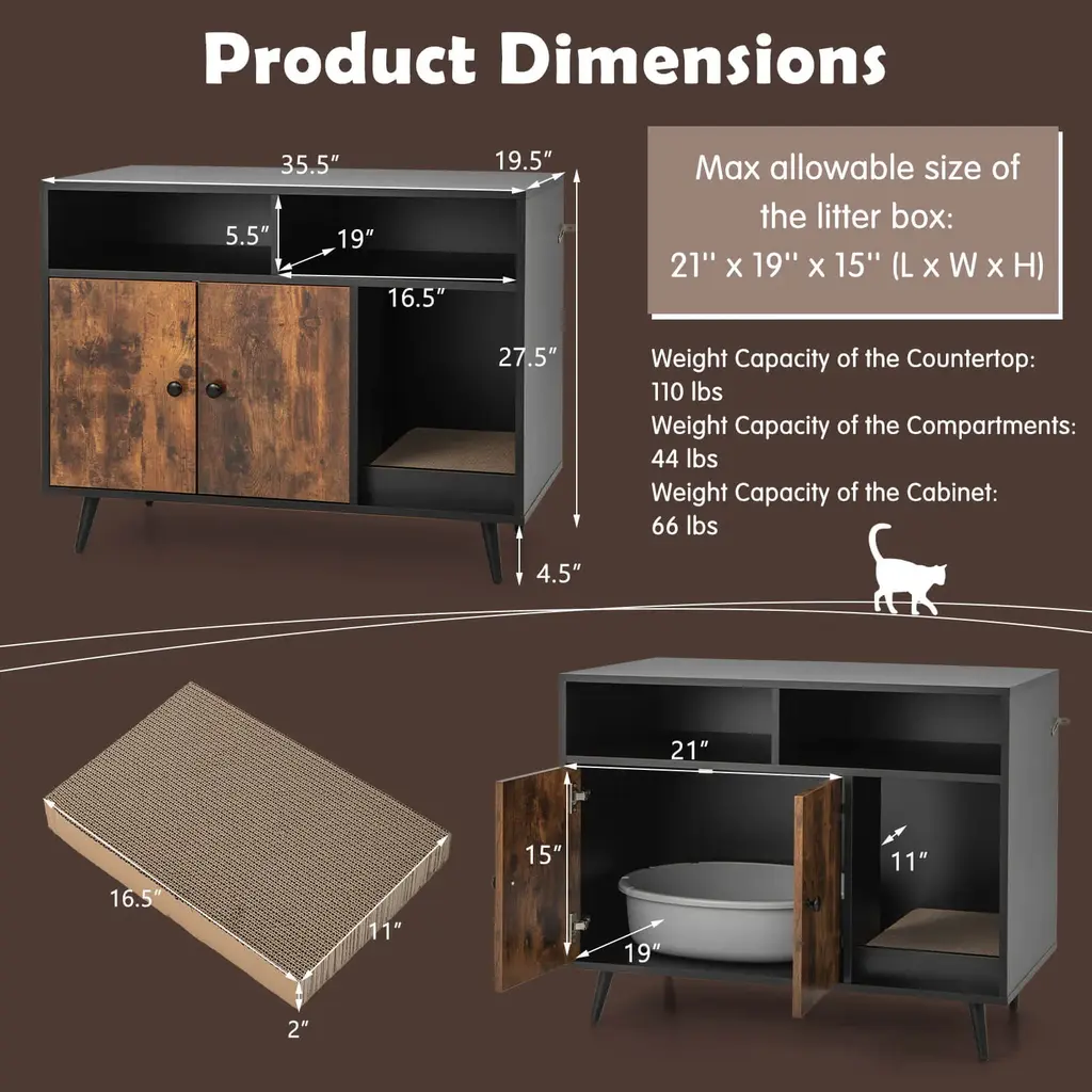 Cat Litter Box Enclosure With Storage Compartments And Pet Scratcher - Rustic Brown-Black