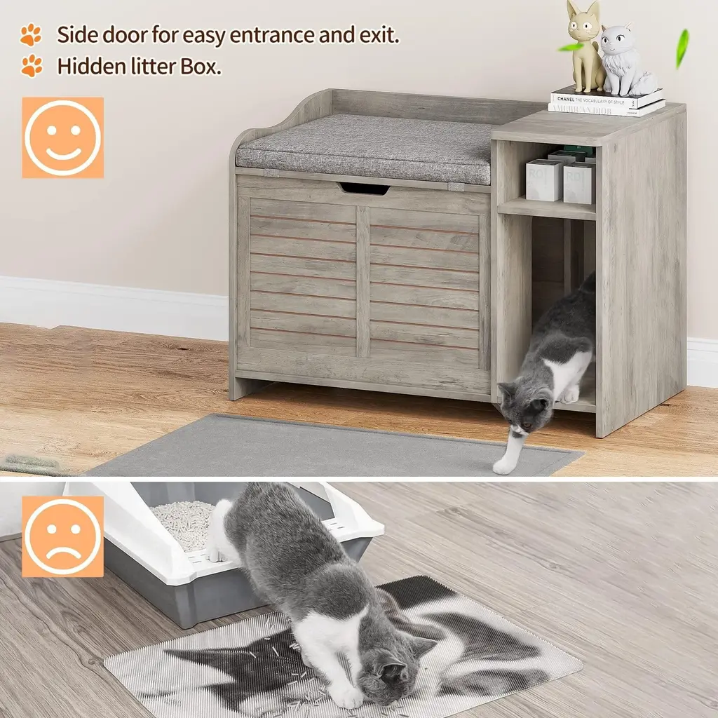 🐱Easy assembly: Detailed instructions included. Dimensions: 33.8" L x 19.6" D x 24.2" H. Not suitable for Maine Coon cats. Weight: 34.8lb. Color: White. 🐱Privacy for cats: Multi-purpose cat litter box furniture. Provides a safe place for potty time. Conceals litter box from dogs. Dimensions: 33.8" L x 19.6" D x 24.2" H. 🐱Top opening convenience: Reduces strain on your back and legs. No more bending to clean. Cat litter box furniture with cushion. Weight: 34.8lb. Color: White. 🐱Functional design: Cat litter box furniture doubles as storage. Blends seamlessly with your furniture. Dimensions: 33.8" L x 19.6" D x 24.2" H. Not suitable for Maine Coon cats. 🐱Private sanctuary: Cat litter box enclosure for cats' privacy. Inner size: 23" L x 19" W x 16" H. Entrance size: 8.6" W x 13.6" H. Suitable for cats around 11 lbs.