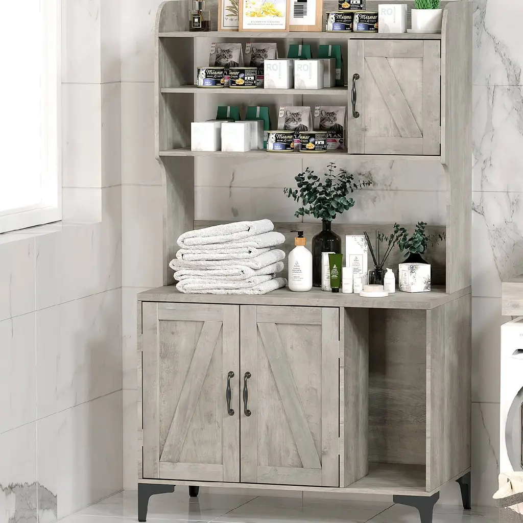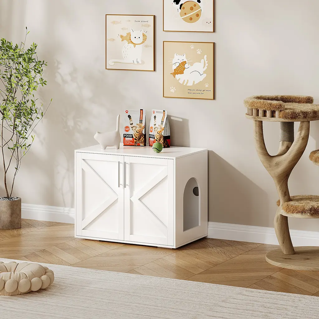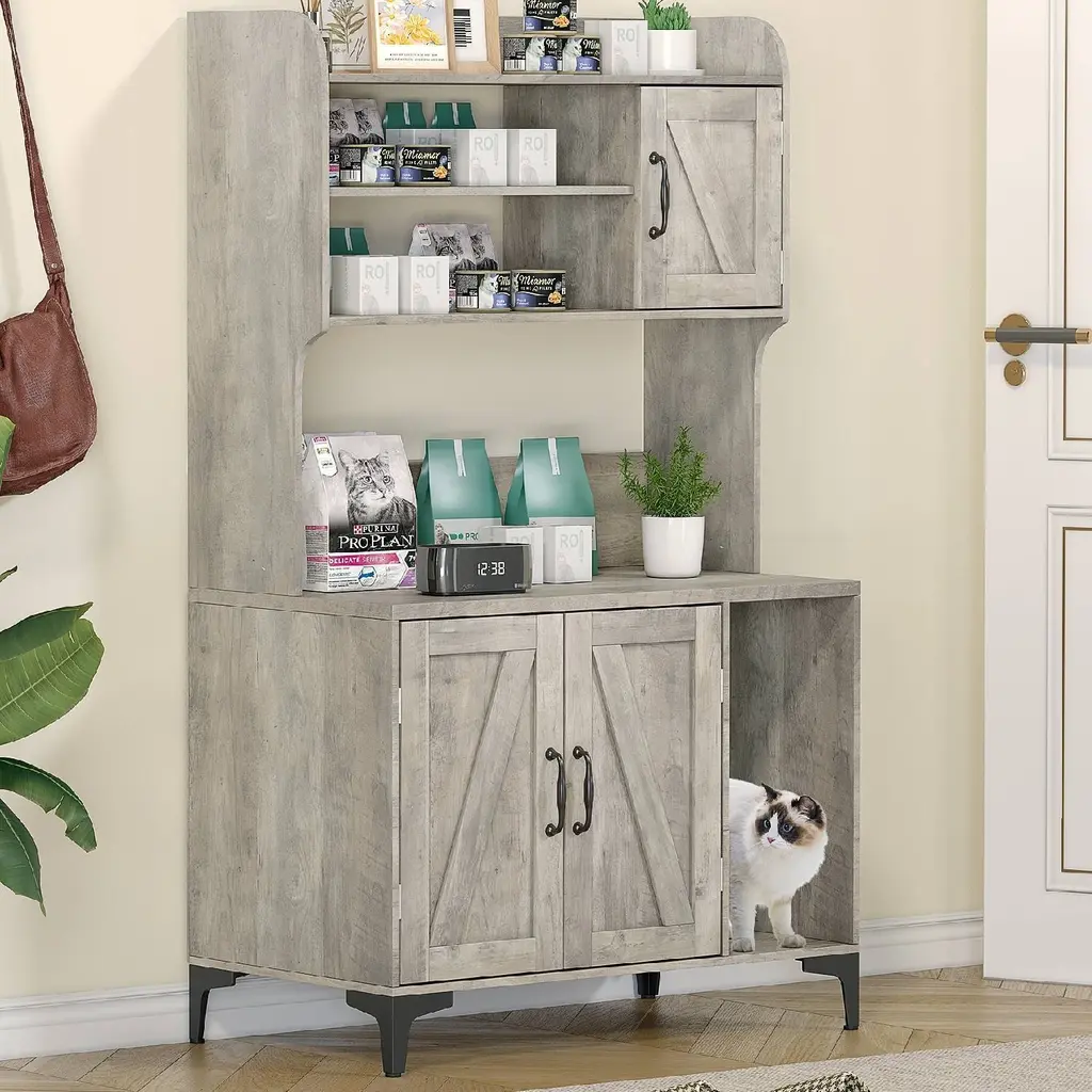 Our cat litter box enclosure is equipped with 4 storage tiers, 1 storagecompartment, and 1 locker, offering generous space for your possessions and petsupplies. Not limited to serving as a cat litter box, this furniture piece canalso function as a stylish accent in your living room, provide storagesolutions in your bedroom, or serve as an organizer in your bathroom. Theenclosed space for the litter box ensures your cat's privacy and keepsinquisitive dogs at bay. It also helps contain litter and prevents it fromspreading throughout your home. Measuring 31.5"L x 17.7"W x51.1"H (including 3.9" legs), our cat litter box enclosure has aninner size of 22.4"L x 17.7"W x 19.6"H, with an entrance size of8.4"W x 19.6"H. Suitable for cats weighing approximately 12 lbs (notrecommended for Maine Coon cats). Our concealed litter box furniture includesclear instructions and essential tools for easy assembly. To ensure lastingdurability, make sure to securely tighten the screws during setup.