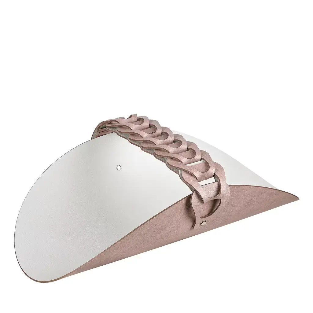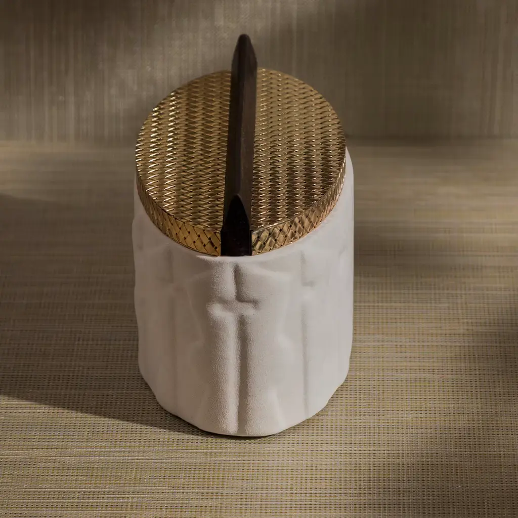 A deft showcase of tailored craftsmanship and exquisite artistic references marks the rich look of this box, a precious solution to collect jewel or make-up favorites. The linear wooden knob completing the lid's dazzling brass mesh hints at the rigor of Brutalist lines, while the embossed pattern enlivening the Canaletto walnut frame - dressed in beige Nubuck leather - depicts stylized figures paying homage to pre-Columbian art.
