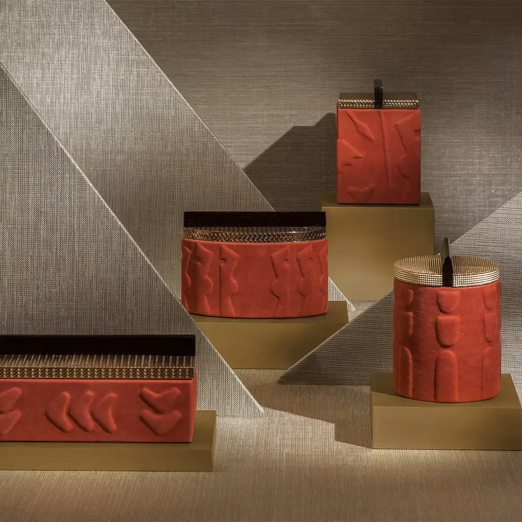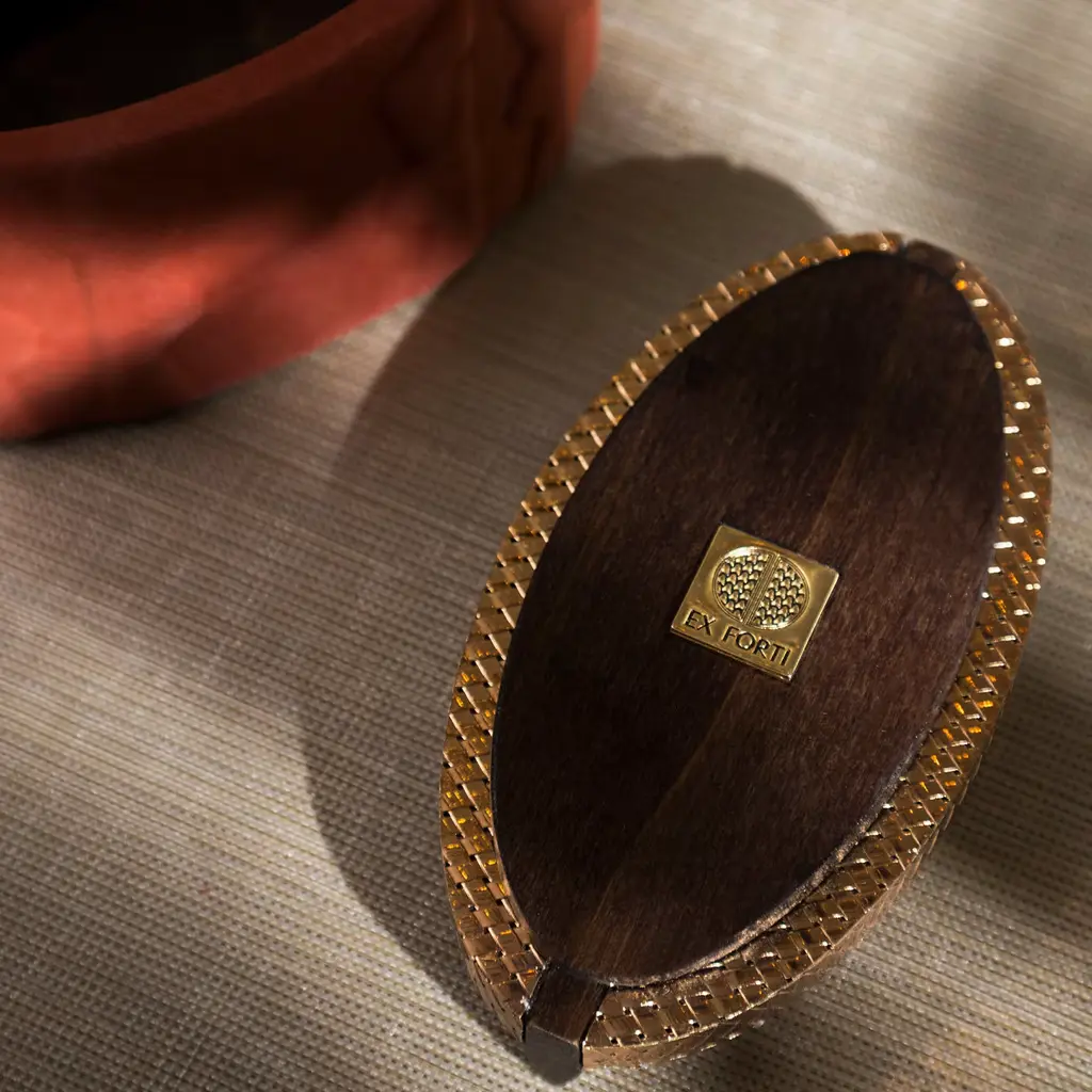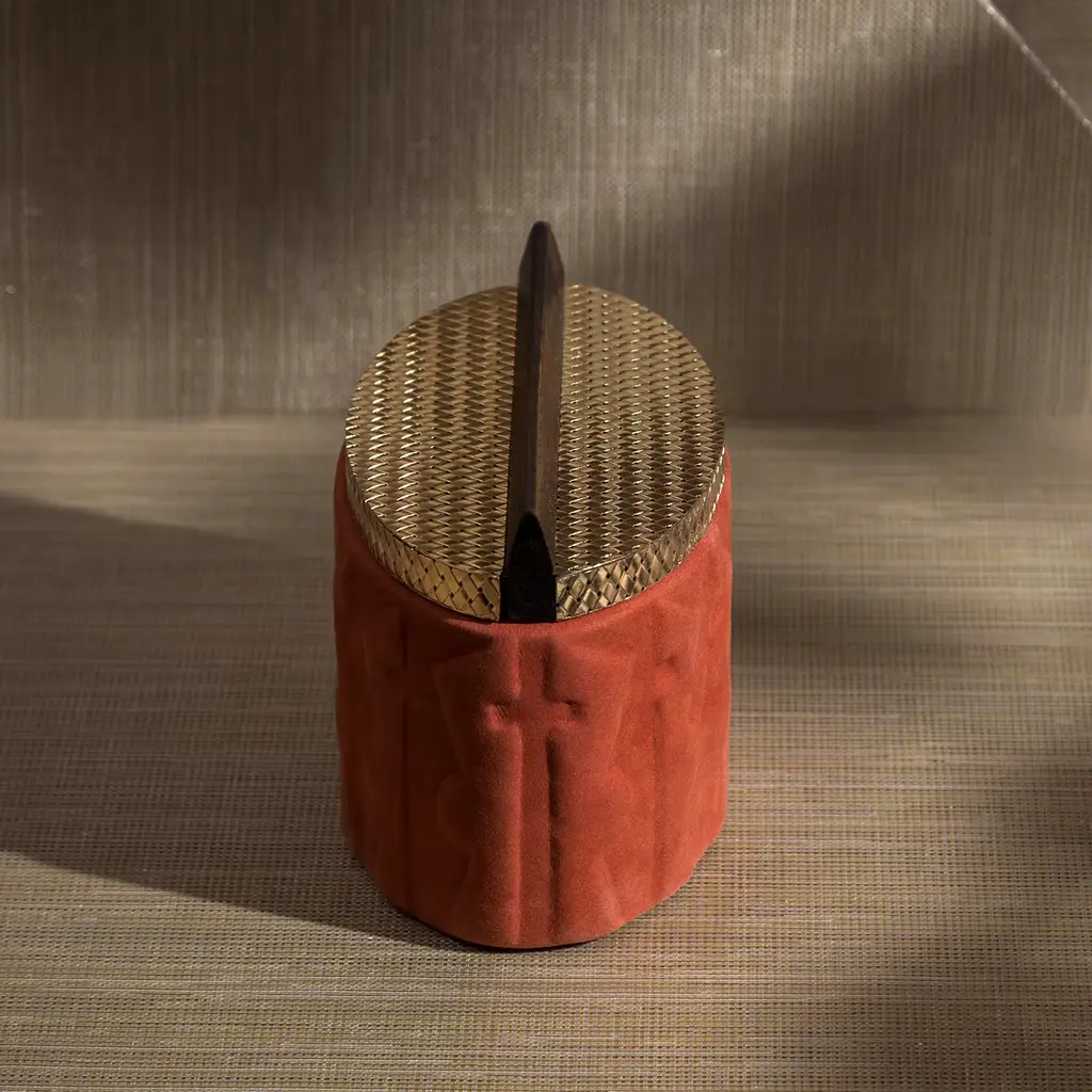 Masterfully merging design references, this precious box from the Bacabs Collection is best showcased on a luxe modern vanity. The pre-Columbian figures adding textural dynamism to the solid Canaletto walnut silhouette are splendidly enhanced by the coral-hued Nubuck leather upholstery, which delivers a regal quality paired to the glistening brass mesh characterizing the oval lid. The linear wooden knob, with its exposed grain, offers a double reference to nature and Brutalist architecture.