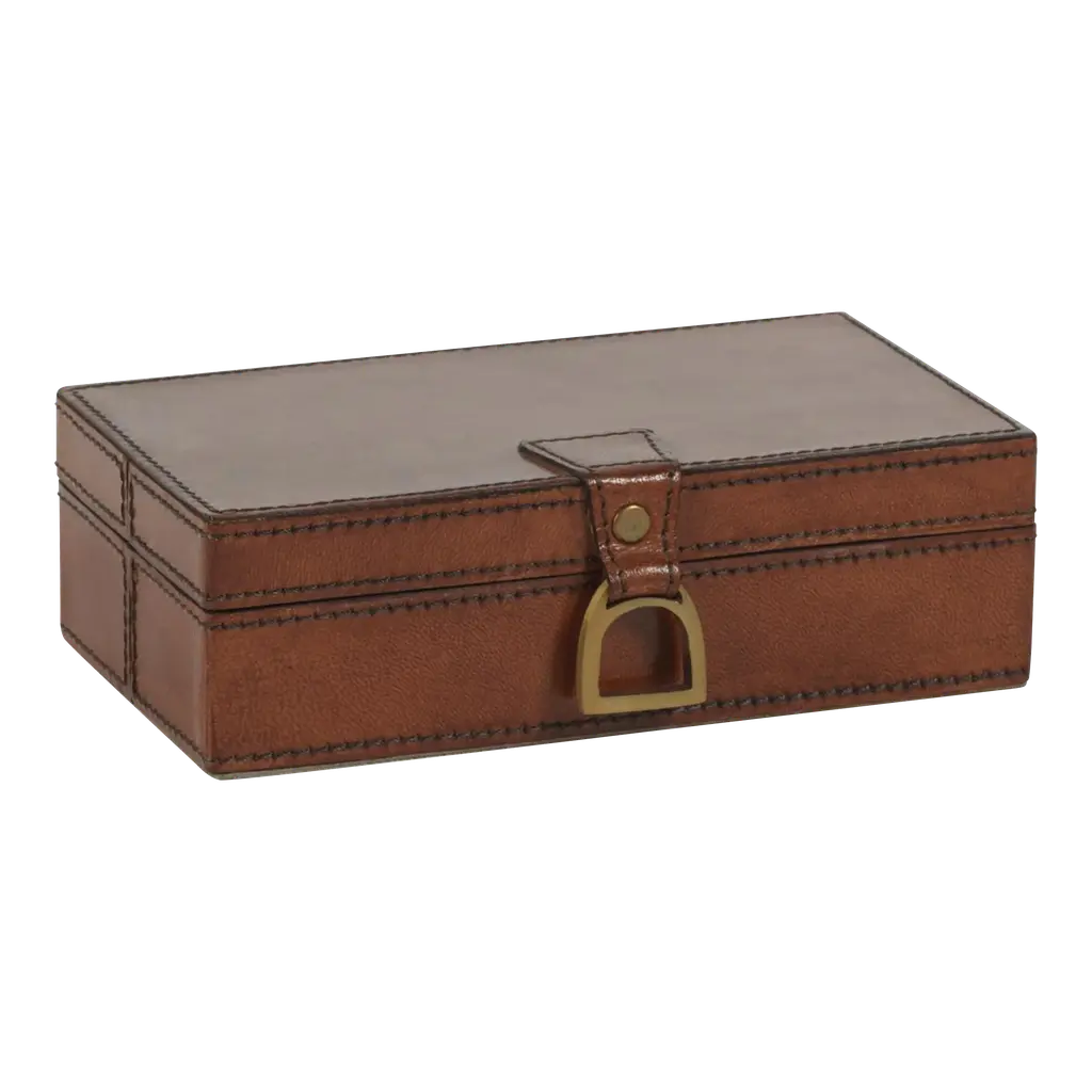 A beautiful decorative box made of leather with bold stitching that would render sophisticated look to your home interiors. The strap tab metal accent on the front adds a charming touch to this keepsake. Get organized and set visual accents at the same time with this elegant styled decorative box. Care Instructions: Clean with soft dry cloth Assembly Required? No