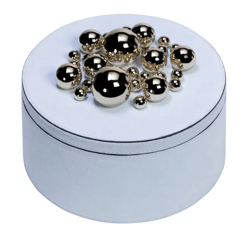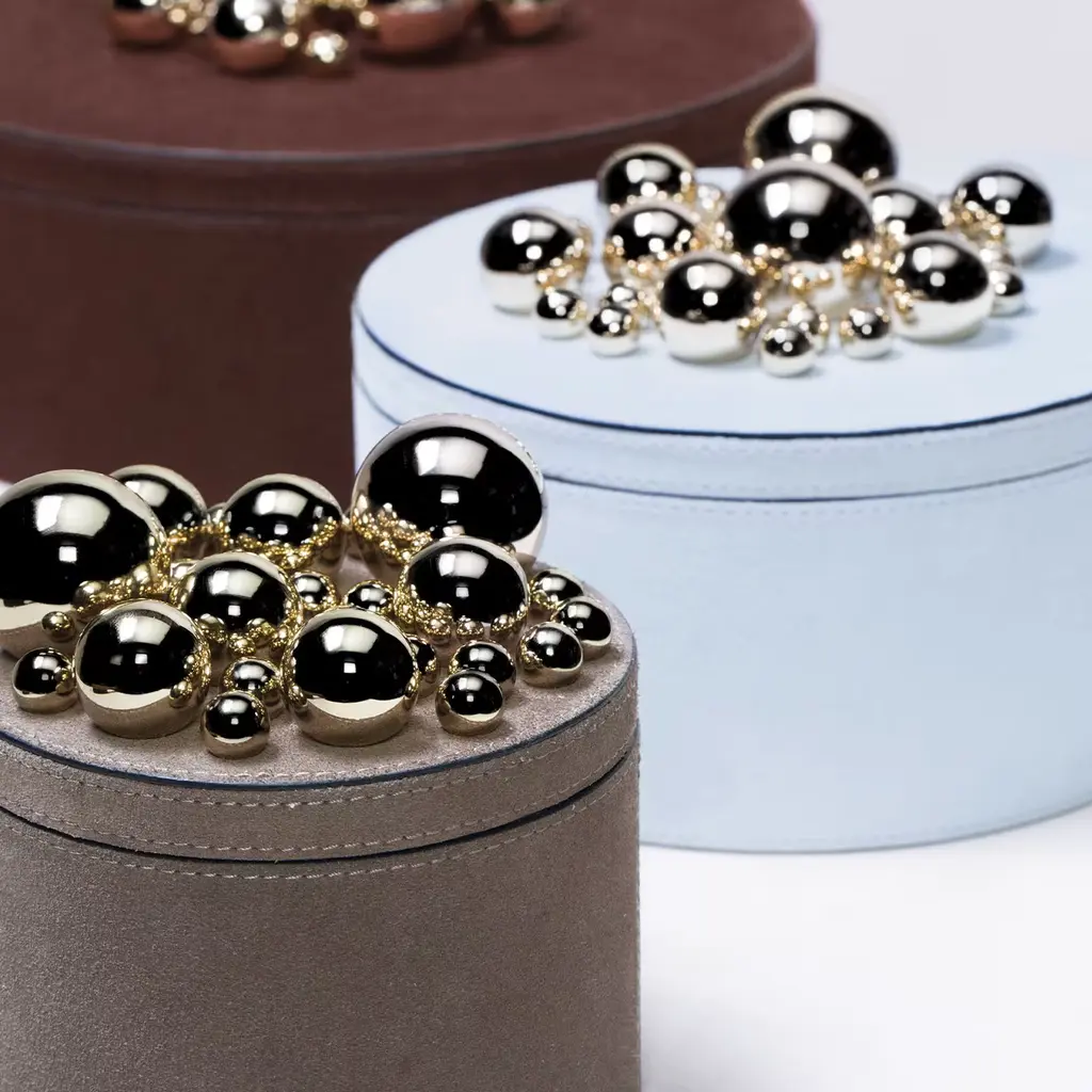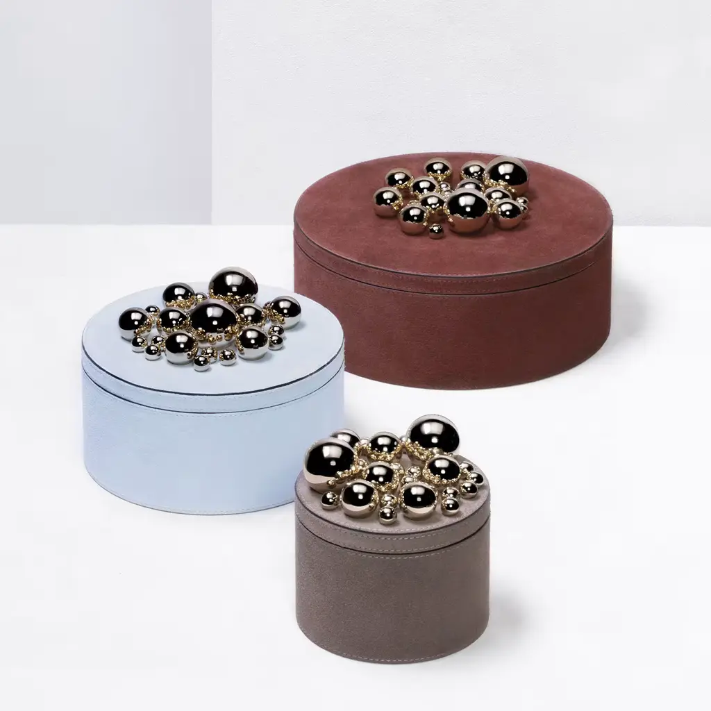 Flawlessly crafted of soft suede, this exquisite box will store treasured trinkets and jewels in style. The rich burgundy color perfectly complements the cluster of golden spheres that decorate the top of the removable lid, which represent the distinctive feature of the Champagne Sphérades designed by Stéphane Parmentier and inspired by the architecture of Etienne-Louis Boullée and the surrealist sculptures of Pol Bury.