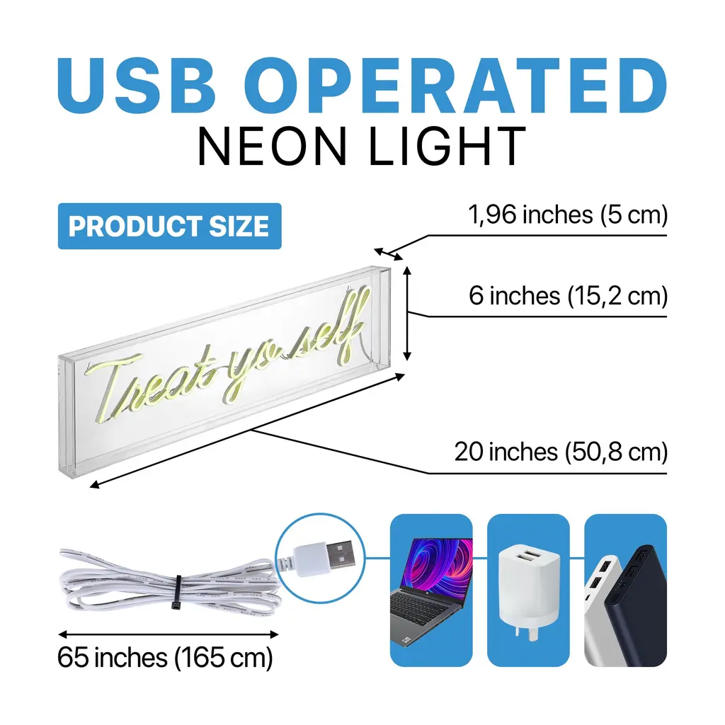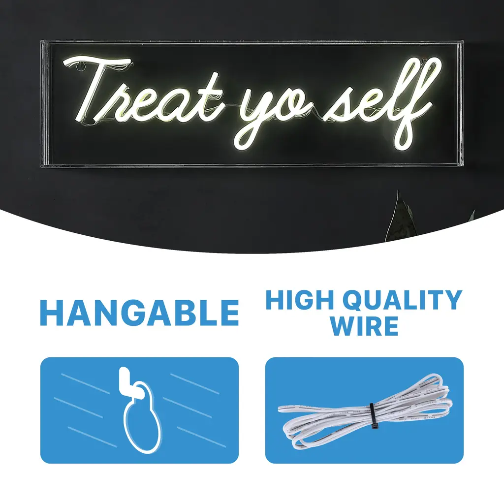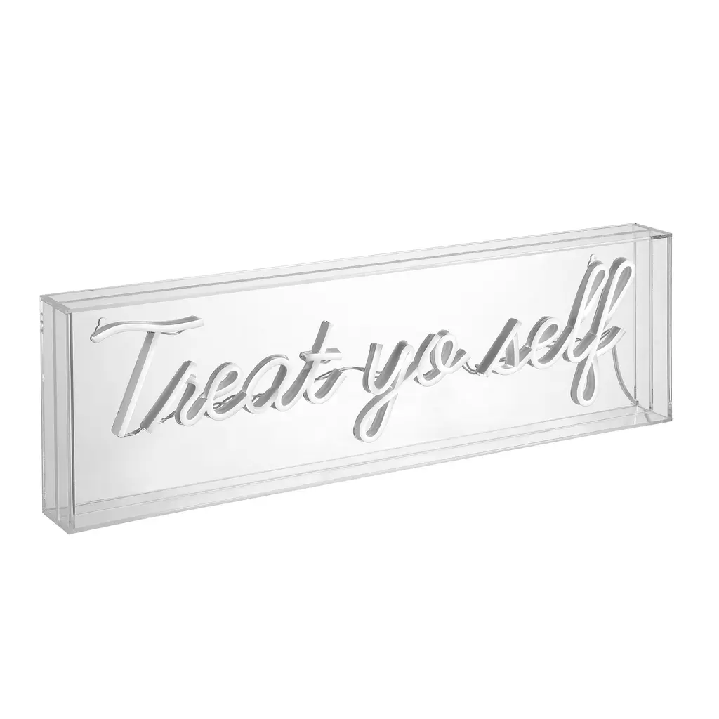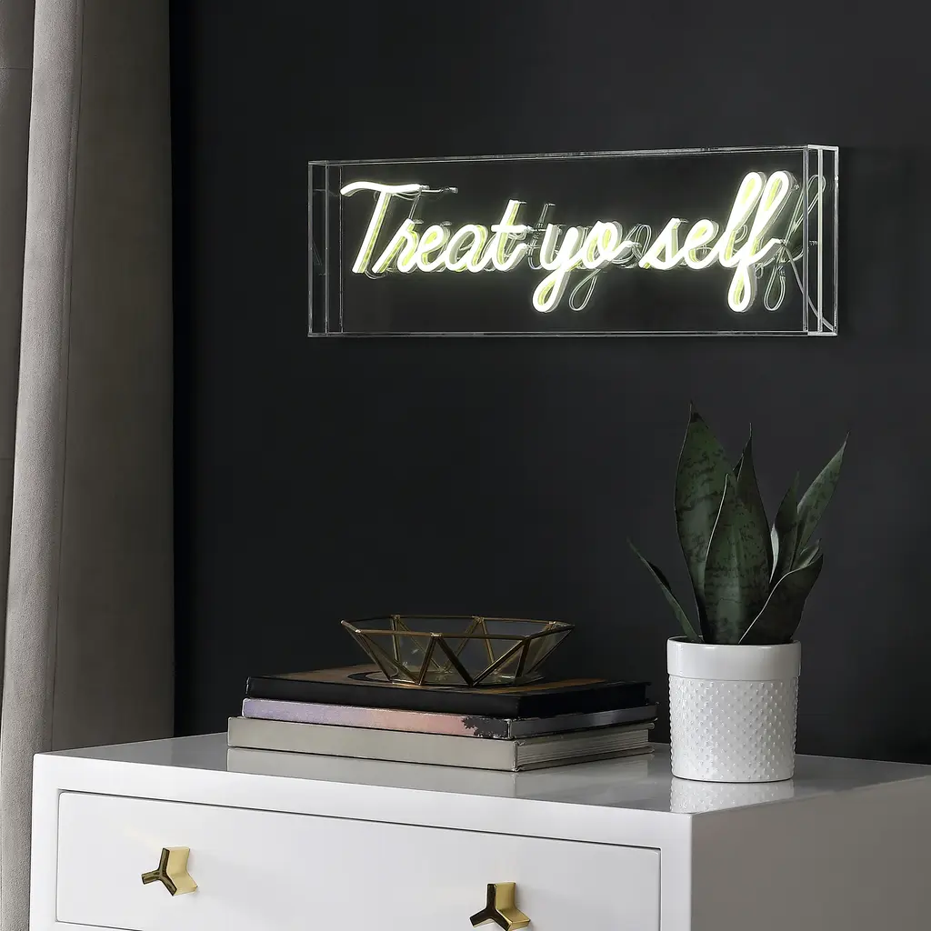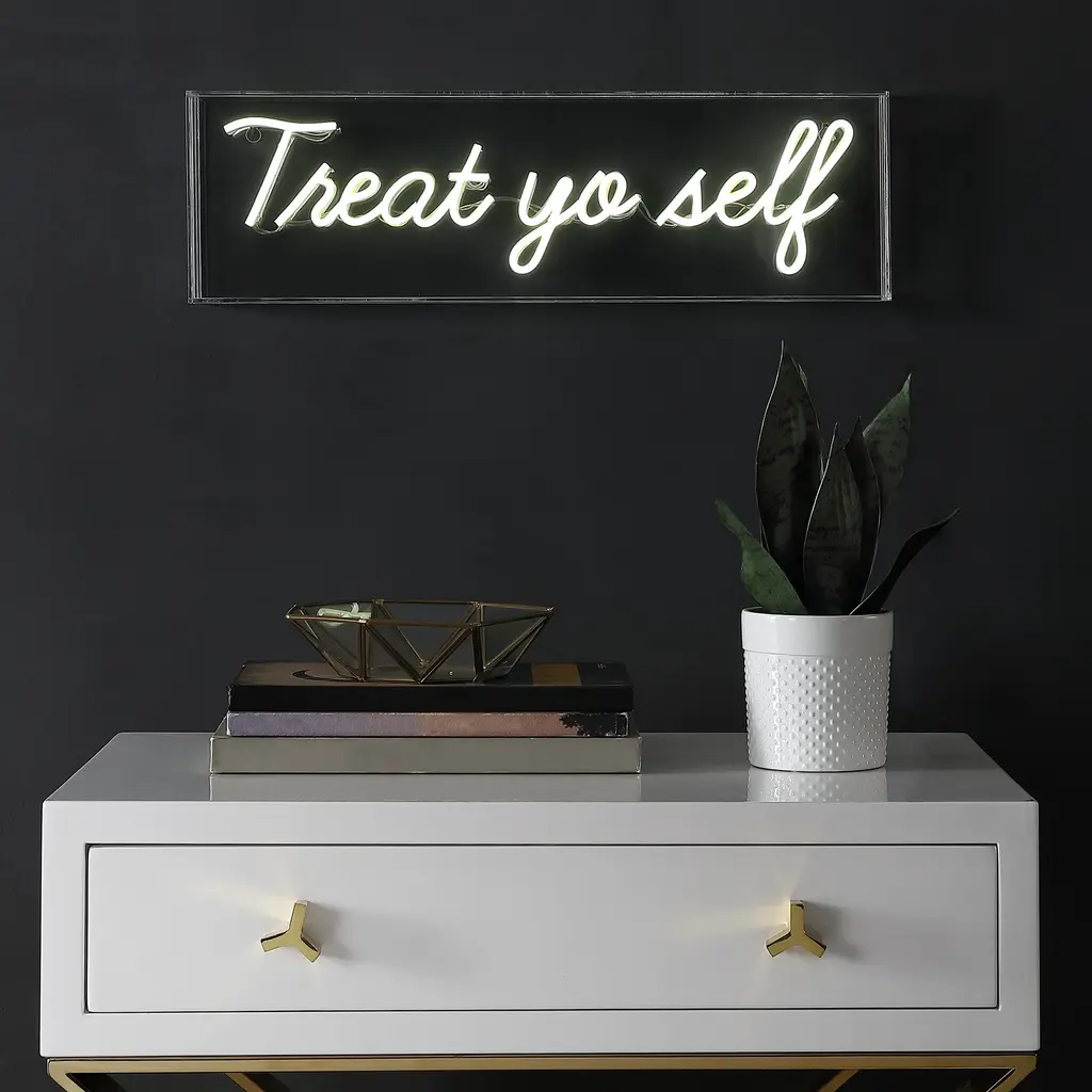 Bright neon makes a whimsical addition to your bookshelf or gallery wall. Use our Treat Yourself sign in the kitchen, or as inspiring bathroom wall art. Convenient, low-voltage USB power is perfect for a bedroom or dorm room.Features:Dimensions:About us:You see a lamp.We see a decorative work of art.A perfectly curved shade casts a dramatic shadow on a floor. Compatible with LED lightbulbs: as easy on the environment as they are on the eyes. The JONATHAN Y Lighting collection considers every detail from impeccably sourced materials to designer styling. And our prices are so attractive, we've transformed a functional necessity into a fashion accessory.JONATHAN Y Lighting - a fashion revolution in home decor.