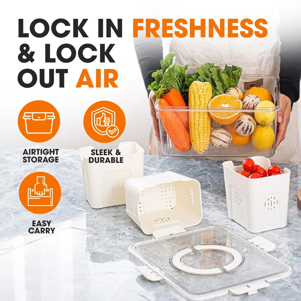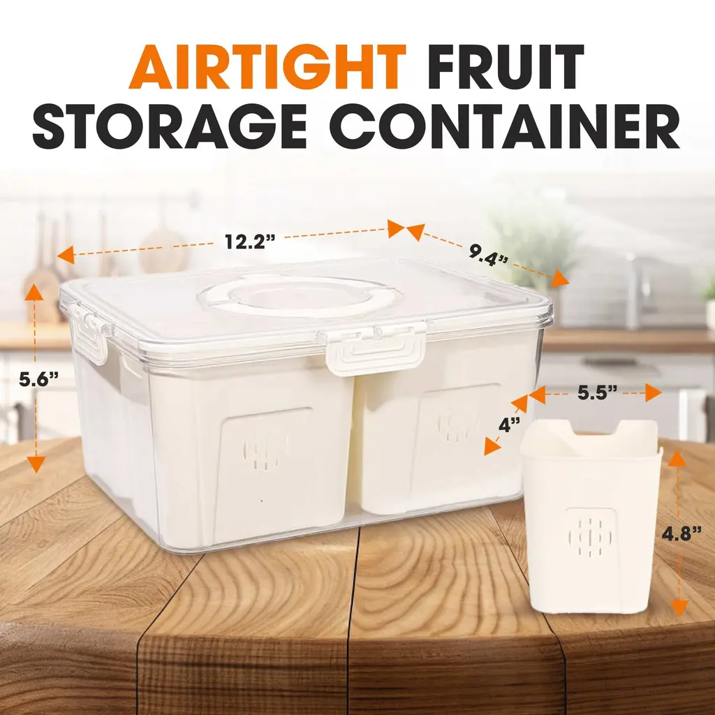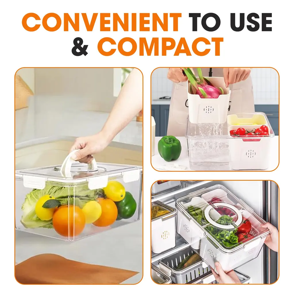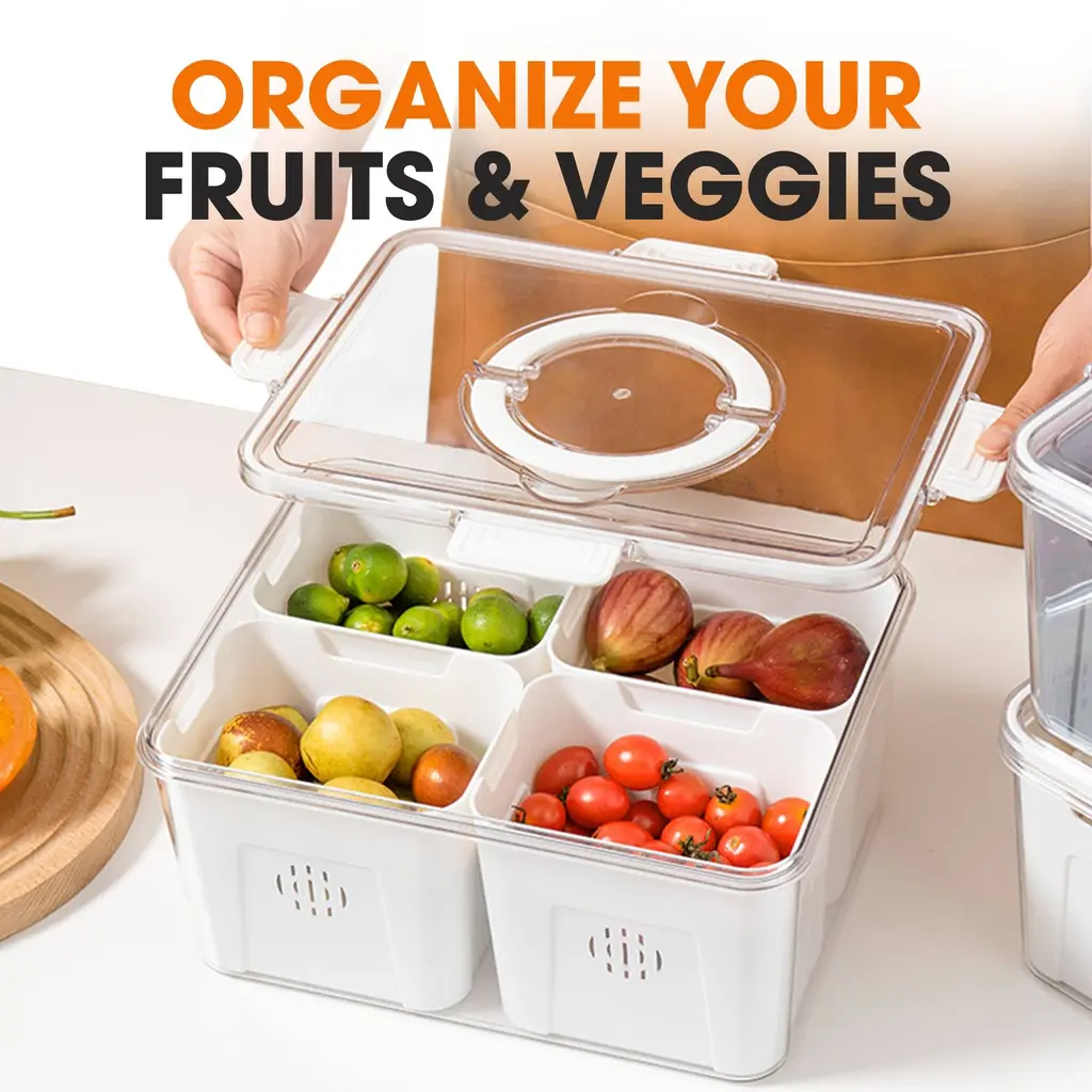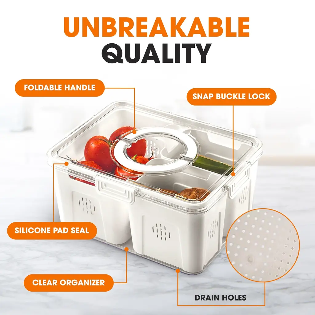 Keep your kitchen organized and your food fresh with the Cheer Collection 4 & 8 Compartment Food Storage Containers. Designed with airtight silicone seals, snap-lock buckles, and foldable handles, these containers provide a secure and convenient way to store produce, snacks, and meal prep items. The 4-compartment container is perfect for fruits and veggies, while the 8-compartment container offers versatile use for party snacks, cheese, and more. Each container includes removable colander-style baskets that simplify washing and draining produce, keeping your kitchen routines efficient. Stackable and compact, these food storage solutions maximize fridge and pantry space, making them an ideal choice for fresh and organized food storageVERSATILE COMPARTMENT DESIGN: Available in 4 and 8 compartments, these containers are perfect for storing fruits, veggies, snacks, and meal prep items without mixing flavors, keeping everything organized and freshAIRTIGHT SEAL FOR MAXIMUM FRESHNESS: Features food-grade silicone seals and snap buckle locks that ensure airtight storage, preserving the quality and freshness of your food and protecting it from air and moistureREMOVABLE BASKET DESIGN: Includes removable baskets that double as colanders, letting you rinse and drain produce directly, then store it in the same container for easy, hassle-free meal prepPORTABLE AND STACKABLE: Compact and stackable with a foldable handle for convenient transport, this organizer is refrigerator-safe and designed to maximize storage space in your fridge or pantryEASY TO CLEAN & DURABLE BUILD: Made of food-grade, BPA-free material that’s durable and easy to clean by hand; these containers provide a hygienic storage solution that’s safe for your fridge but not dishwasher-safeWonderful Features: