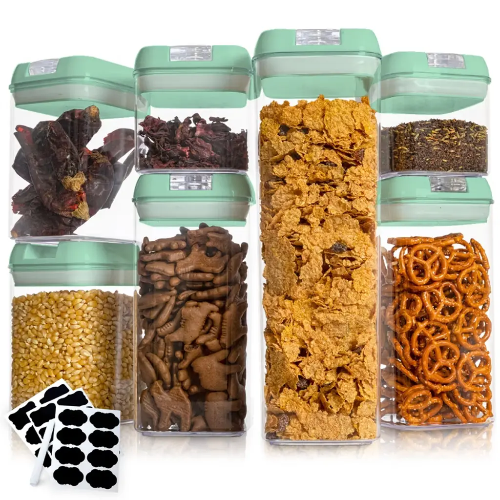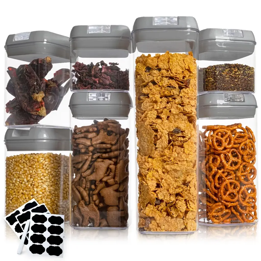 Elevate your kitchen organization with the Cheer Collection Black Food Storage Container Set. This 7-piece ensemble offers a diverse range of container sizes to accommodate all your food storage needs. Crafted from shatterproof, food-grade BPA-free plastic, these containers ensure your family's safety while keeping foods fresh and delicious. Efficiency meets style with our stackable design, optimizing your pantry space and bringing order to your kitchen cabinets. The airtight sealing mechanism locks in the freshness of cereals, pasta, snacks, cookies, flour, sugar, rice, beans, and more, extending their shelf life and reducing waste. Say goodbye to messy spills and hello to hassle-free access. The clear flip-top lids allow you to effortlessly identify the contents, while the wide-mouth design ensures quick and convenient retrieval of your stored items. Monitor food freshness with the included 24 reusable labels and a white erasable pen, keeping your pantry tidy and organized. Cleaning up is a breeze with our dishwasher-safe containers, allowing you more time to enjoy your freshly preserved foods. Our sleek white lids add a touch of elegance to your kitchen, seamlessly integrating functionality and aesthetics. Dimensions: Tall container (1.9 liters): 12.2 inches high x 4.17 inches wide x 4.17 inches deep Medium containers (1.2 liters): 8.07 inches high x 4.17 inches wide x 4.17 inches deep Small containers (0.8 liters): 6.1 inches high x 4.17 inches wide x 4.17 inches deep Mini containers (0.5 liters): 4.13 inches high x 4.17 inches wide x 4.17 inches deep